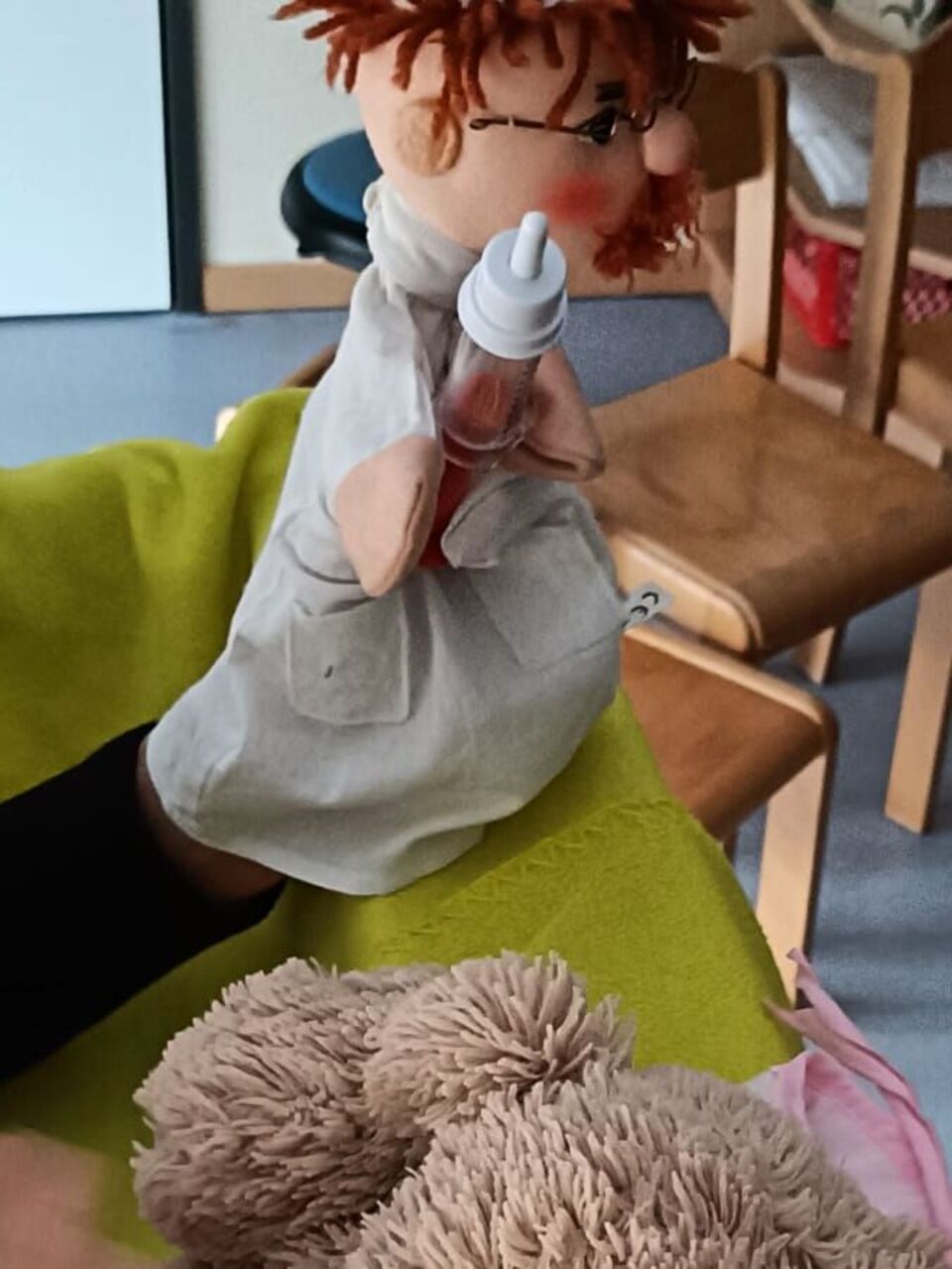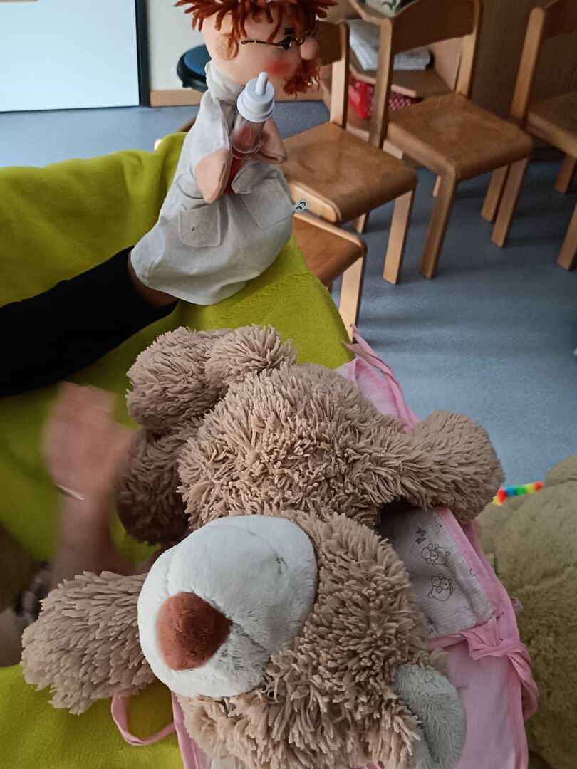 Aber o weh, ein Teddy fehlte. Doch Kasperle wusste was passiert war. Teddy "Brumbrum" lag krank im Bett und konnte nicht mitfeiern. Ganz schnell wurde der "Puppendoktor Pille" gerufen und nach einer genauen Untersuchung und einer kleinen Spritze, die "Brumbrum" tapfer aushielt, konnte auch er an der großen Party teilnehmen. Mit freudigen Augen bei den Kindern und Teddys und einer tollen Tanzrunde fand die Party ein schönes Ende.