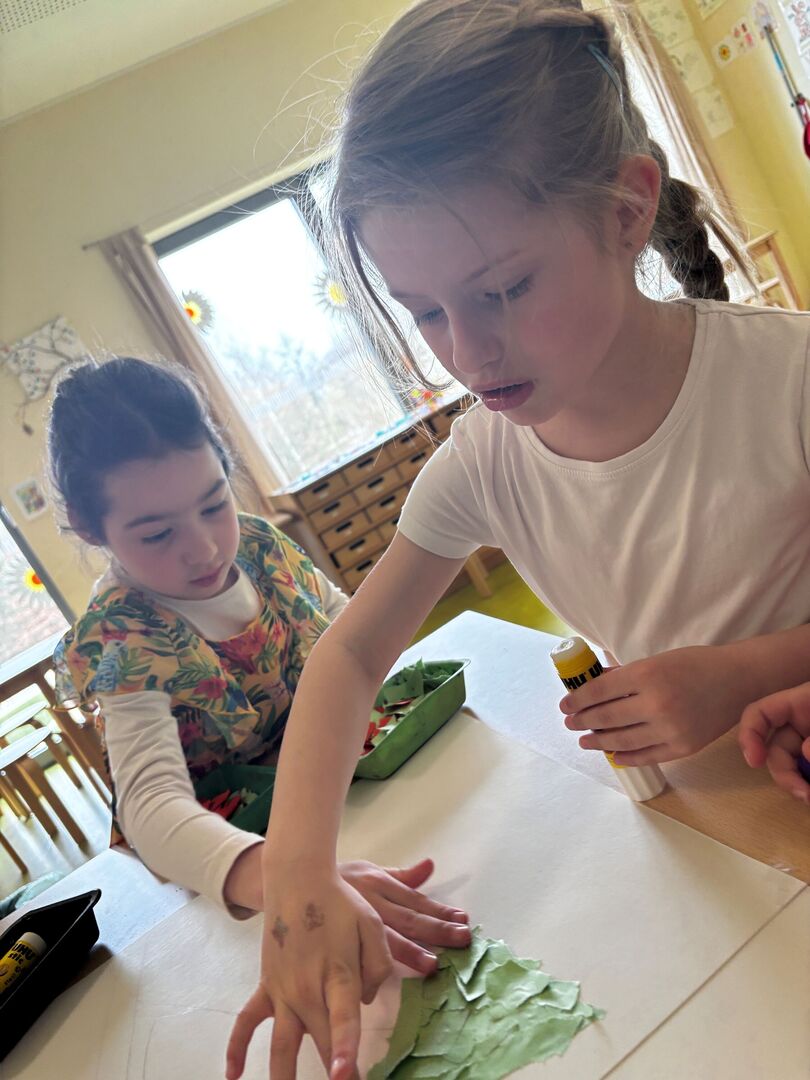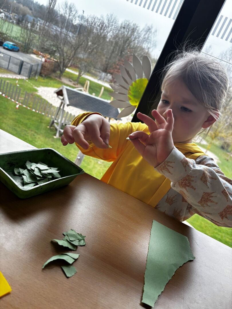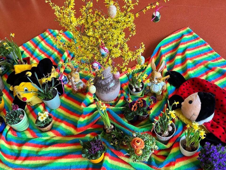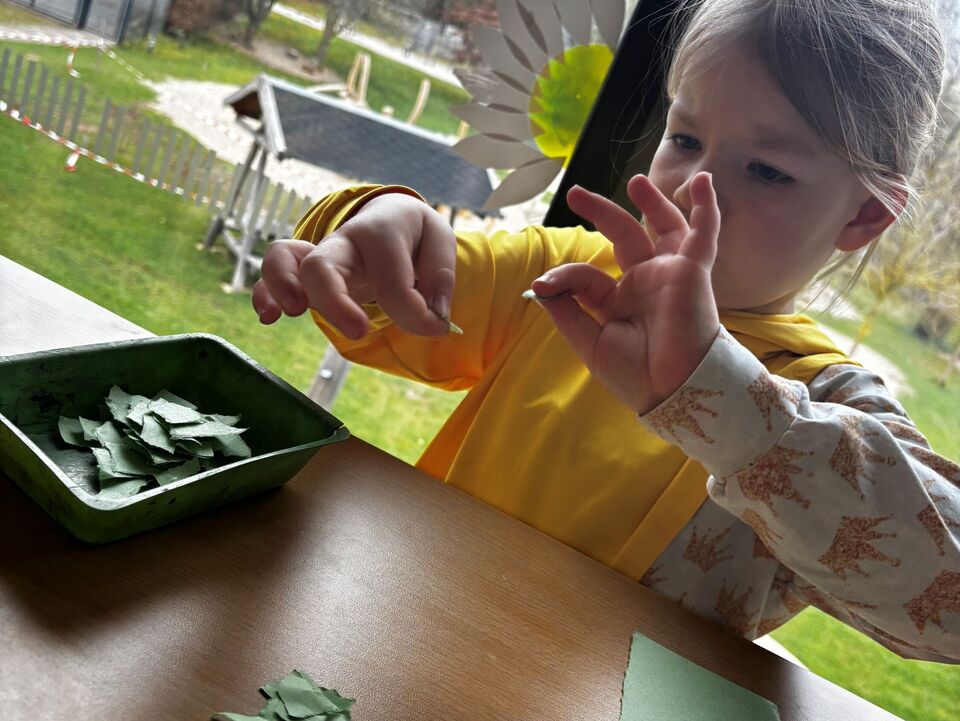 Auch in den anderen Bereichen fand der Frühling Einzug. Dabei entstanden mit Farbe und Papier die farbenfrohesten Ergebnisse, über die sich die Kinder nun täglich erfreuen.