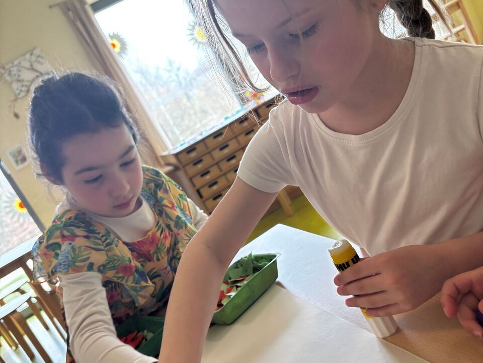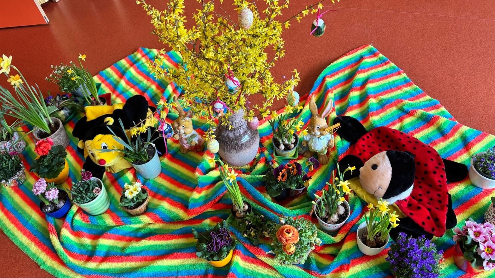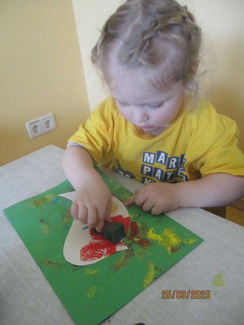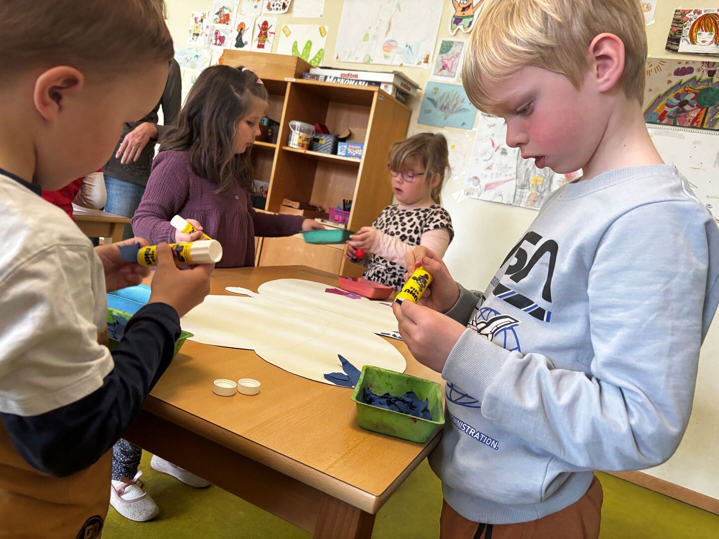 Auch in den anderen Bereichen fand der Frühling Einzug. Dabei entstanden mit Farbe und Papier die farbenfrohesten Ergebnisse, über die sich die Kinder nun täglich erfreuen.