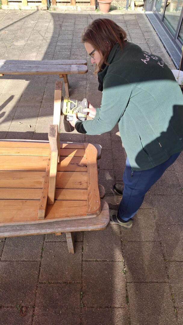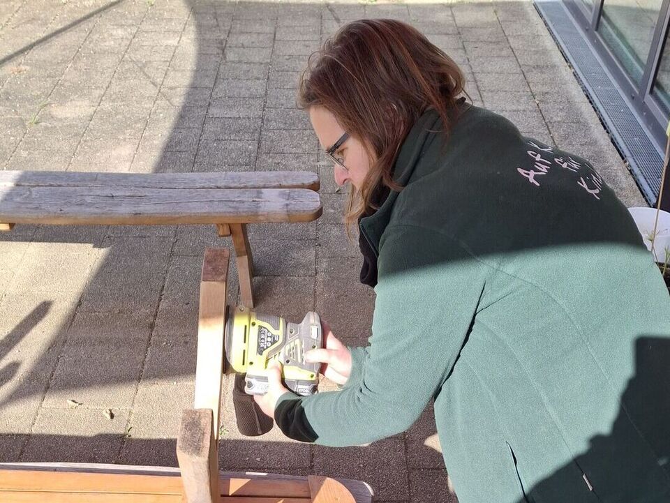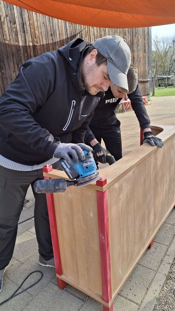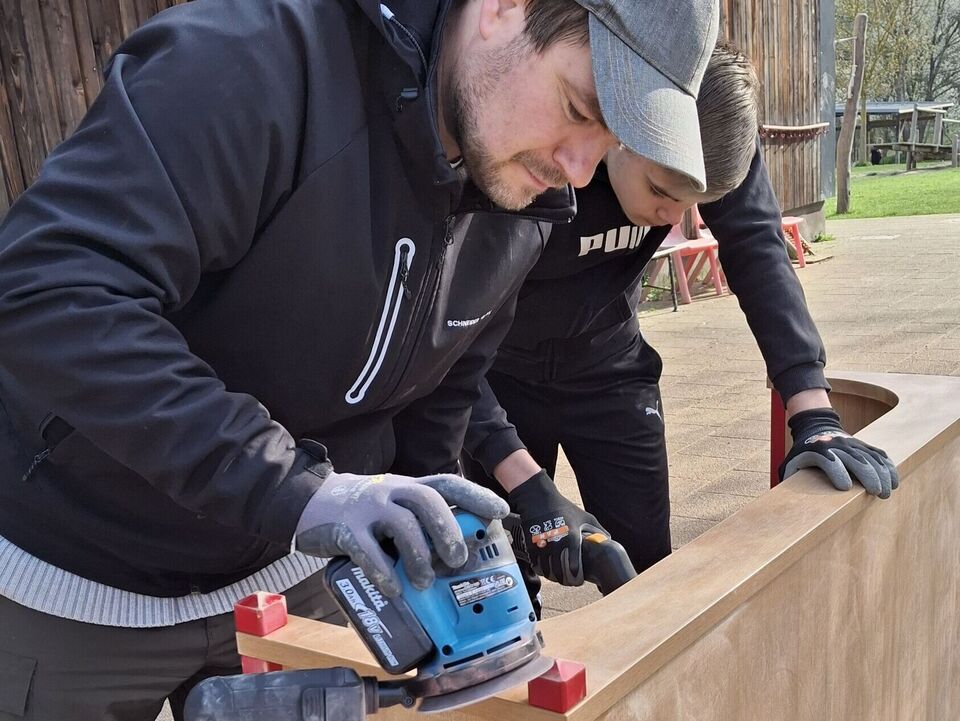 Einer besonderen Aufgabe widmeten sich Eltern, die eine Holzküche in eine outdoorfähige Matschküche für den Krippenbereich verwandelten. An dieser lässt sich nun ein wunderbarer Sandkuchen oder leckerer Gänseblümchen-Tee von den Kleinsten der Einrichtung zubereiten.