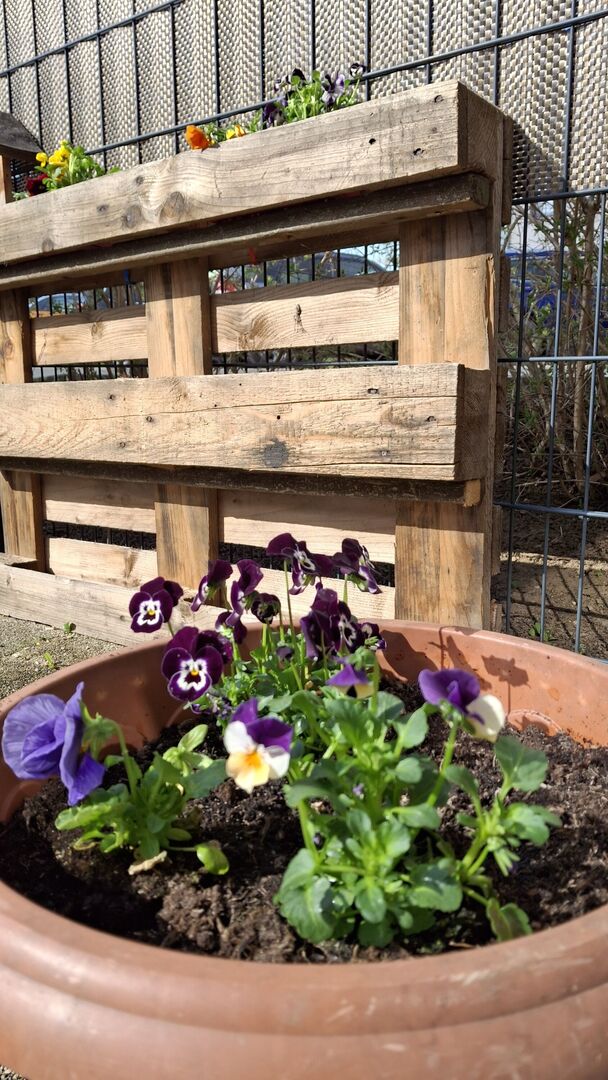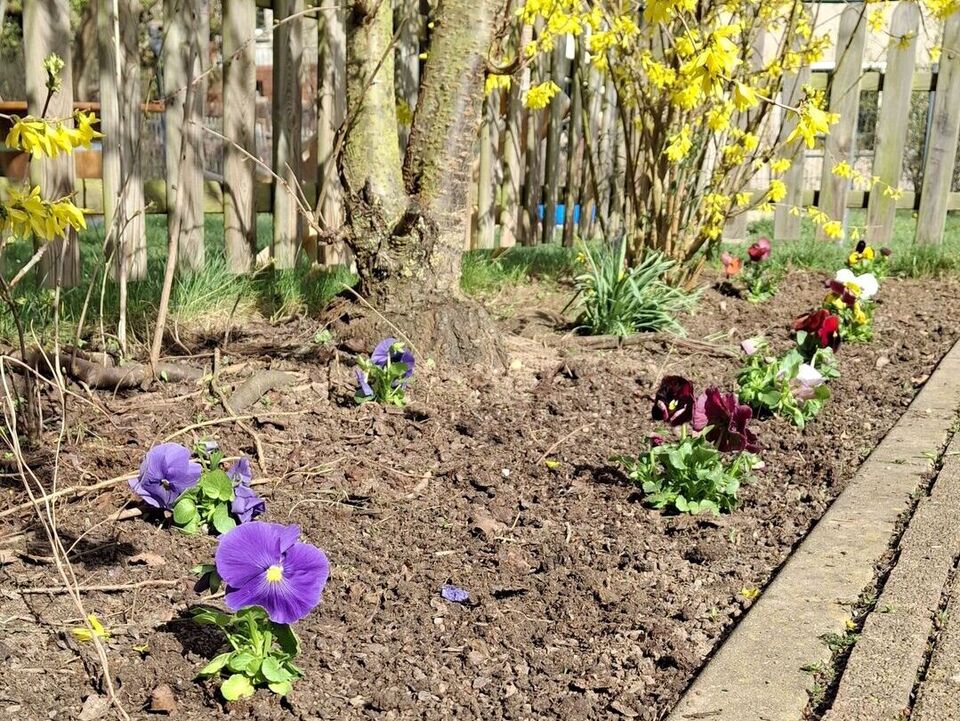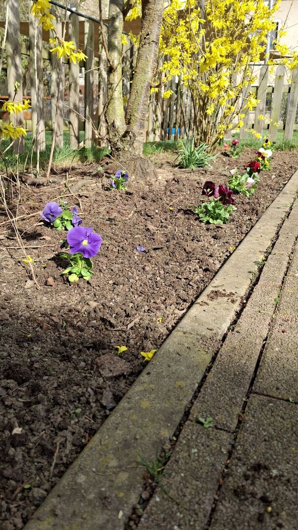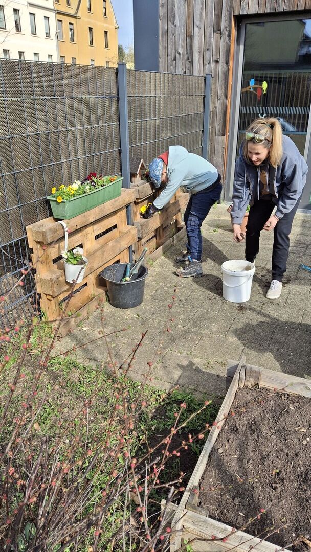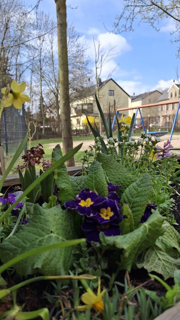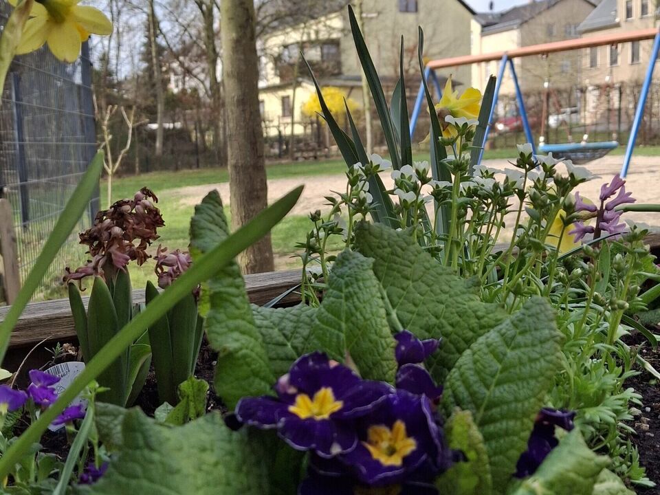 Die Spuren der vergangenen Herbst-/ Winterzeit wollten beseitigt werden. Dazu gehörten neben dem Entfernen von Unkraut und Laub auch das Bepflanzen der Hochbeete und des Beetes am Eingangsbereiches mit Frühblühern.