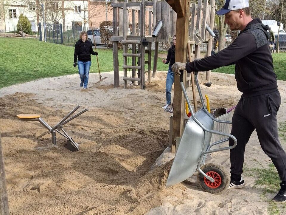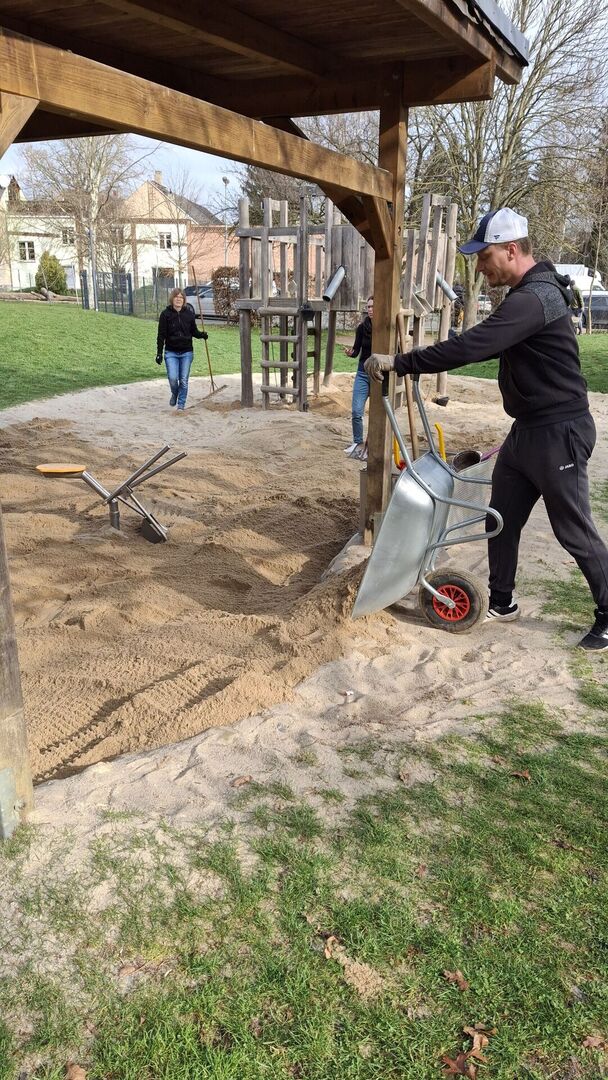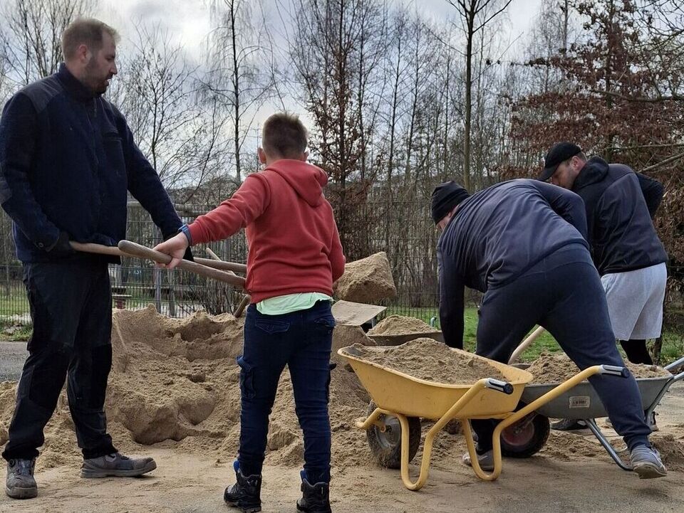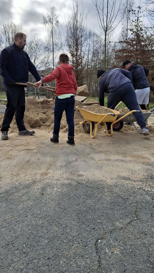 Insgesamt 10 Tonnen Sand warteten darauf mit Schaufel und Schubkarre in den riesigen Sandkasten umgefüllt zu werden. Mit Rechen hieß es dann diesen zu verteilen, welches innerhalb kürzester Zeit erledigt war.