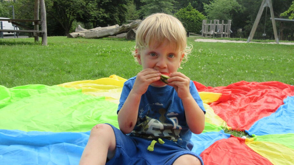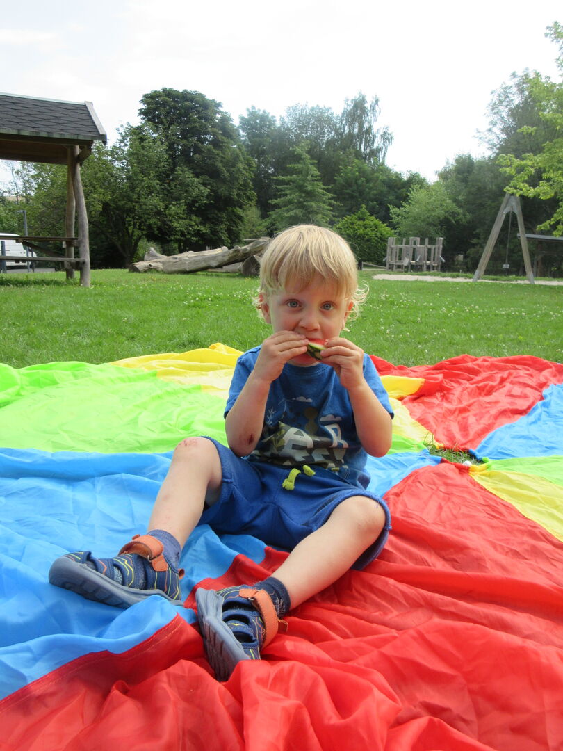 Bei Musik, Tanz und Spielen mit bunten Luftballons und dem großen Schwungtuch, sowie Wasserspaß im Pool erlebten die Kinder einen tollen Vormittag. Zum Abschluss gab es auf Wunsch der Kinder ein leckeres, abwechslungsreiches Picknick im Garten.