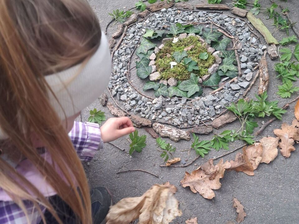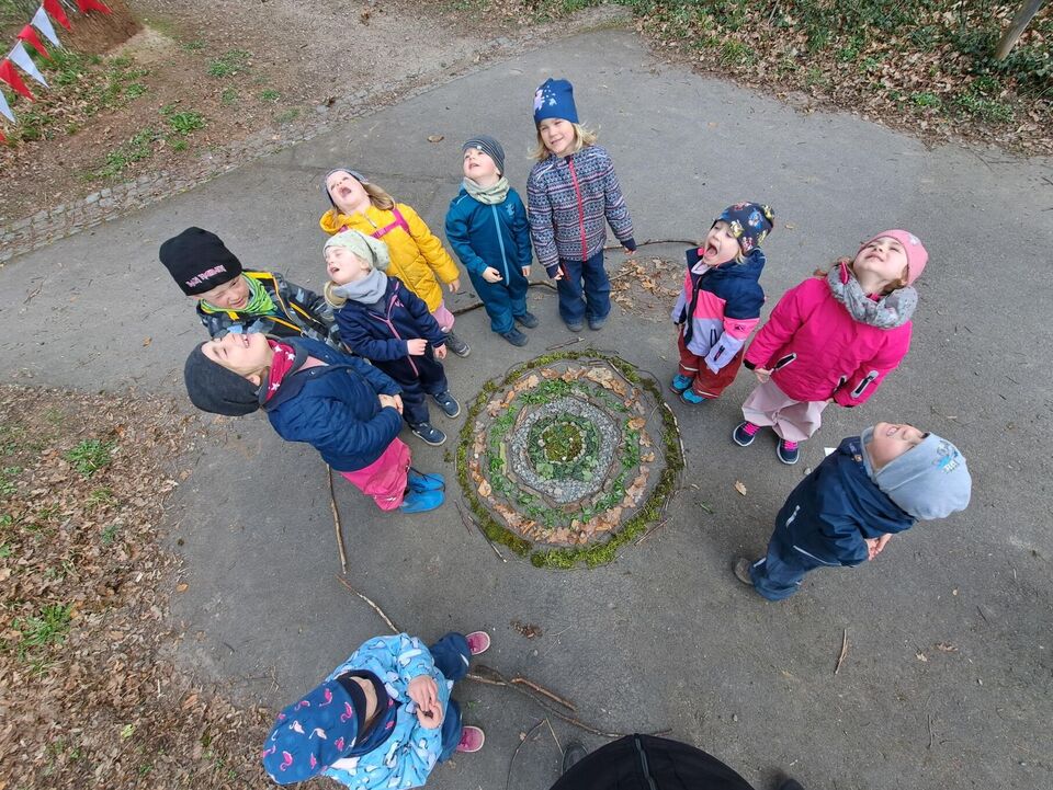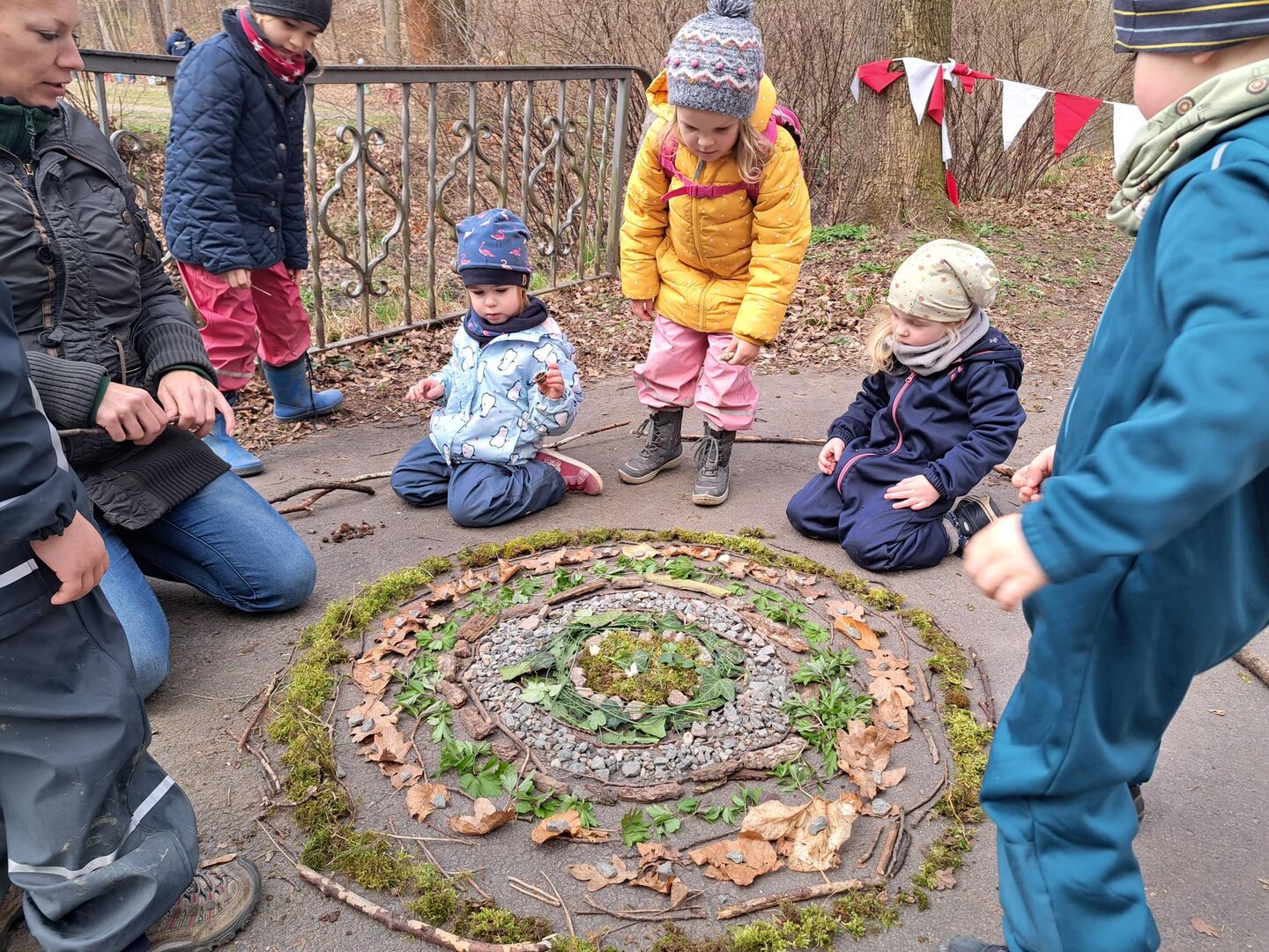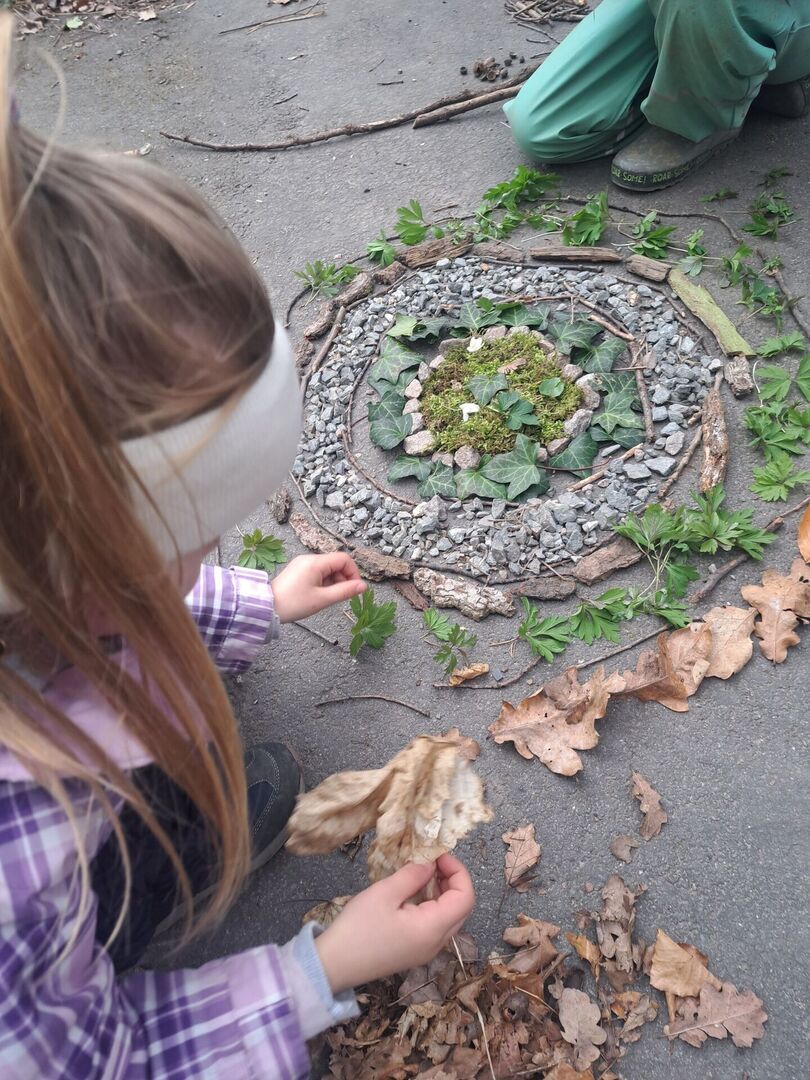 An ganz vielfältigen Stationen wurde danach im wunderschönen Sahnpark mit selbst gesammelten Naturmaterialien gebastelt und es entstand ein großes Natur-Mandala. Es wurde geturnt, gesammelt, geklebt, gestaunt und vieles mehr.