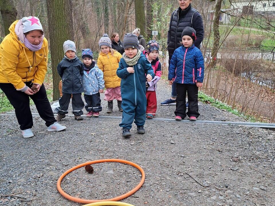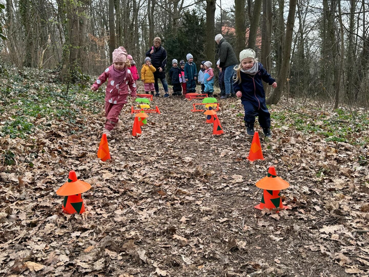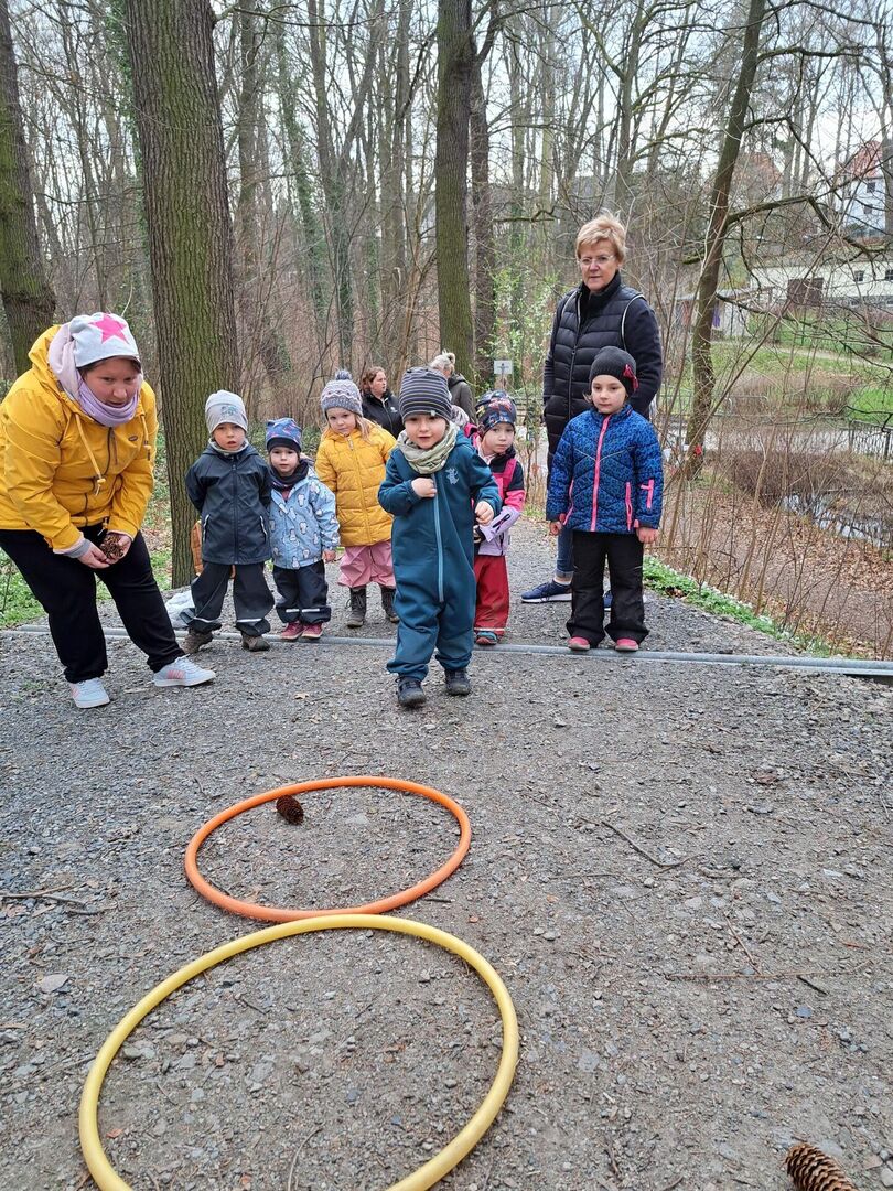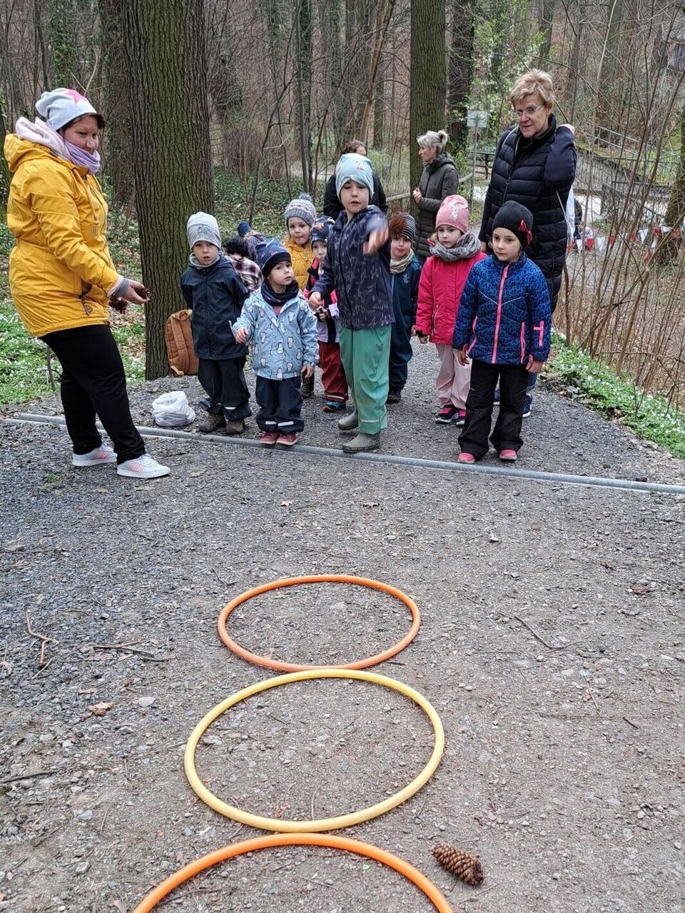 Die Kinder der Kinderoase begrüßen den Wald mit dem Bewegungslied "Aufrecht wie ein Baum"