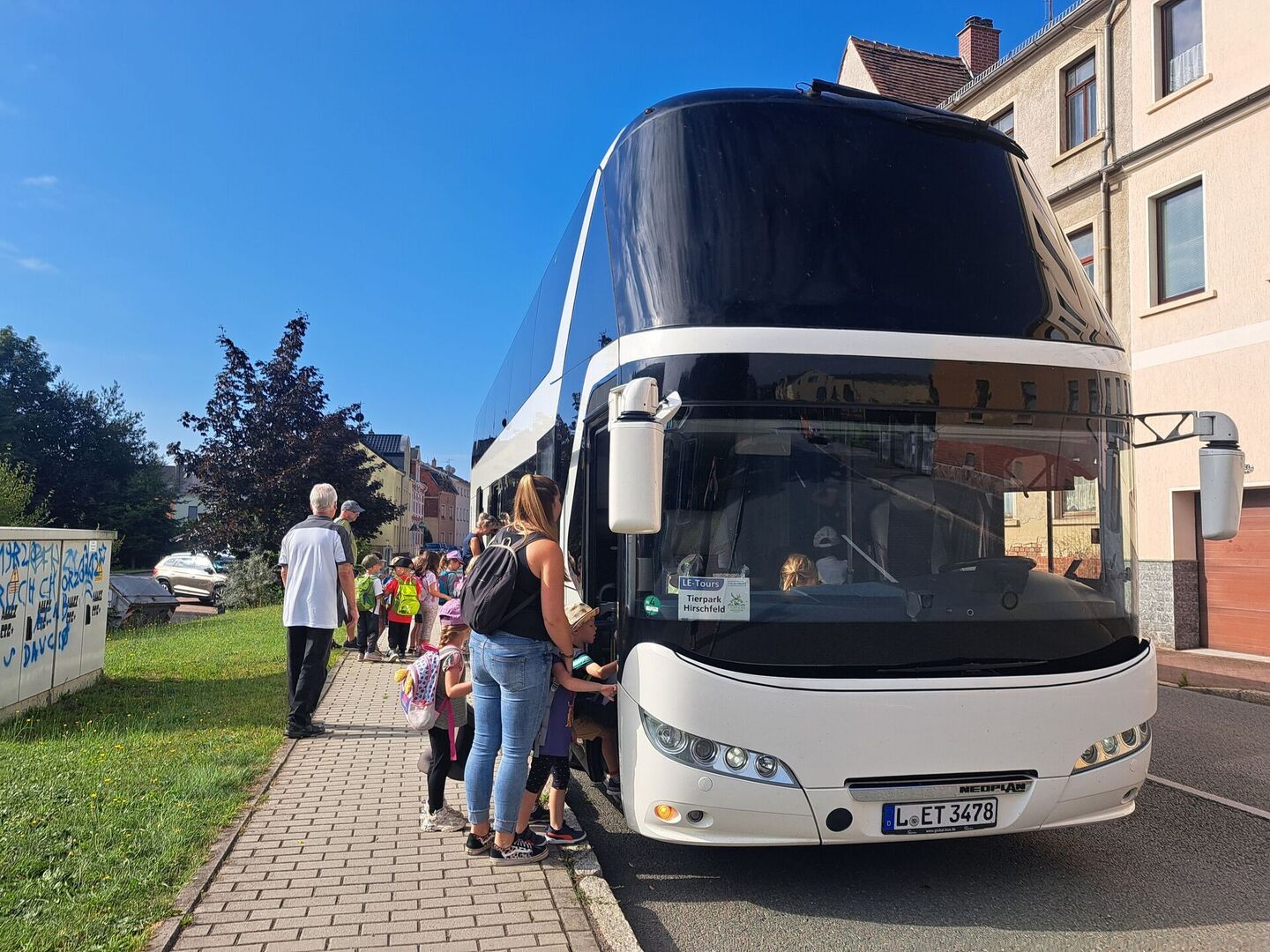 Die Reise begann schon sehr aufregend mit der Fahrt in einem modernen Doppelstock-Bus, in welchem nicht nur 56 Kinder und 14 pädagogische Fachkräfte sondern ein 6-Sitzer, ein Krippen-, Zwillings- und Bollerwagen seinen Platz fanden. Herzlichen Dank an den tollen Busfahrer Toni, dem es mit unglaublich viel Geduld und Kreativität gelang, unser gesamtes Gepäck sicher zu verstauen.