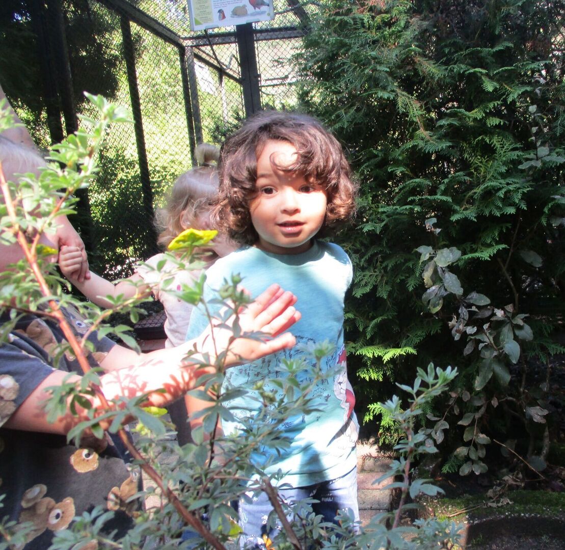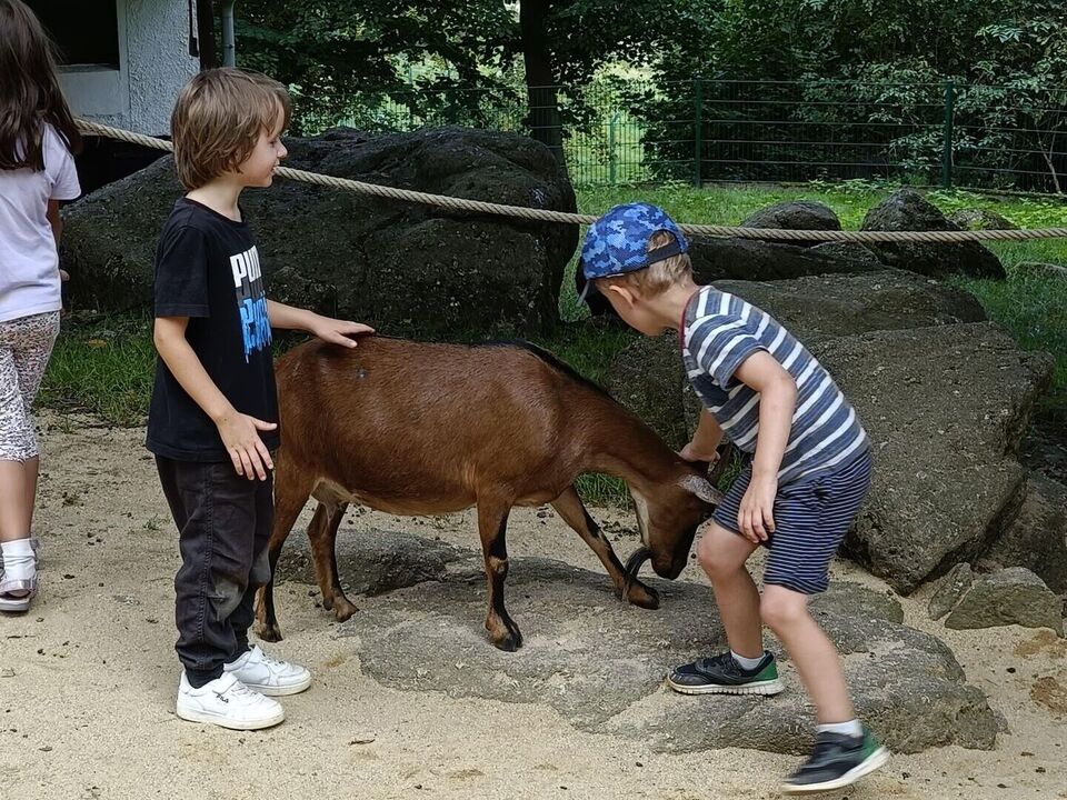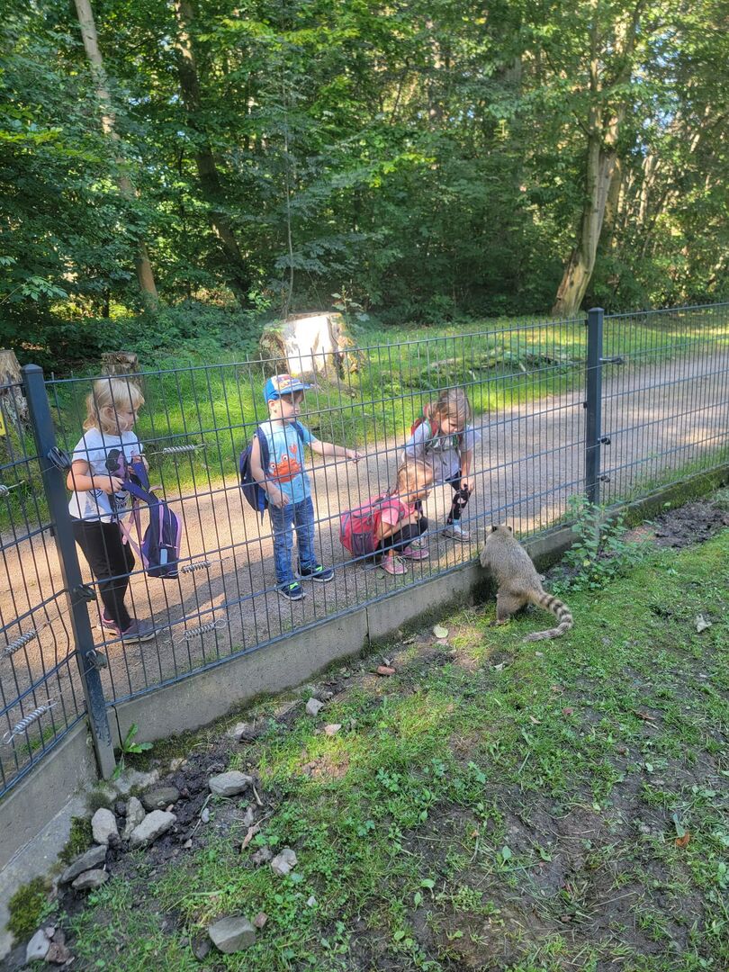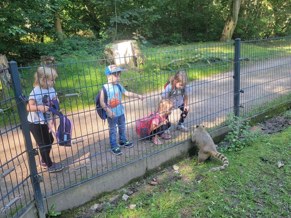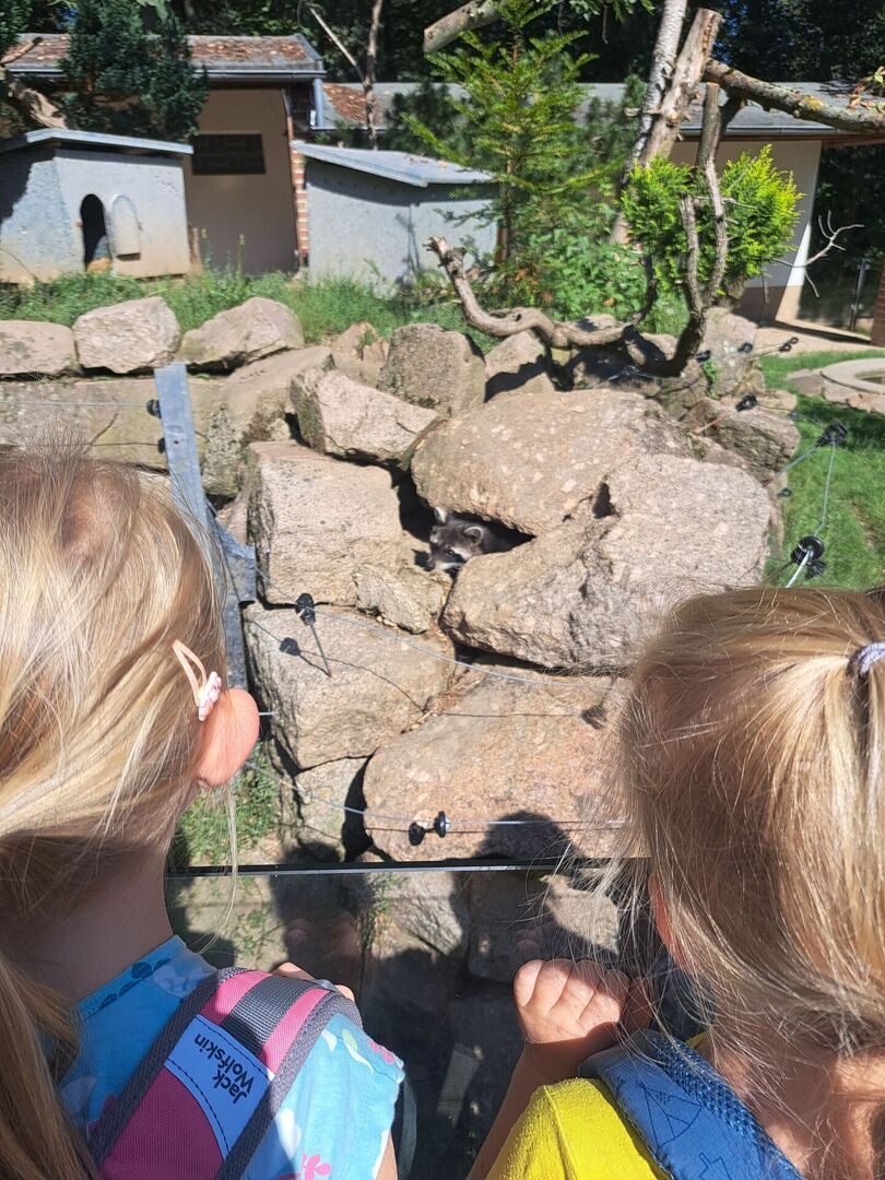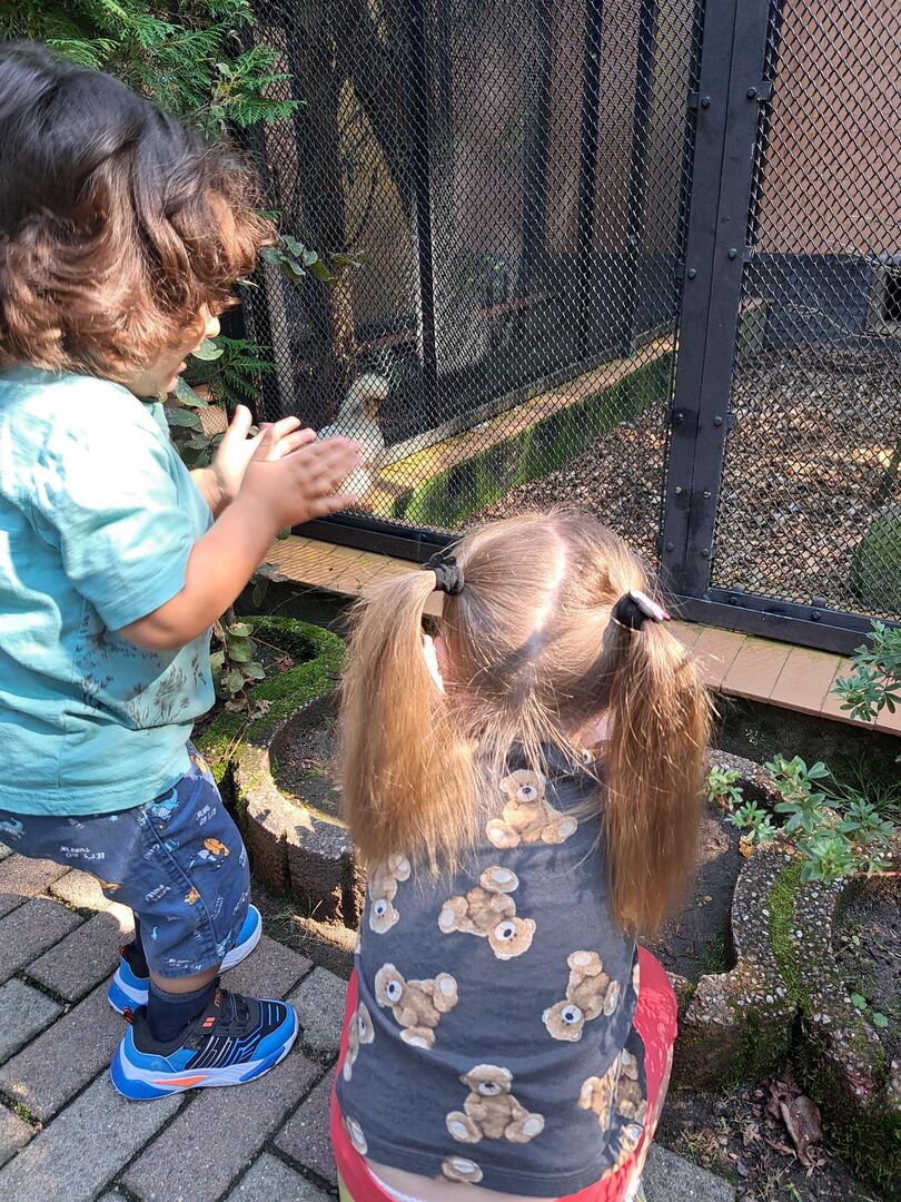 Nach der Ankunft erkundeten die Kinder mit den Erziehern und Erzieherinnen bei herrlichem Sonnenschein in mehreren Kleingruppen den Tierpark. Bei jedem Gehege wirkten unzählig viele Eindrücke auf die Kinder ein und (fast) jedes Tier wurde ausgiebig bestaunt. Dank der zahlreichen Infotafeln lernten nicht nur die Kinder spannende Besonderheiten der Tiere, wann z.B. das friedlich in der Sonne liegende Stachelschwein seine Stacheln einsetzt. Die beiden Emus kommunizierten mittels lauter Trommelgeräuschen mit uns, welche erstaunlicherweise im Hals produziert wurden. Wir bestaunten zahlreiche Vögel mit teilweise sehr lustigen Namen wie „Der lustige Hans“ und kamen aus dem Staunen gar nicht mehr heraus.