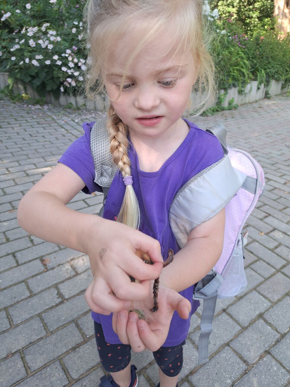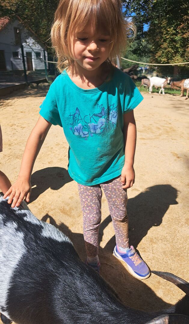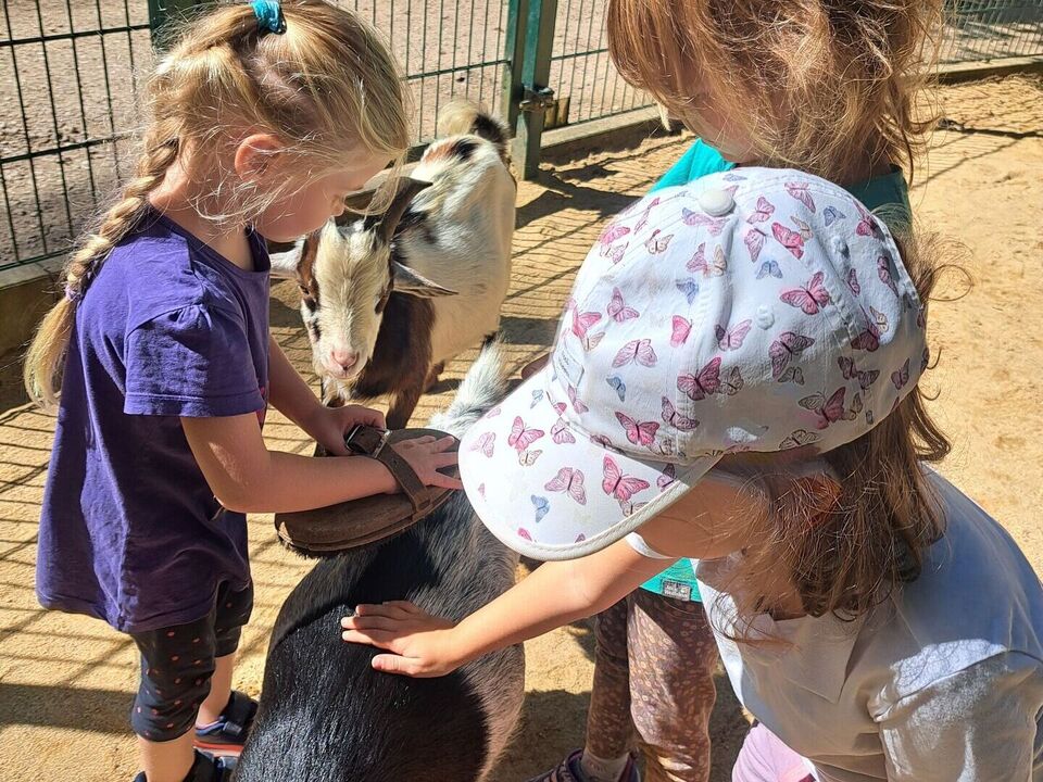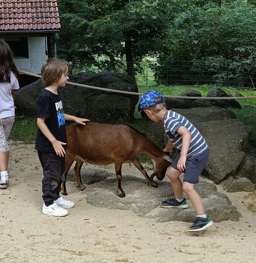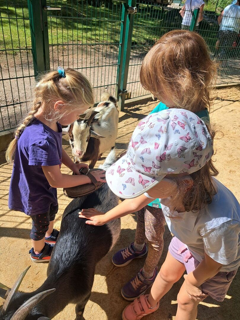 Das unsere Kinder einen großen Respekt vor allen Lebewesen und zur Natur haben zeigte sich sehr oft in den interessierten Fragen und dem liebevollen Umgang mit den Tieren in den beiden Streichelgehegen. Sowohl die Minischweine als auch die Ziegen erhielten unzählig viele Streicheleinheiten. Aber auch ein Regenwurm, welcher sich auf dem gepflasterten Gehweg verlief, wurde von Louise gerettet und liebevoll an einen schattigen Platz unter einen Busch gebracht.