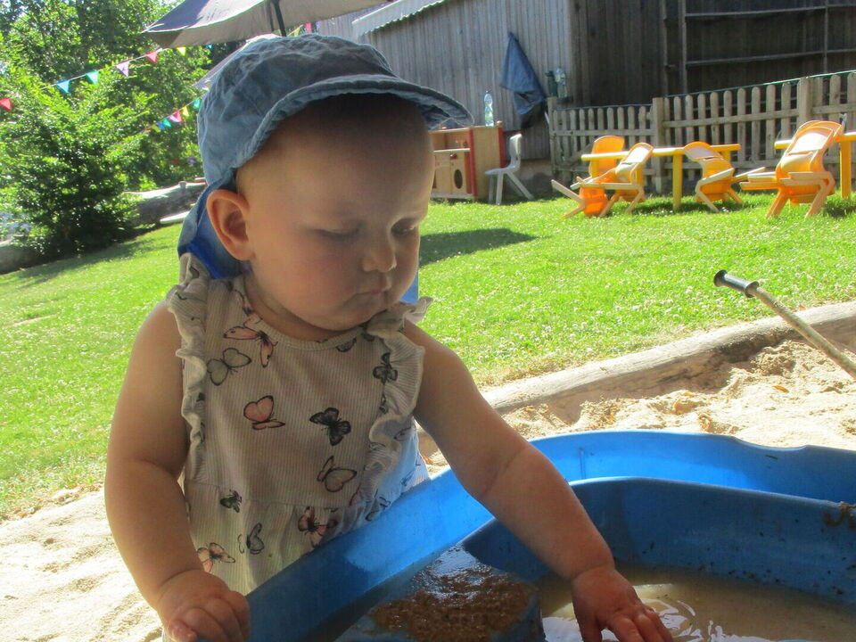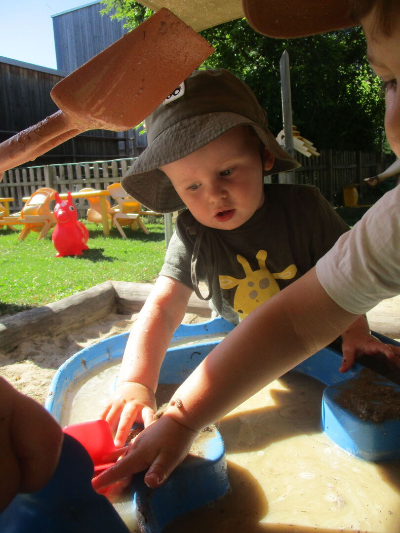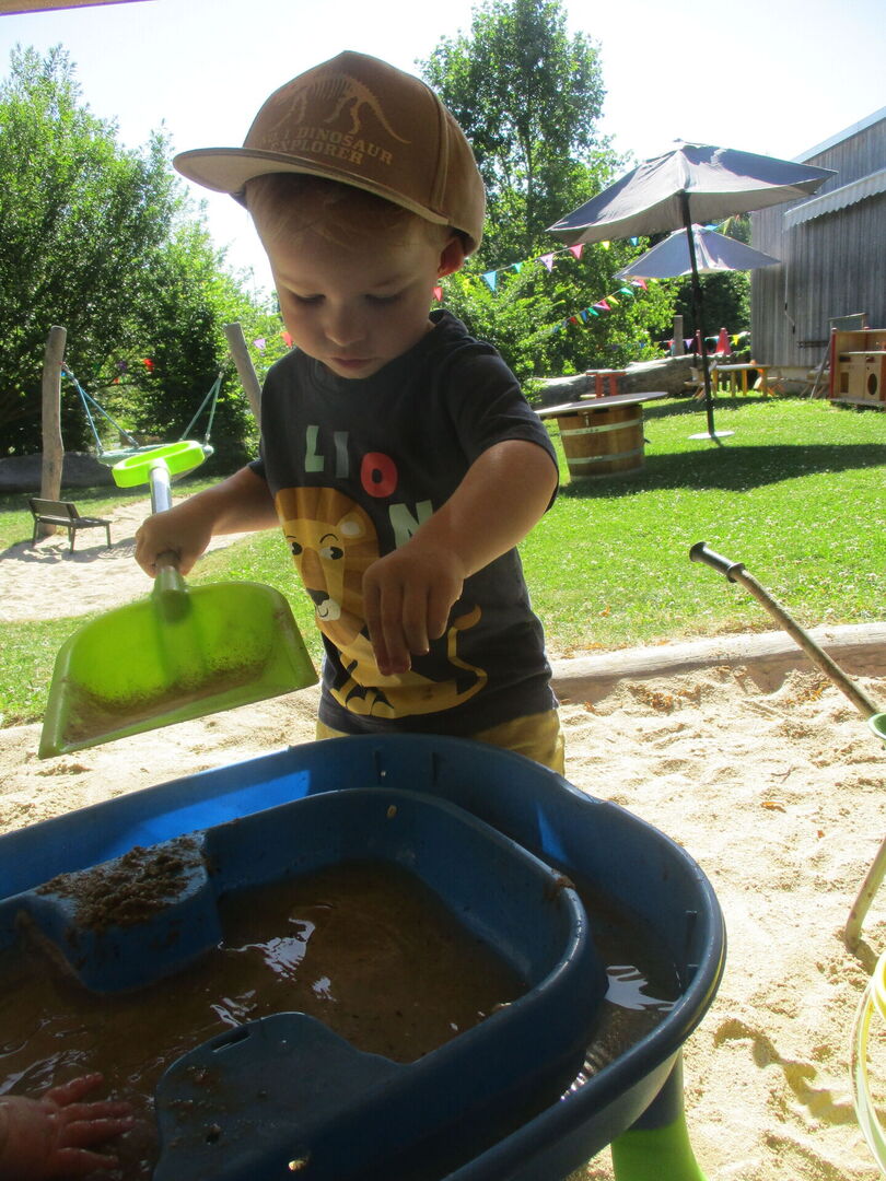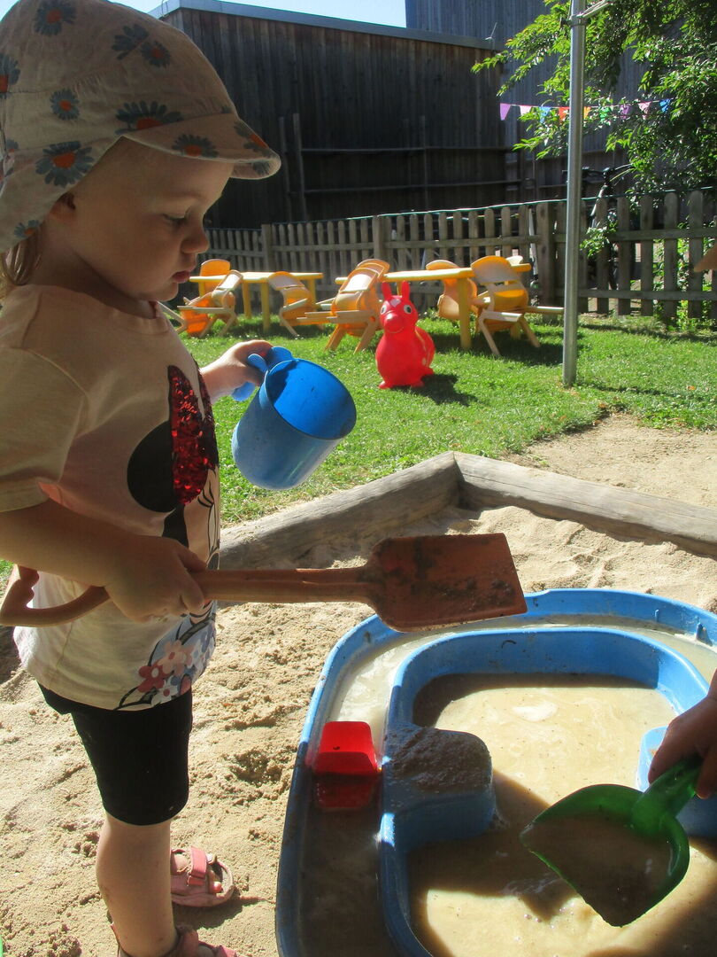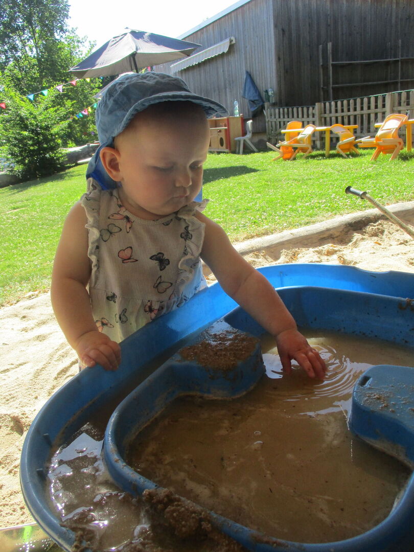 Mit allerlei Wasser und Sand ließen die Krippenkinder ihrer Fantasie und ihrem Feingefühl freien Lauf. Das Matschen im nassen Sand, Backen und Kochen mit kleinen Sandförmchen oder einfach nur das Beobachten des Wassers wie es im Sand versickert, faszinierte die Kinder sehr. Mit den Händen Wasser und Sand zu Matsch vermengen und diesen durch die Finger zu drücken war ein tolles Erlebnis für die taktile Wahrnehmung. Noch dazu war der nasse Sand auf der Haut eine willkommene Abkühlung an diesen heißen Sommertagen.