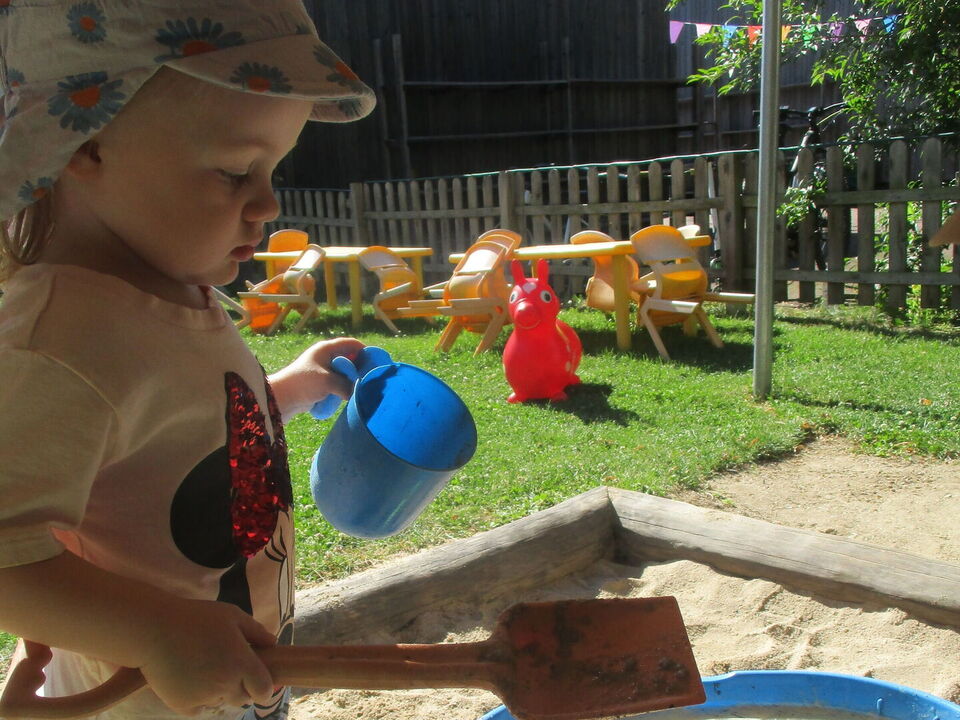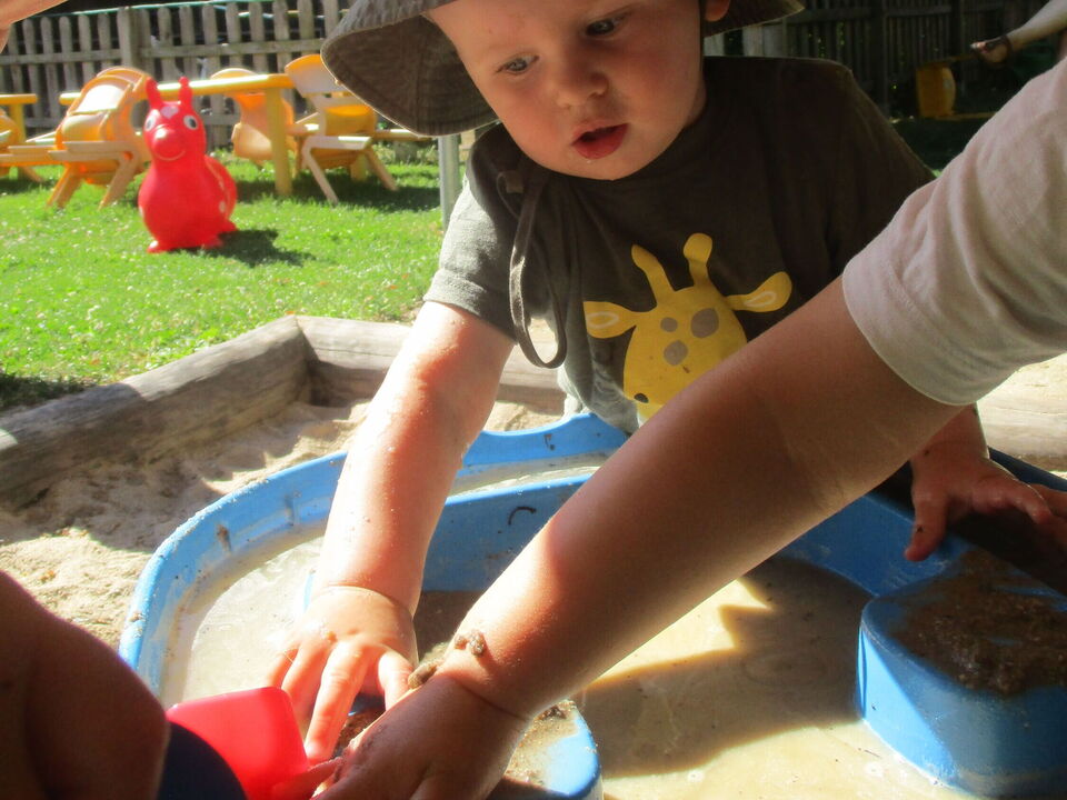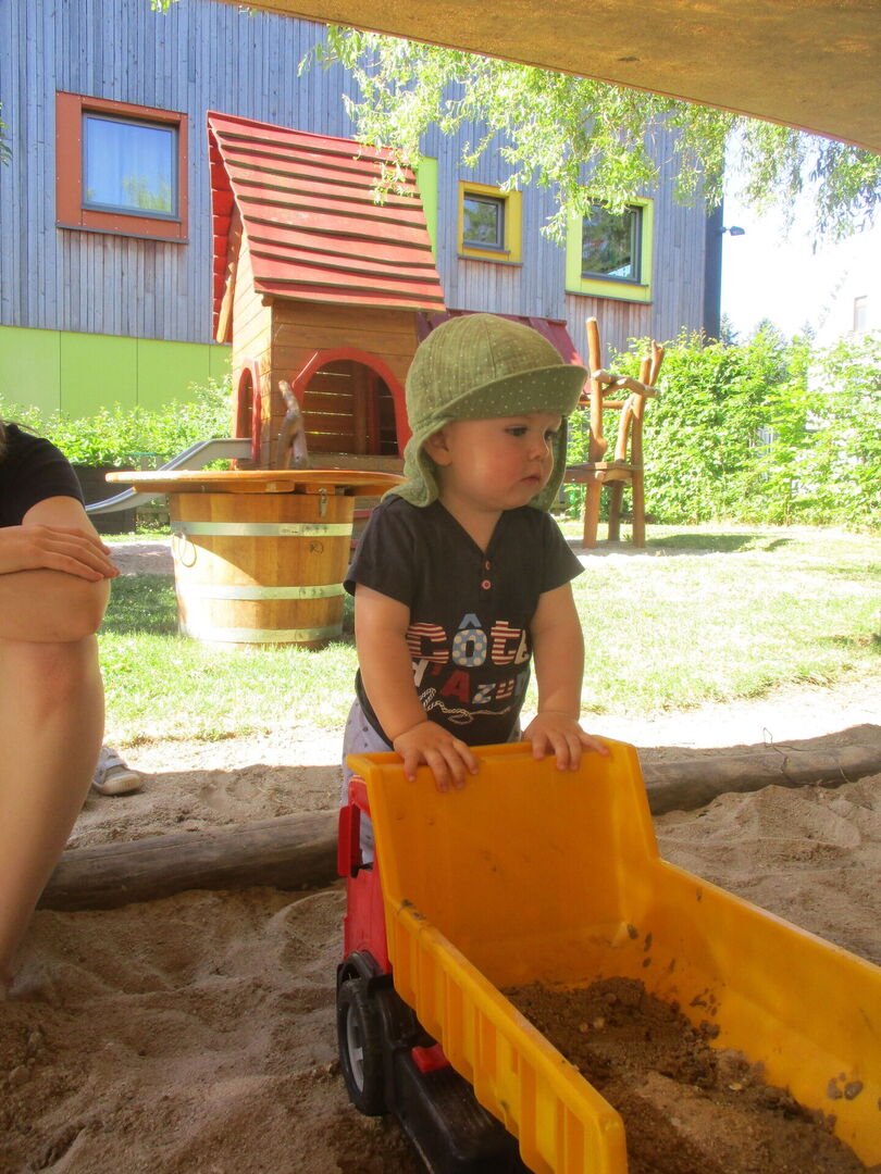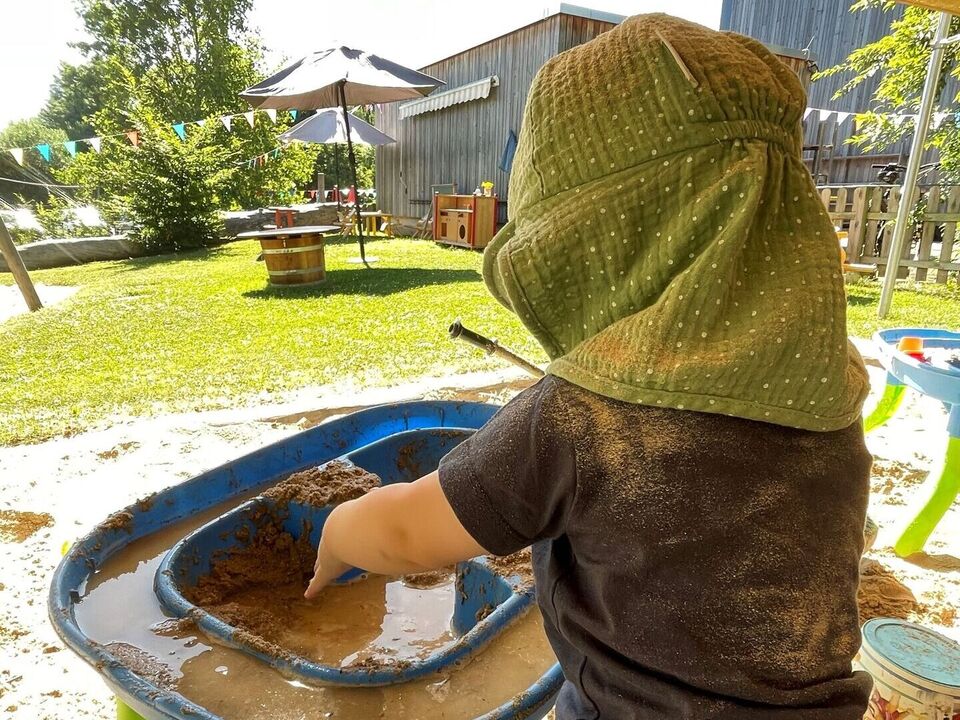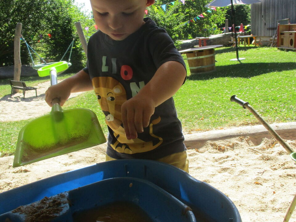 Mit allerlei Wasser und Sand ließen die Krippenkinder ihrer Fantasie und ihrem Feingefühl freien Lauf. Das Matschen im nassen Sand, Backen und Kochen mit kleinen Sandförmchen oder einfach nur das Beobachten des Wassers wie es im Sand versickert, faszinierte die Kinder sehr. Mit den Händen Wasser und Sand zu Matsch vermengen und diesen durch die Finger zu drücken war ein tolles Erlebnis für die taktile Wahrnehmung. Noch dazu war der nasse Sand auf der Haut eine willkommene Abkühlung an diesen heißen Sommertagen.