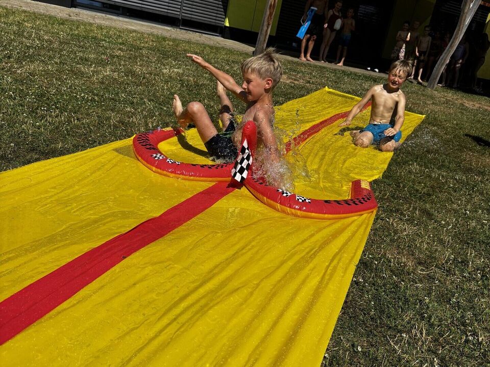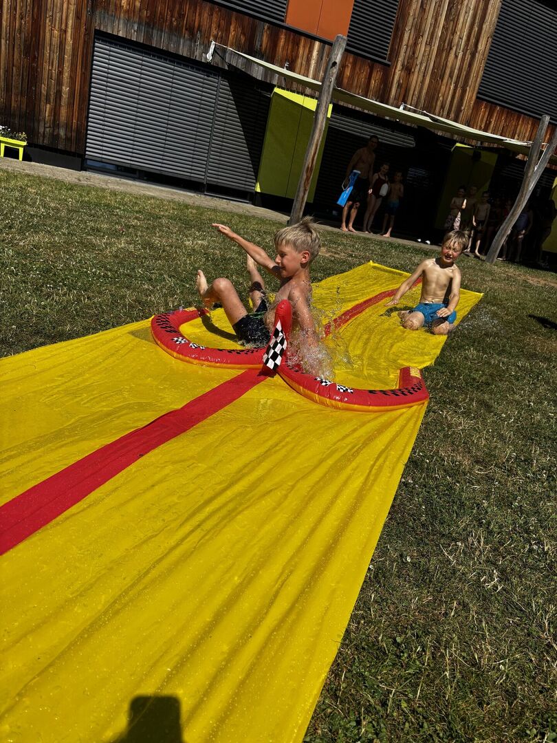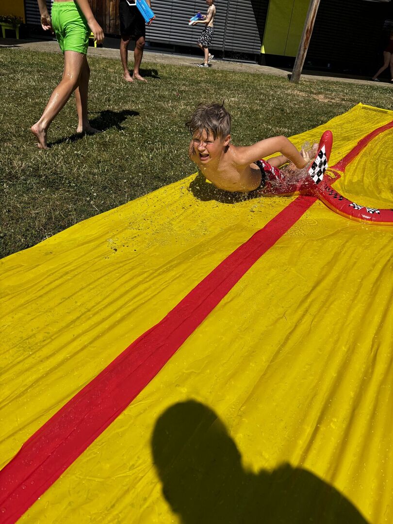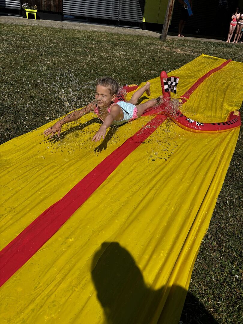 Für unsere Hortkinder standen zu Beginn der Ferien unter anderem Wasserspiele auf dem Ferienplan. In unserem Garten wurde auf der Wasserbahn gerutscht was das Zeug hält. Diese wurde kurzerhand auf das Doppelte verlängert, da blieb keine Badehose trocken. Und mit den von den Kindern mitgebrachten Wasserspritzpistolen gab es eine große Wasserschlacht. Wem dies alles noch zu trocken war, der konnte sich unter dem Regen des Wasserschlauches erfrischen.