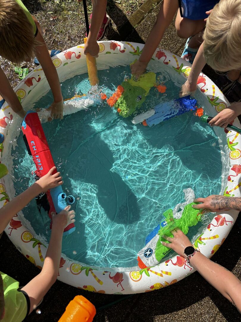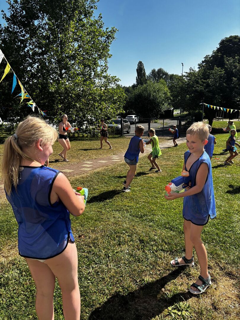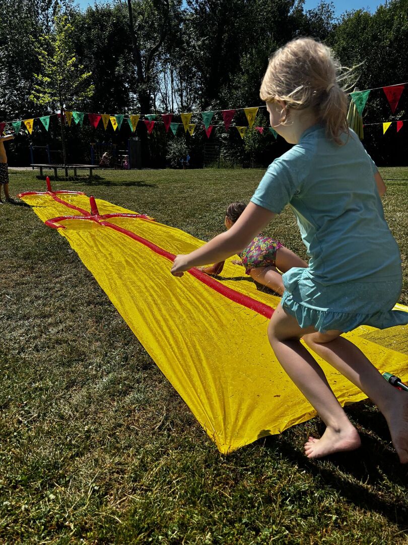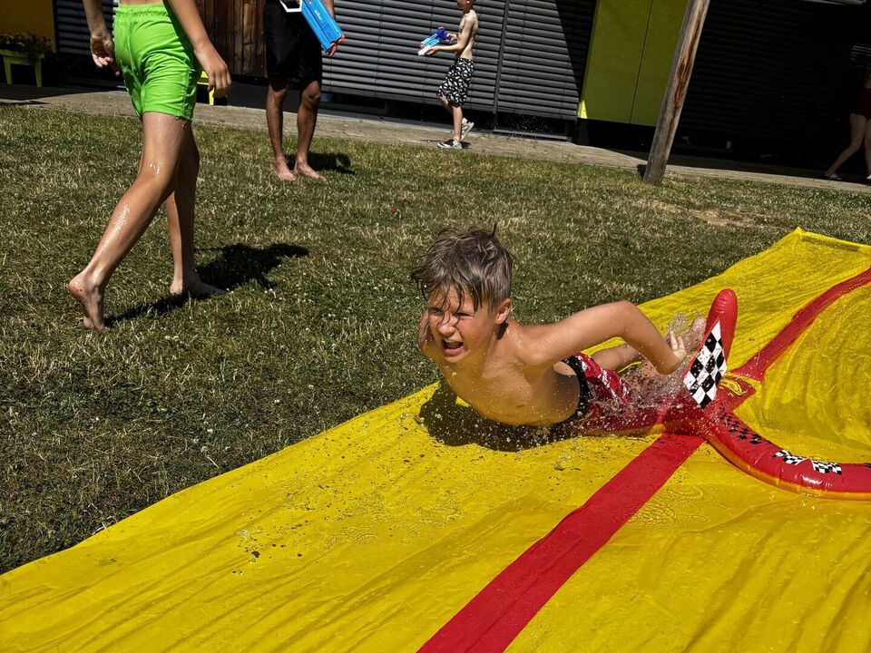 Für unsere Hortkinder standen zu Beginn der Ferien unter anderem Wasserspiele auf dem Ferienplan. In unserem Garten wurde auf der Wasserbahn gerutscht was das Zeug hält. Diese wurde kurzerhand auf das Doppelte verlängert, da blieb keine Badehose trocken. Und mit den von den Kindern mitgebrachten Wasserspritzpistolen gab es eine große Wasserschlacht. Wem dies alles noch zu trocken war, der konnte sich unter dem Regen des Wasserschlauches erfrischen.