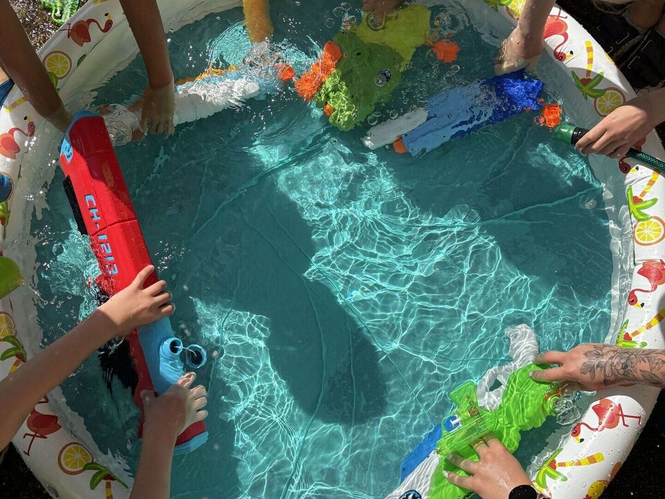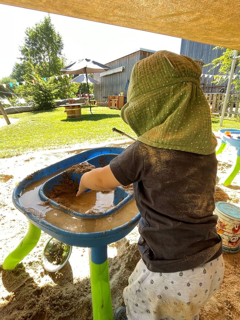 Für die Kleinsten der „Kinderoase“ wurden die Matschtische in ihrem Krippengarten aufgestellt, mit kühlem Wasser befüllt und schon konnte der Spaß beginnen.