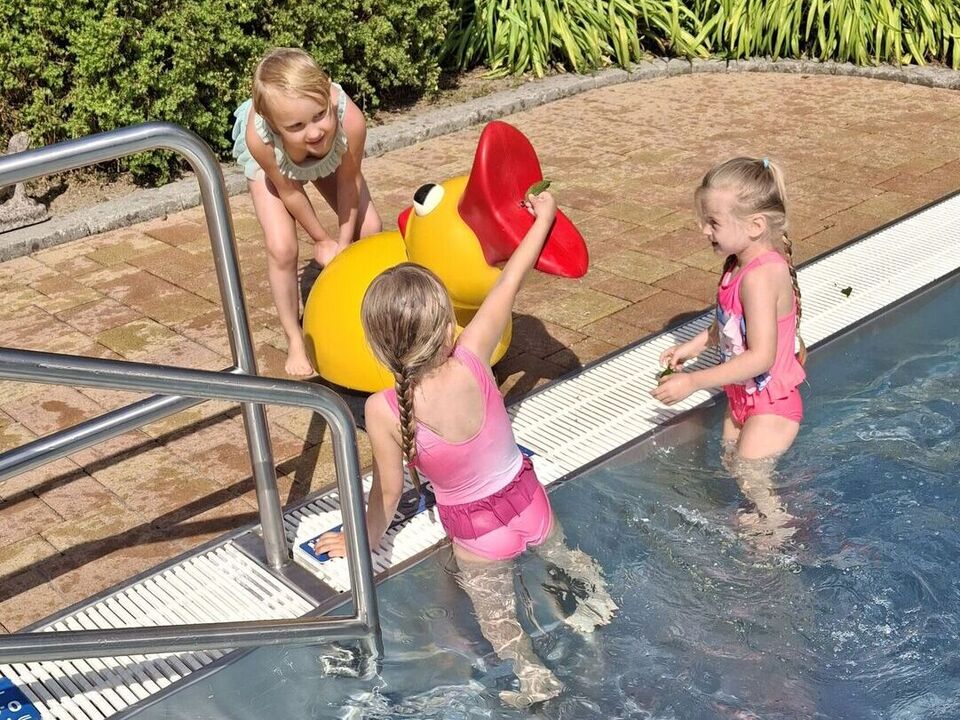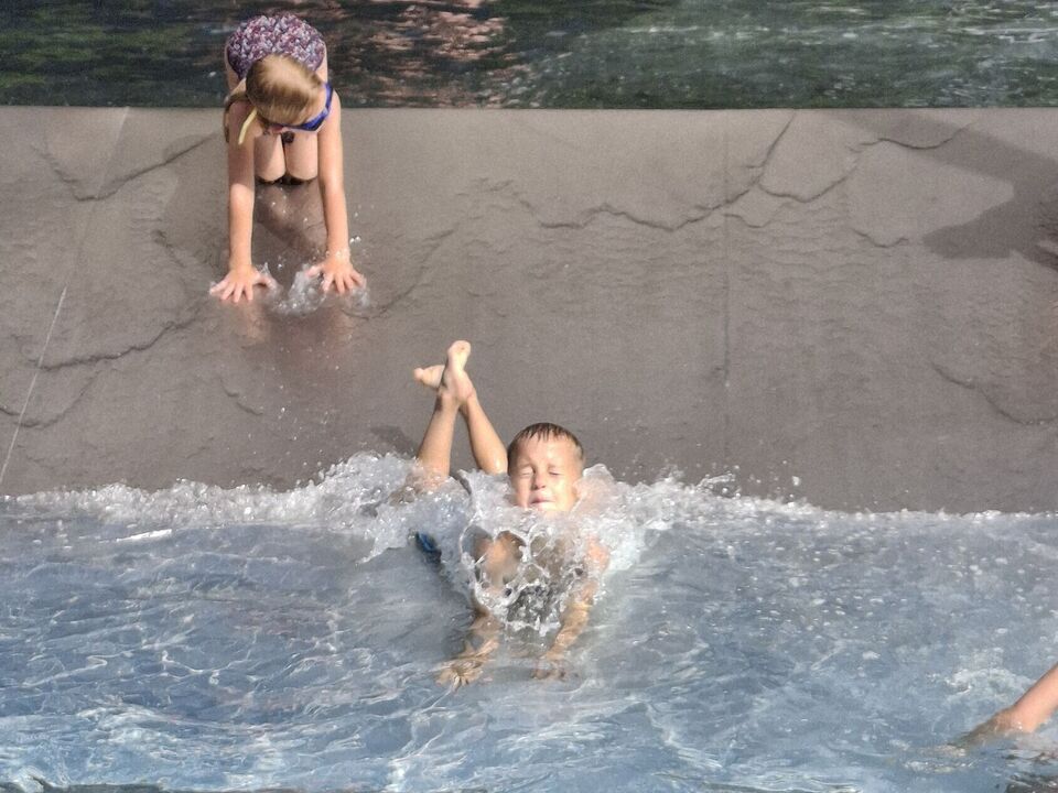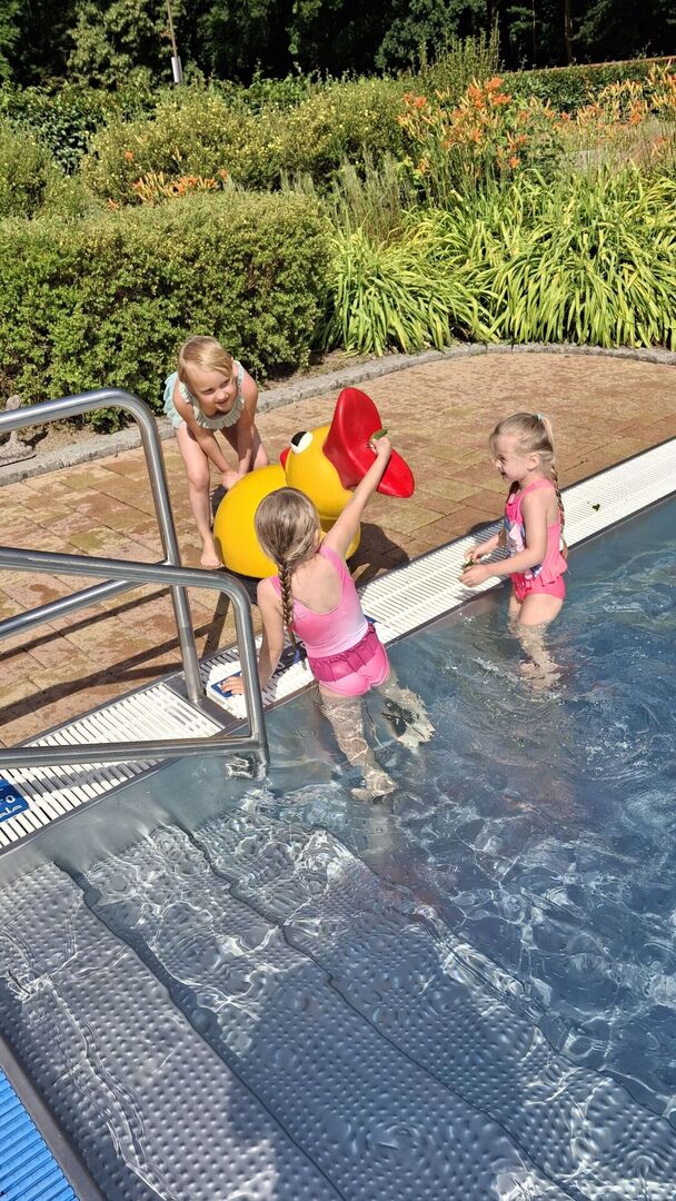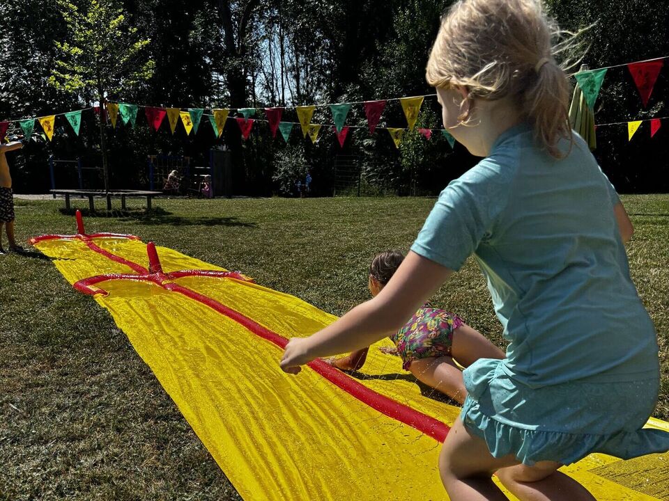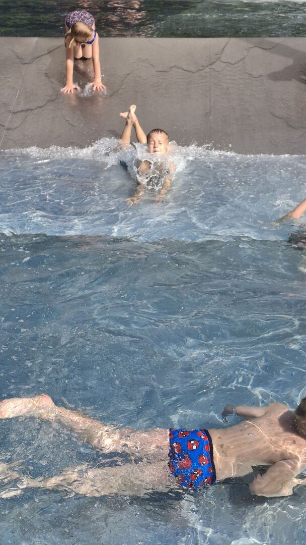 Auch die Kinder des Blauen Bereiches freuten sich riesig wenn die Wasserrutschbahn im Garten aufgebaut wurde. Als Highlight der heißen Sommerwoche ging es für die 5-6 Jährigen an zwei Tagen ins nahegelegene Sahnbad. Dort waren dem Wasserspaß keine Grenzen gesetzt. Es wurde gebadet, gerutscht, getaucht und sich gegenseitig nass gespritzt. ABKÜHLUNG PUR – während die Sonne vom Himmel strahlte!