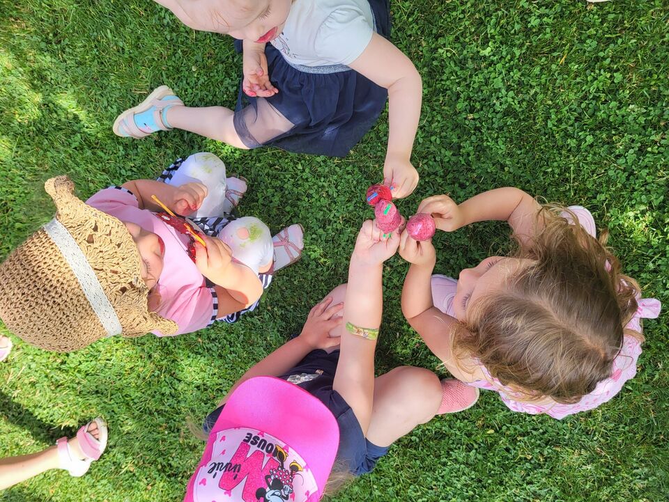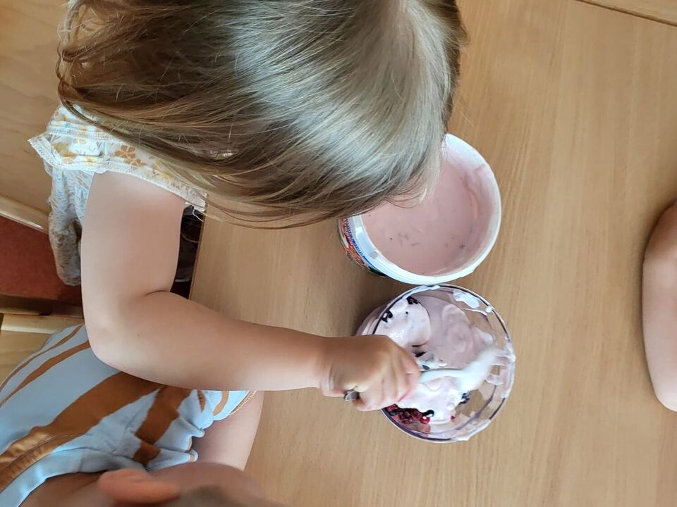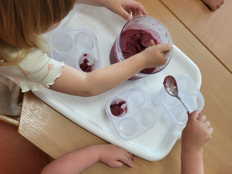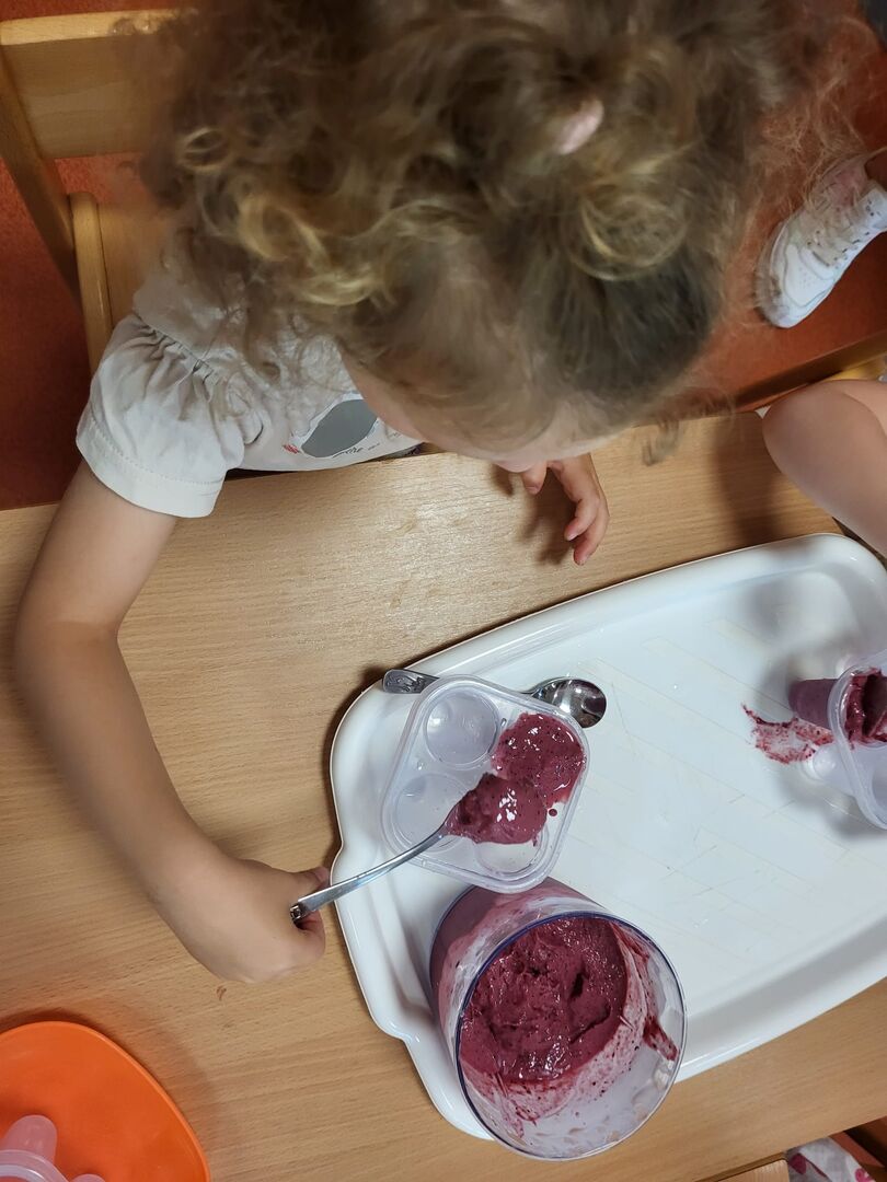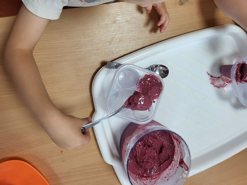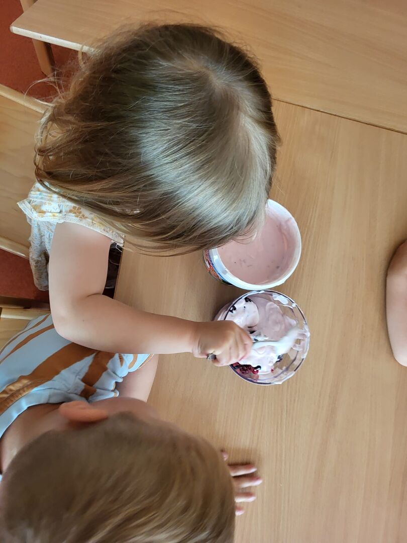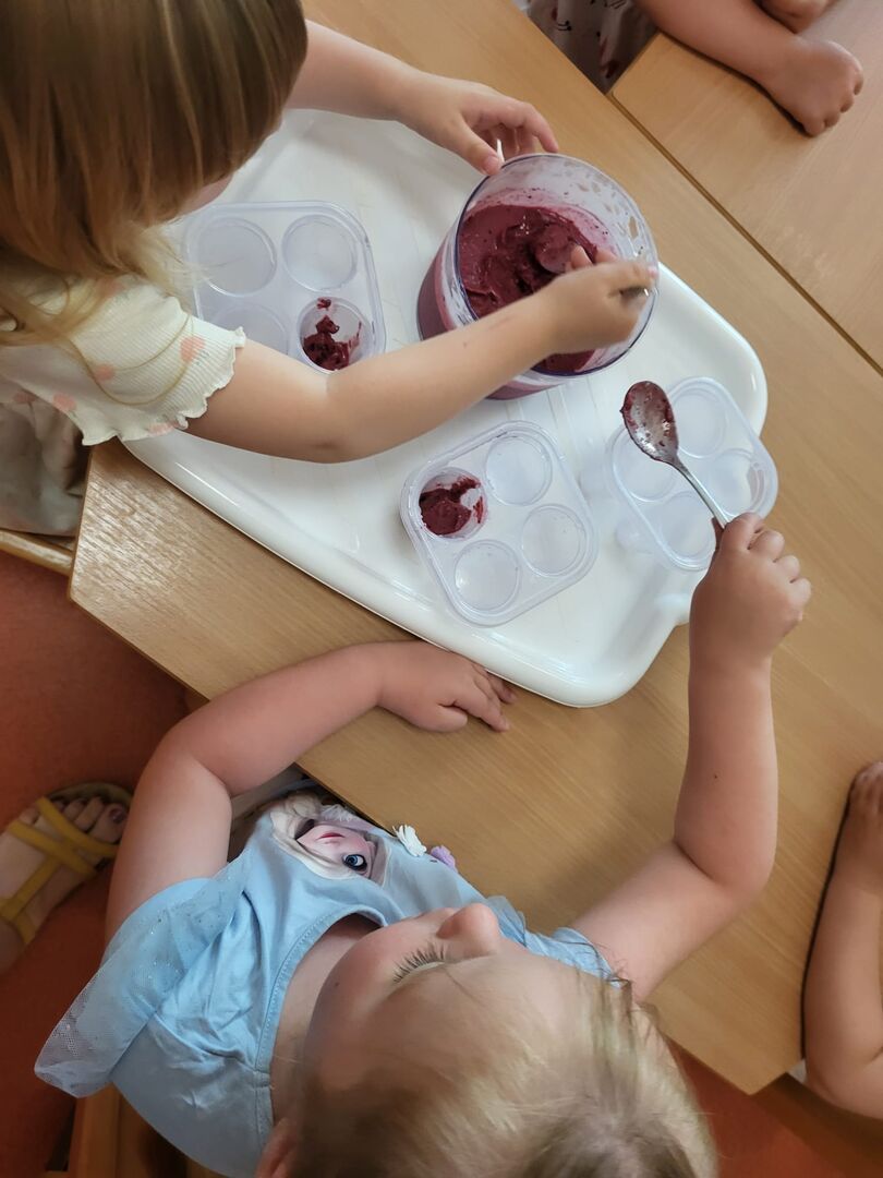 Ebenso nutzten unsere Kita- und Hortkinder in den letzten Wochen jede Möglichkeit sich ein wenig abzukühlen. In einem kleinen Planschpool oder aus dem Gartenschlauch erfrischten sich täglich die Kinder des Roten Bereiches im Garten. Strahlende Kinderaugen gepaart mit Kinderlachen bestätigten den riesen Spaß den sie dabei hatten. Und neben Abkühlung mit Wasser lässt es sich auch wunderbar mit selbstgemachtem Eis aushalten. Mit einer Beerenmischung, Joghurt und etwas Marmelade rührten die 2-4 Jährigen ihre Eismischung zusammen und ließen es sich am nächsten Tag schmecken.