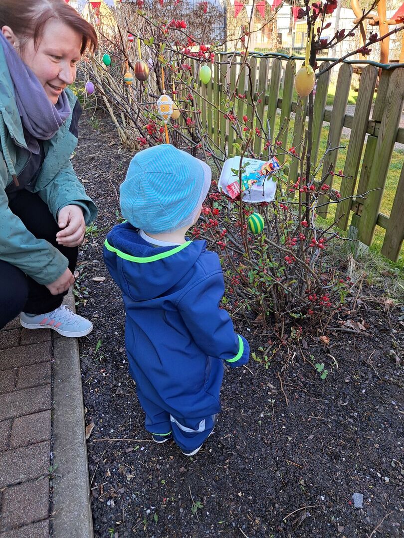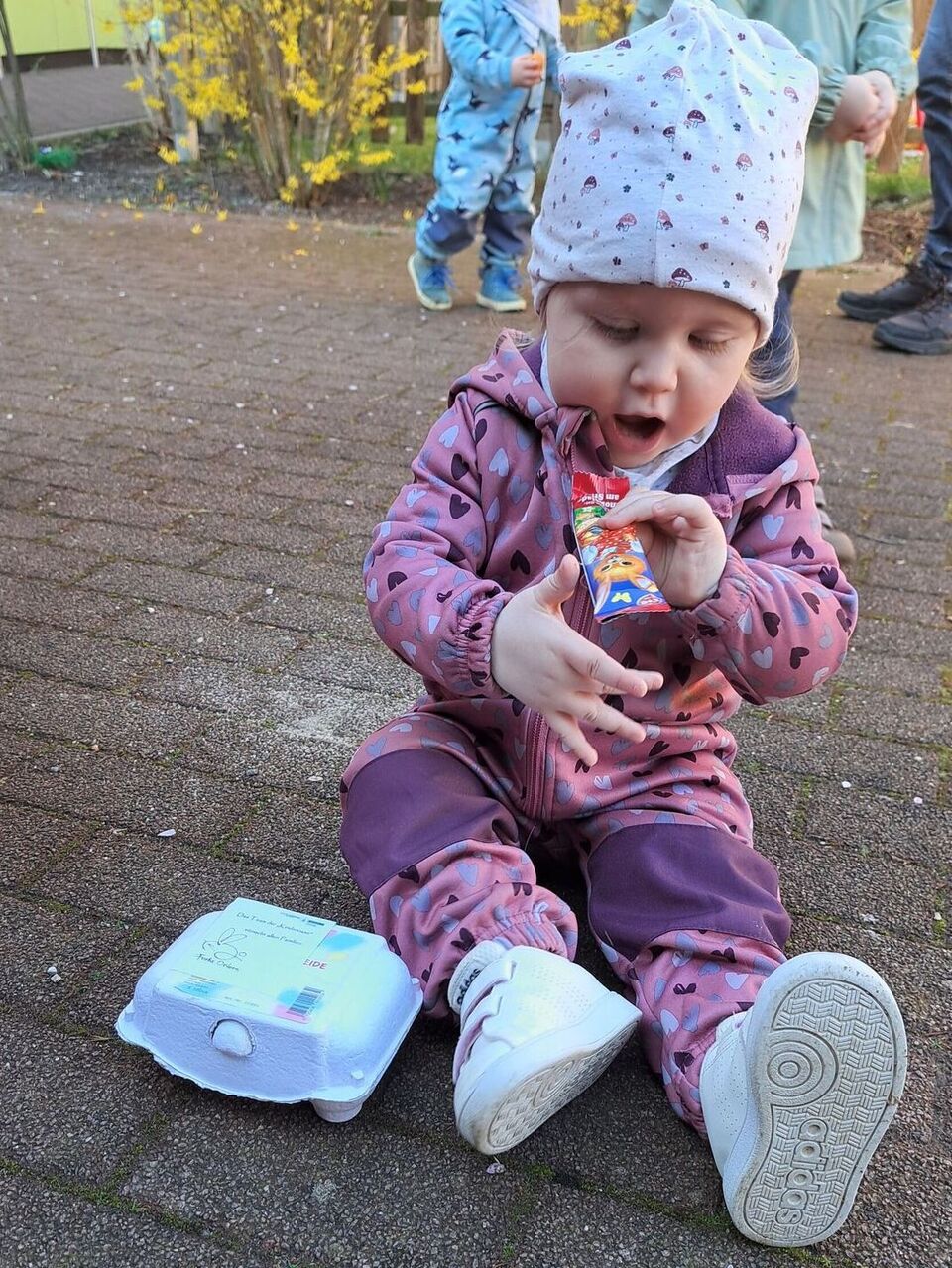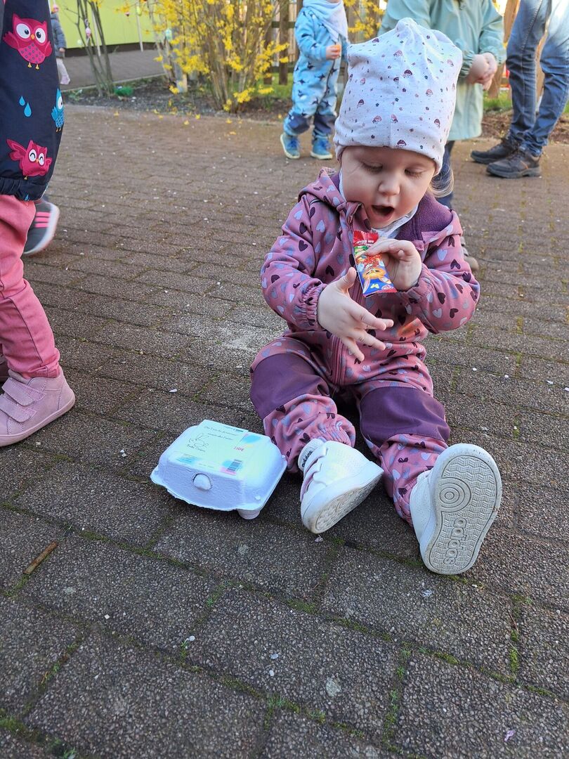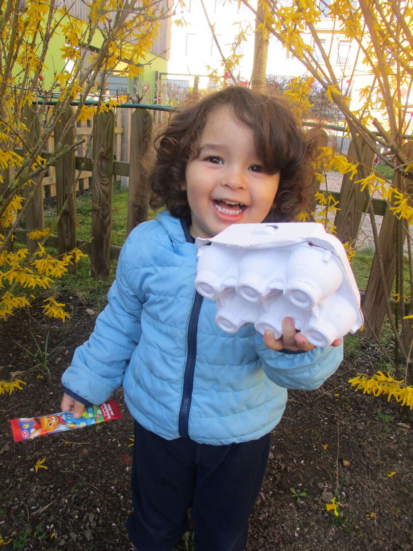 Mit funkelnden Augen und viel Neugier durchsuchten die Kinder des Roten Bereiches den Garten und freuten sich umso mehr, wenn sie ein Nest gefunden haben. Das war gar nicht immer so leicht! Auch unsere Kleinsten waren eifrig auf der Suche nach Osternestern und fanden so manche kleine Überraschung im Gebüsch. Die Freude über die kleine Süßigkeit und das Osternest war jedoch bei allen Kindern sichtlich groß.