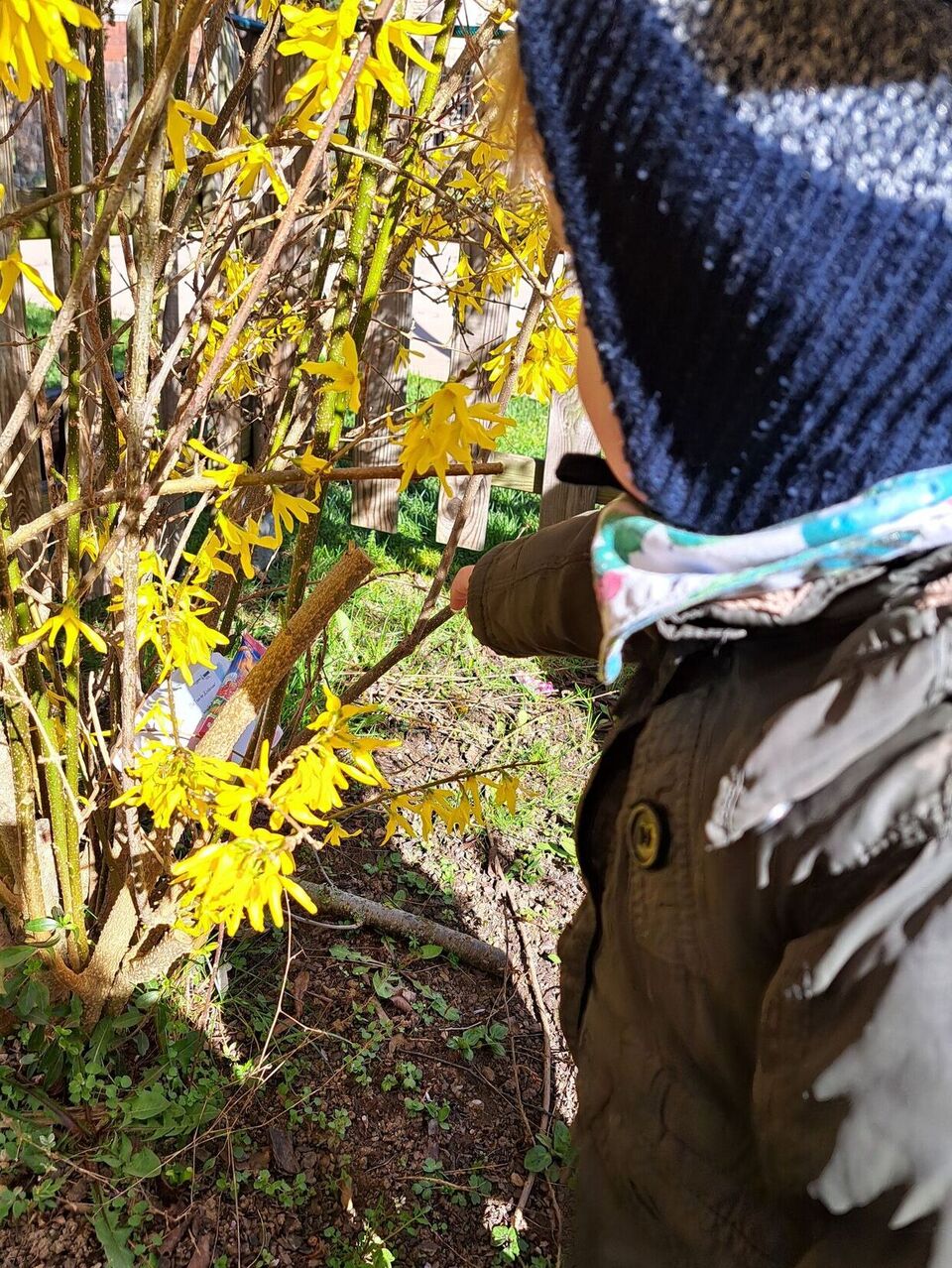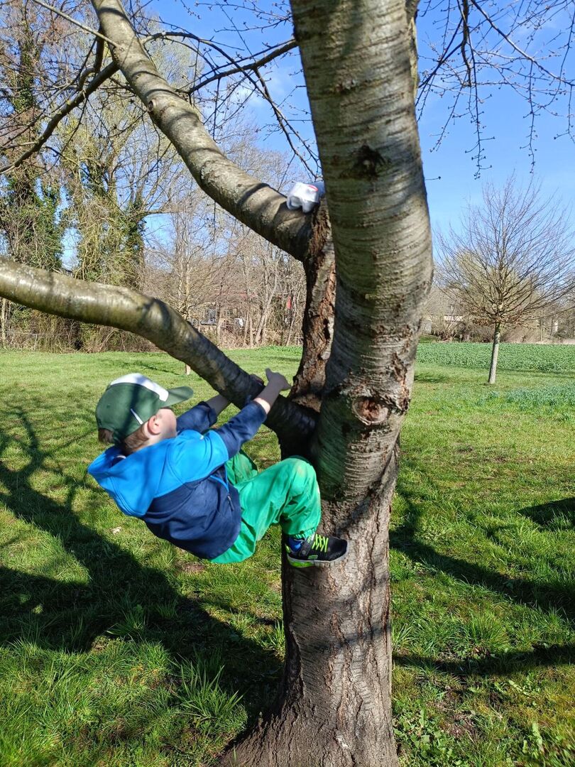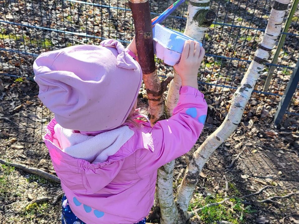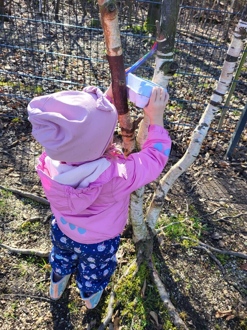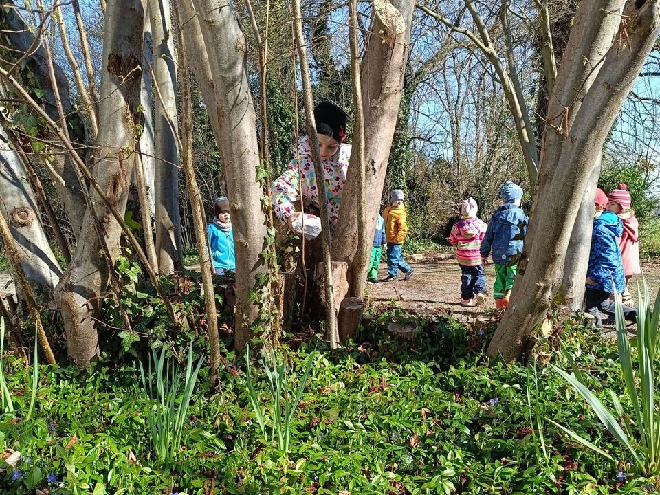 Nun konnte die Osternestsuche starten… die Kinder flitzten über das Gelände auf der Suche nach einem Osternest. Um an manche Osternester zu gelangen mussten die Kinder sich ganz lang strecken, auf Bäume klettern oder ganz klein machen. Das war für alle Kinder ein großer Spaß!