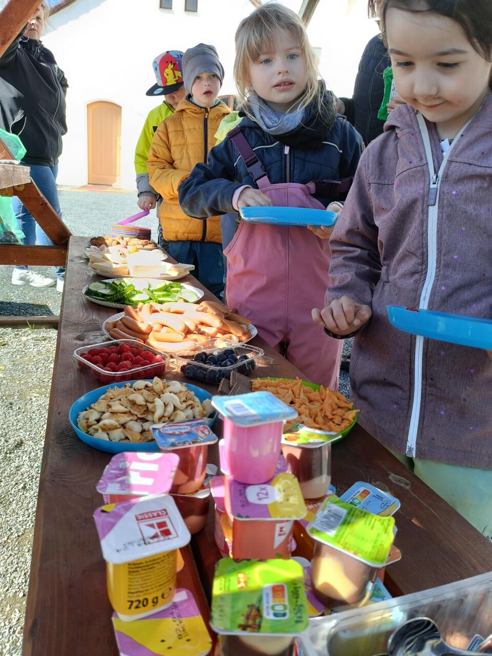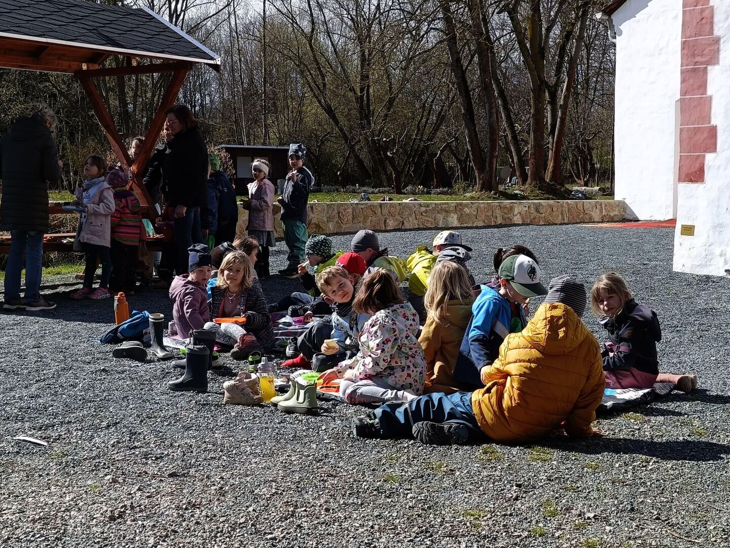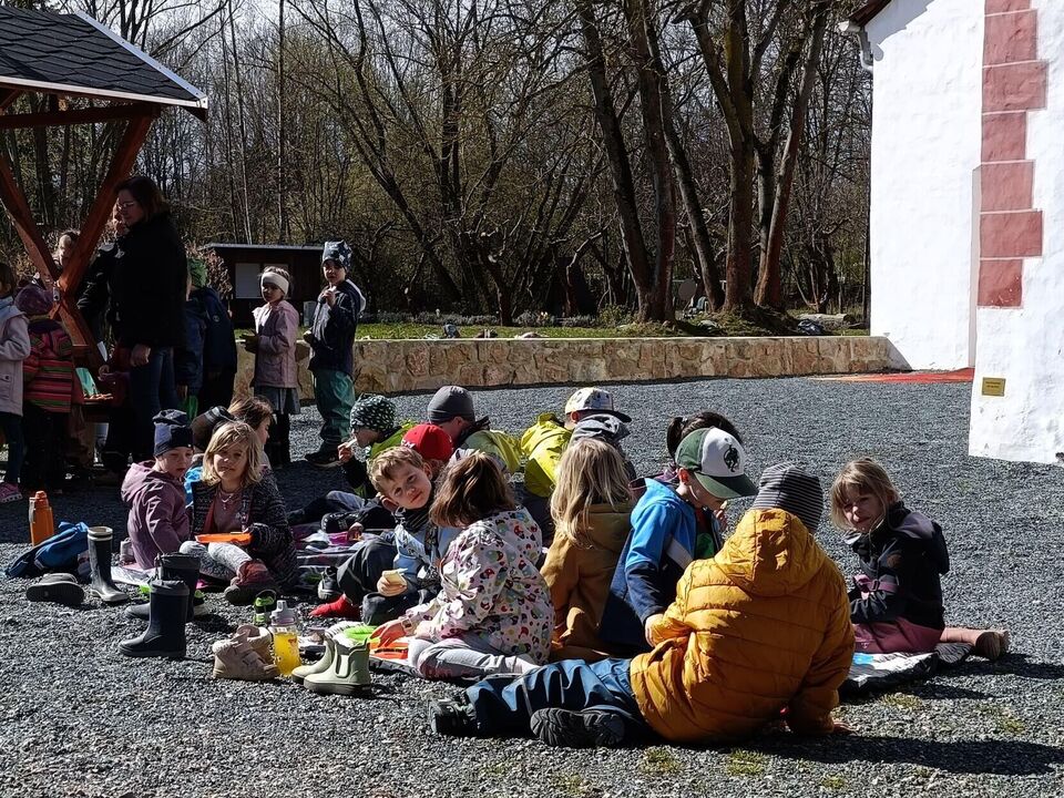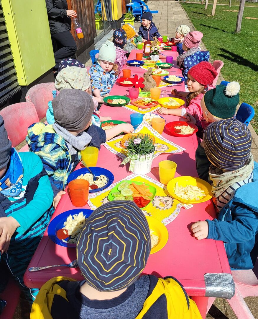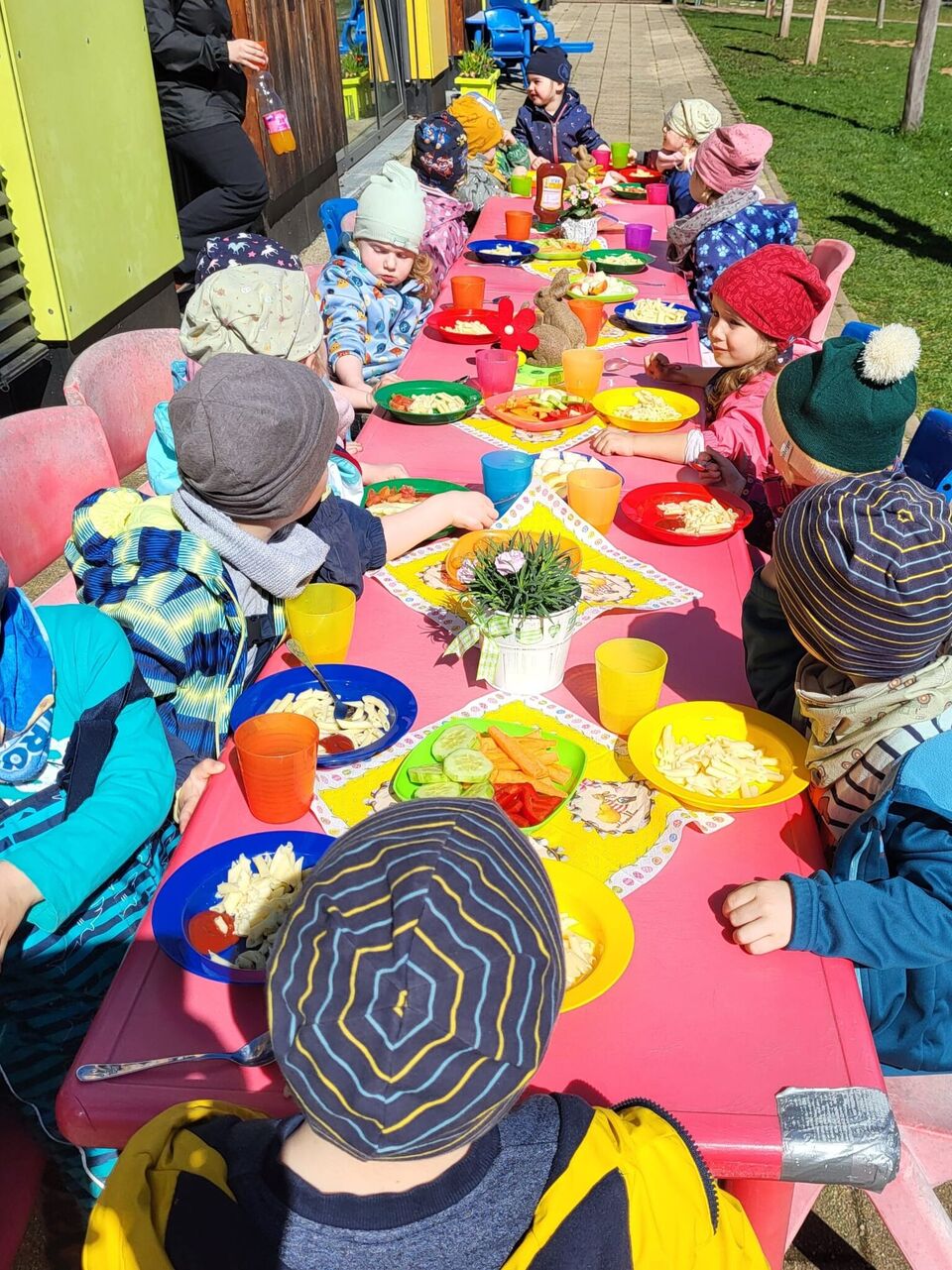Unsere Kindergartenkinder beendeten diesen aufregenden Vormittag mit einem bunten, abwechslungsreichen Osterpicknick – ob in unserem Garten oder am Kloster. Die Kinder ließen sich die vielen Köstlichkeiten an einer langen Tafel oder in großer Runde auf der Picknickdecke schmecken.