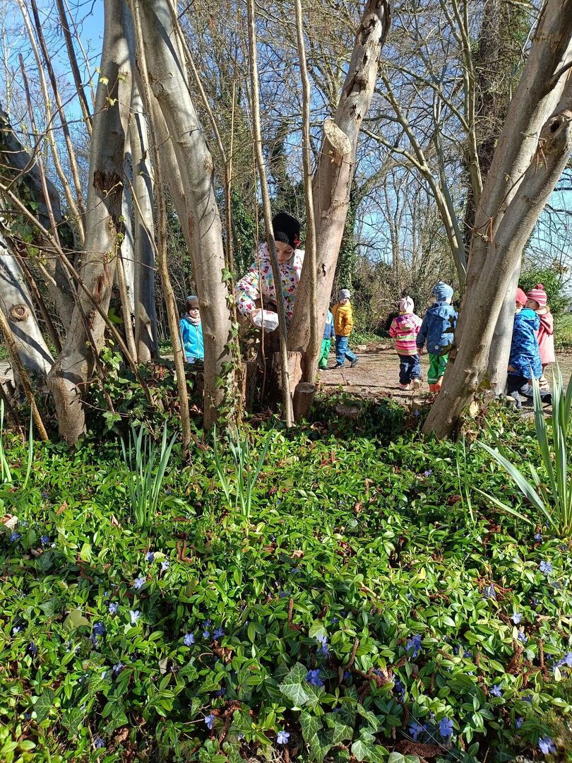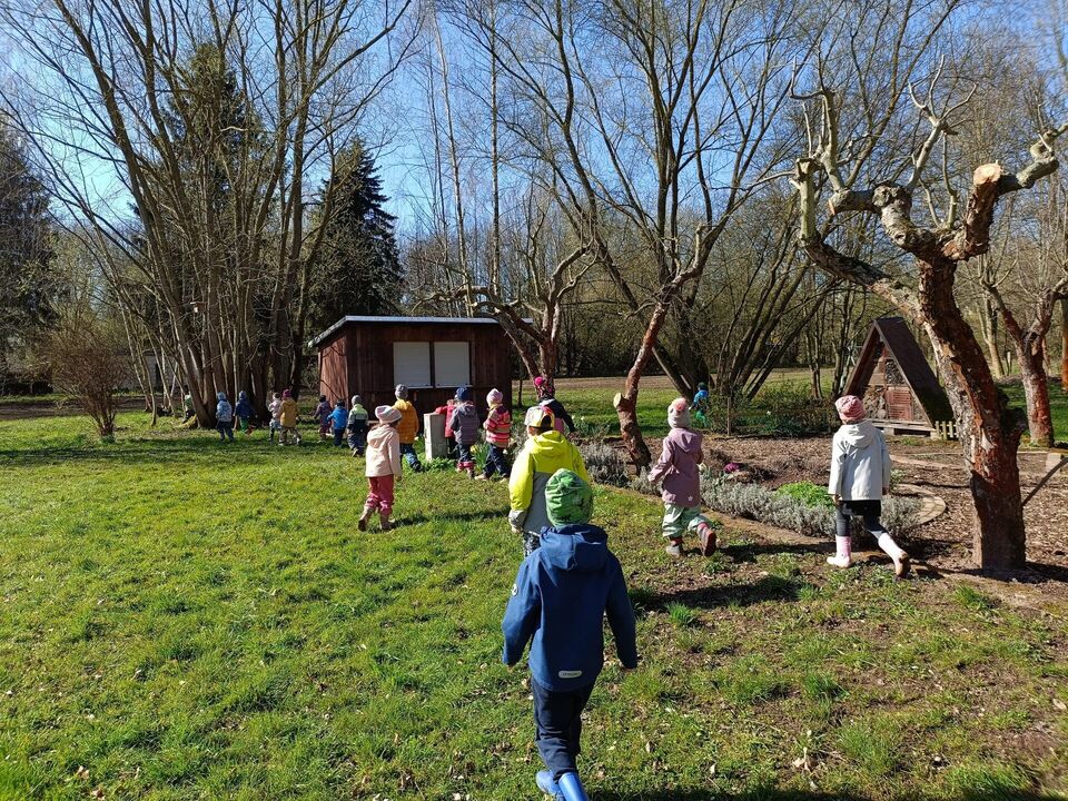 Bei schönstem Sonnenschein ging es nach dem Frühstück für unsere Kinder des Blauen Bereiches nach draußen. Sie starteten mit ihren Rucksäcken bepackt zu einem Osterspaziergang zum Kloster Frankenhausen. Auf der großen Wiese angekommen, wurden die Augen der Kinder schon ganz groß, als die ersten kleinen Überraschungen entdeckt wurden. War doch der Osterhase auch am Kloster vorbeigekommen und hat dort für unsere Kinder eine Kleinigkeit versteckt?!