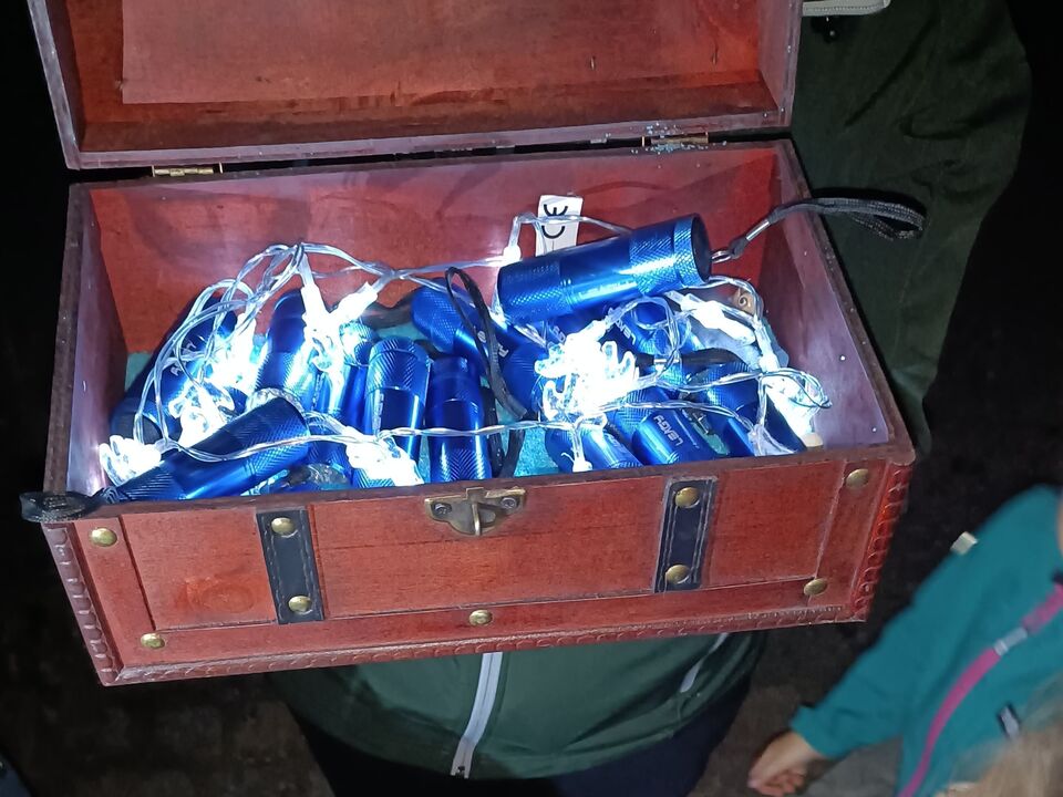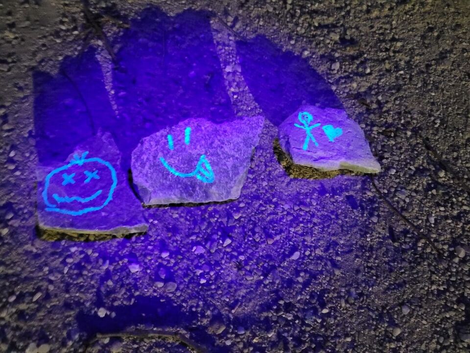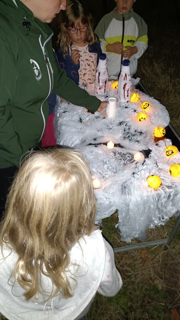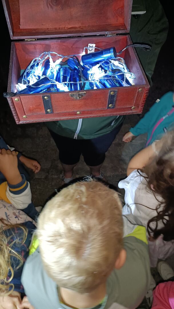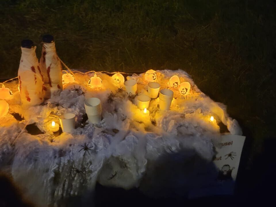 Ein echtes Highlight war unsere spannende Nachtwanderung zum Kloster Frankenhausen. Ohne Taschenlampen ging es am Ufer der Pleiße entlang. Ein bekannter Weg, aber im Dunkeln geheimnisvoll und aufregend. Auf diesem Weg begegneten uns kleine Geister die für den einen oder anderen Schreckmoment sorgten. Für manche Kinder war da die schützende Hand der Erwachsenen sehr angenehm. Am Ziel angekommen wartete der „Schatz vom Spukbert“: Schwarzlichtlampen, mit denen die Kinder versteckte Geheimnisse auf den Steinen entdecken konnten – ein ganz besonderer Moment!
