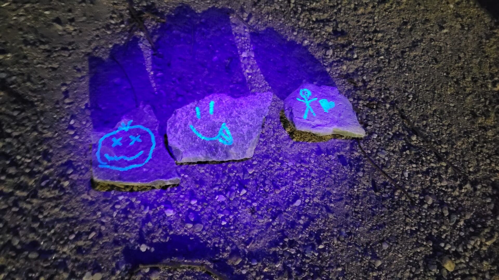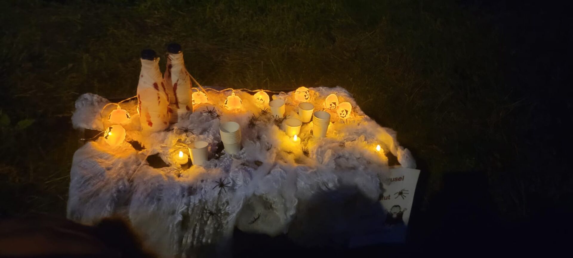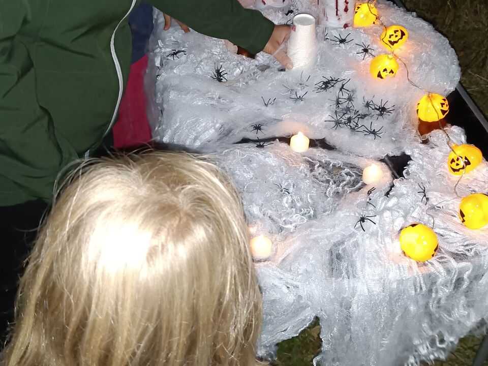 Ein echtes Highlight war unsere spannende Nachtwanderung zum Kloster Frankenhausen. Ohne Taschenlampen ging es am Ufer der Pleiße entlang. Ein bekannter Weg, aber im Dunkeln geheimnisvoll und aufregend. Auf diesem Weg begegneten uns kleine Geister die für den einen oder anderen Schreckmoment sorgten. Für manche Kinder war da die schützende Hand der Erwachsenen sehr angenehm. Am Ziel angekommen wartete der „Schatz vom Spukbert“: Schwarzlichtlampen, mit denen die Kinder versteckte Geheimnisse auf den Steinen entdecken konnten – ein ganz besonderer Moment!