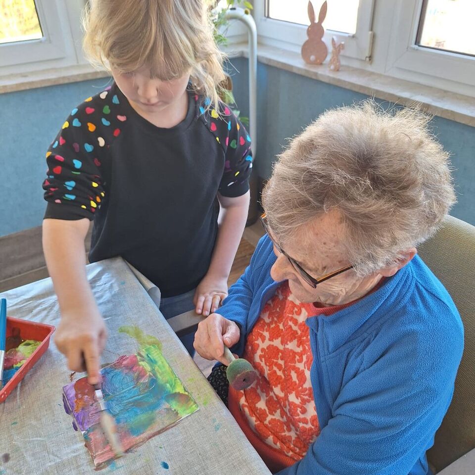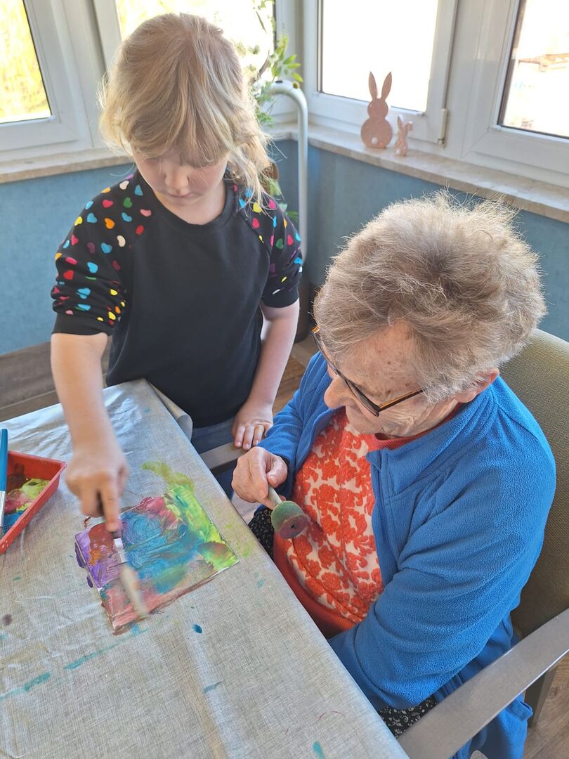 Viele weiße Leinwände warteten darauf, einen farbigen "Anstrich" zu bekommen. Alt und Jung fanden sich sehr schnell in kleinen Gruppen zusammen und tauschten ihre Ideen aus, um dann gemeinsam kreativ tätig zu werden. So entstanden Osterbilder, Frühlingsbilder, kleine, bunte "Gemälde", sowie sogar ein "Porträt" einer Seniorin mit einem Mädchen.