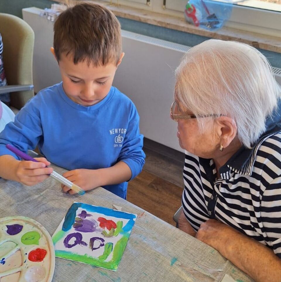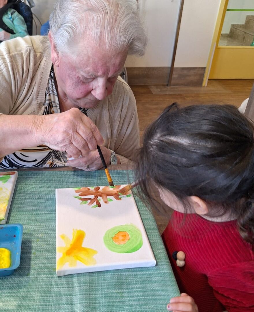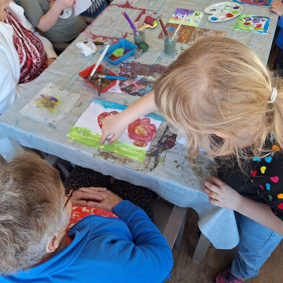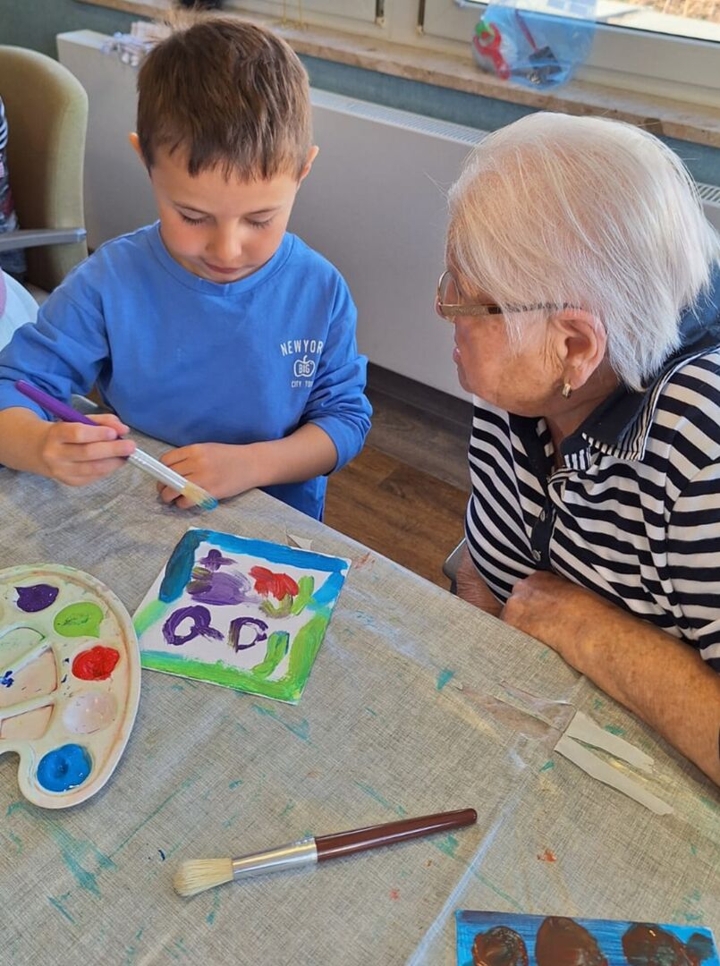 Die Kinder hatten ganz viele bunte Malfarben und verschiedene Malutensilien sowie auch ein bisschen Glitzer im Gepäck und wurden von den Senioren schon voller Neugier erwartet und herzlich begrüßt.