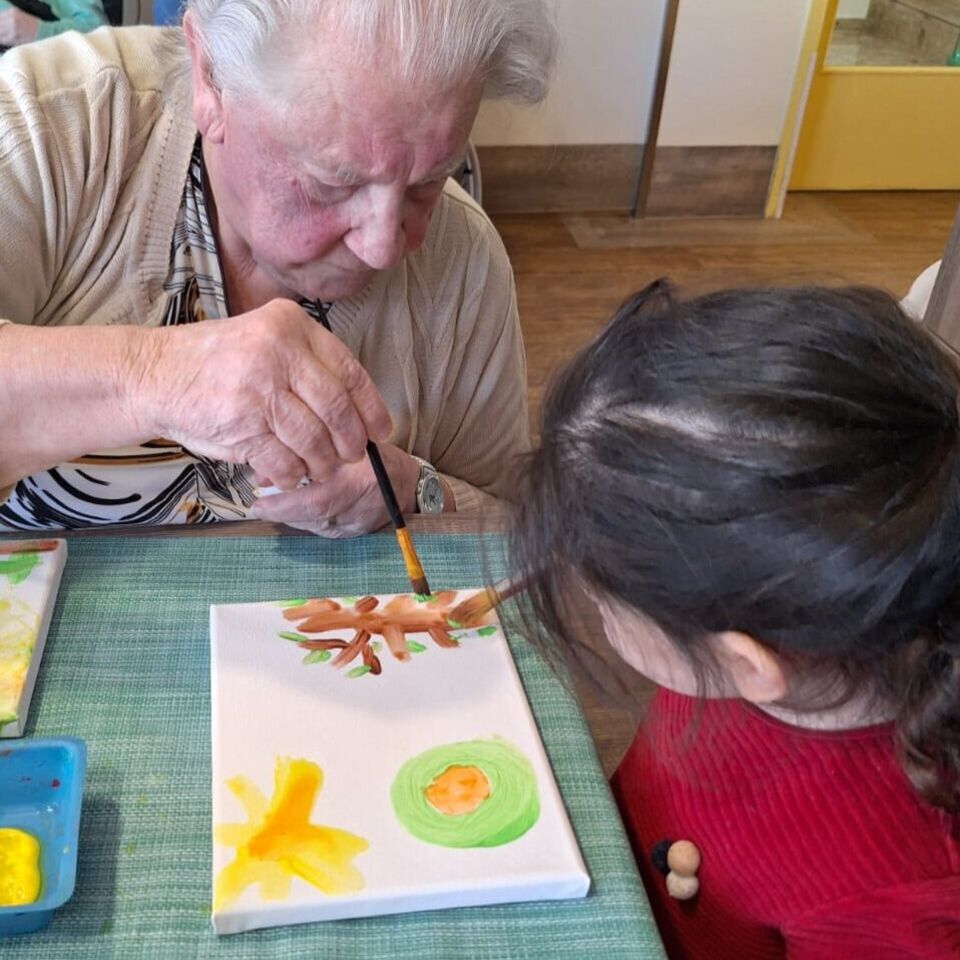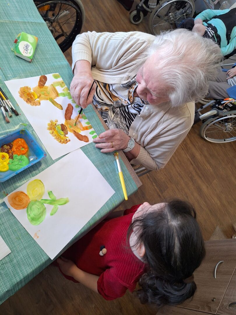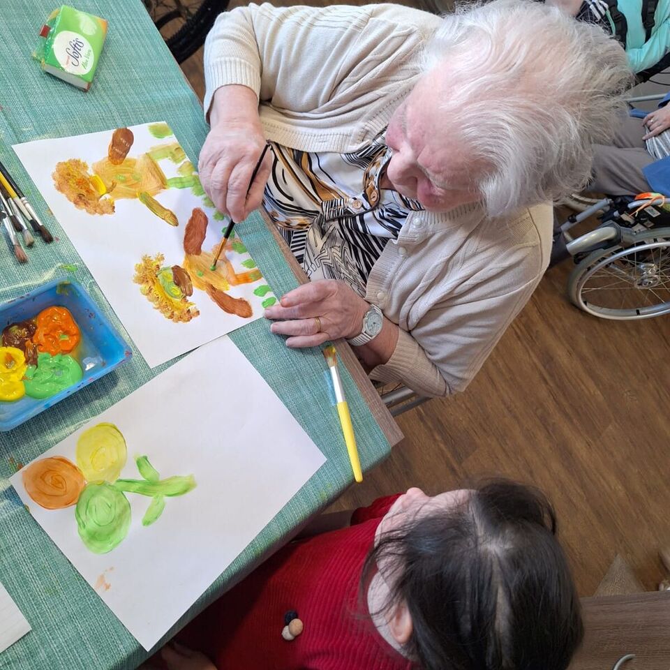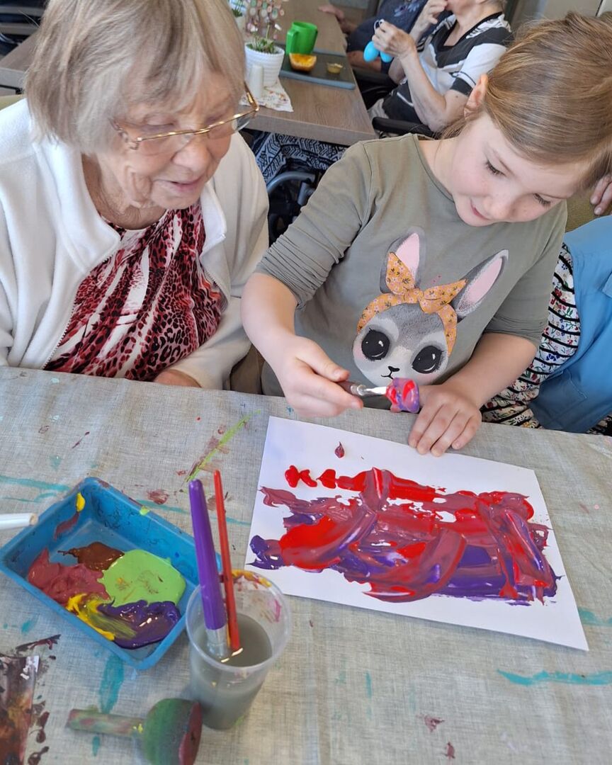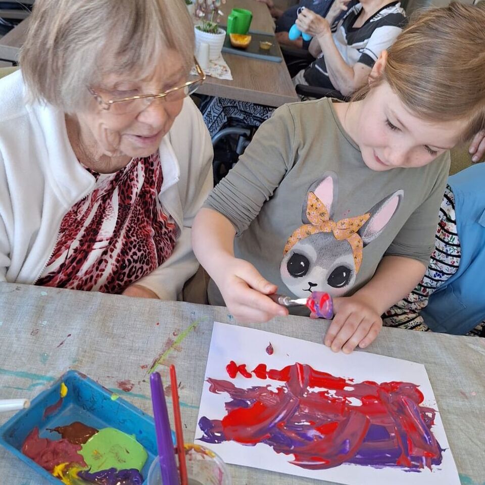 Die Kinder hatten ganz viele bunte Malfarben und verschiedene Malutensilien sowie auch ein bisschen Glitzer im Gepäck und wurden von den Senioren schon voller Neugier erwartet und herzlich begrüßt.