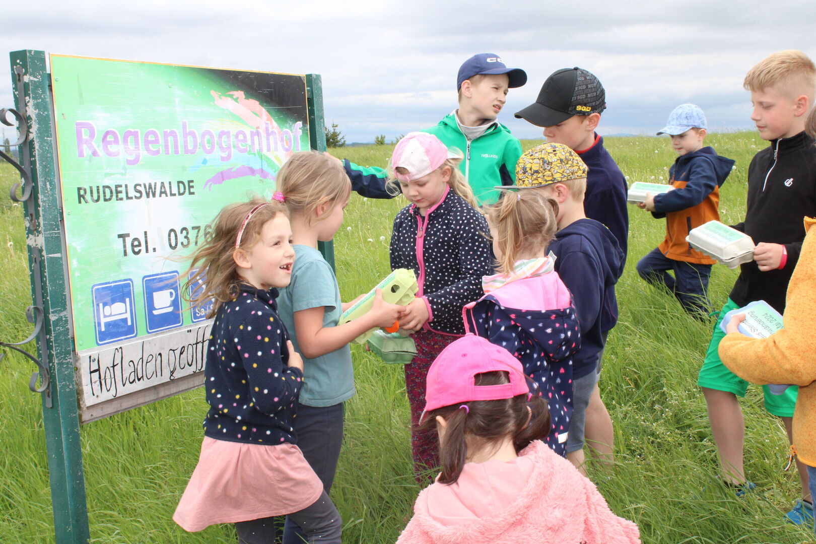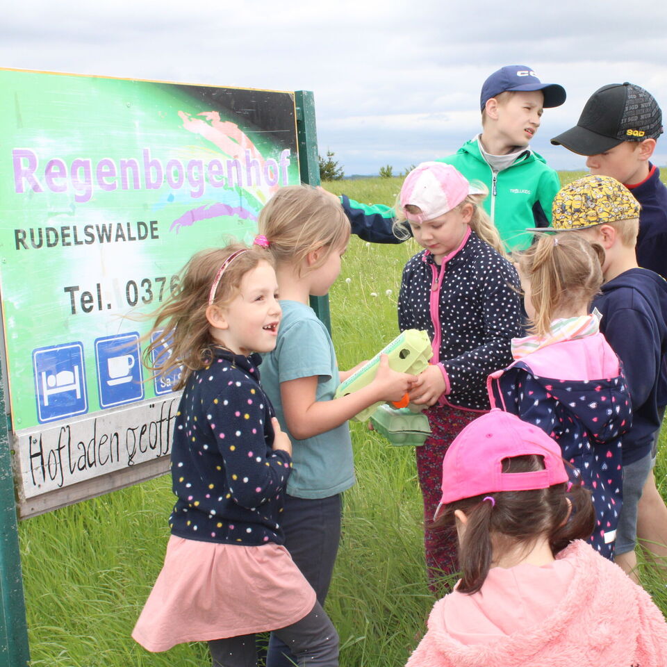 Unzählige Familien und alle pädagogischen Fachkräfte des Kinderhauses machten sich bei perfektem Wanderwetter gemeinsam mit Rucksäcken und Kinder- oder Bollerwagen auf den Weg Richtung "Regenbogenhof" in Rudelswalde.