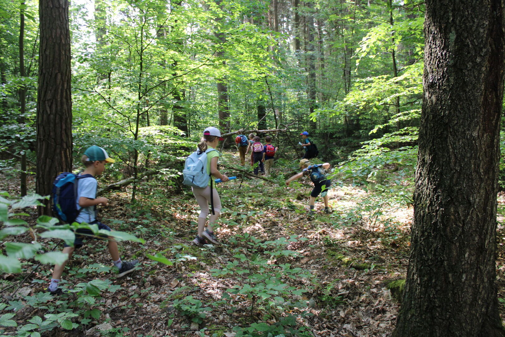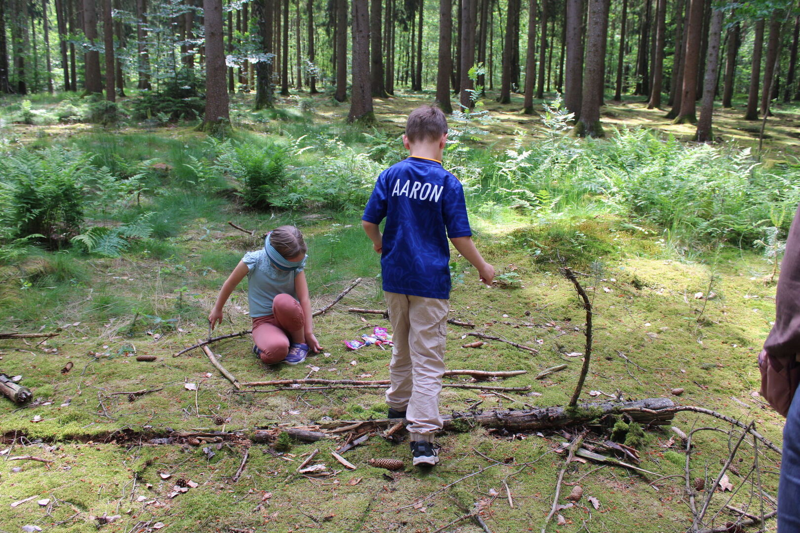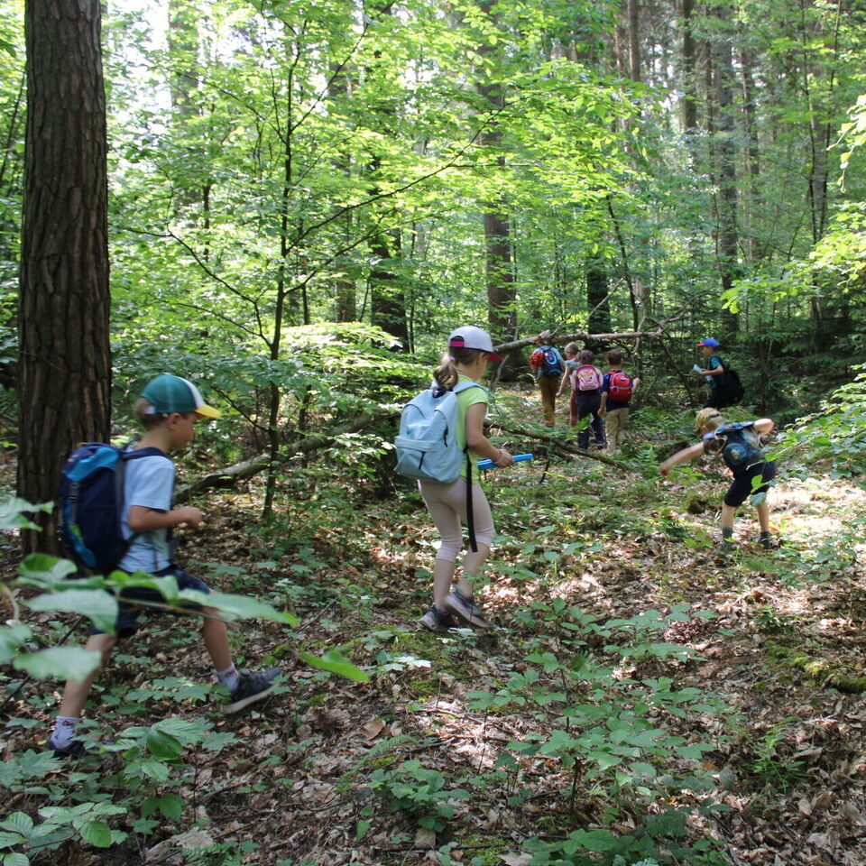 Mit dem Linienbus fuhren wir bis ans Ziel und wurden dort von Frau Brändel und ihrem Assistenten Laurin, einem ehemaligen Sterntaler, schon erwartet. Nach der Begrüßung stellte sich zuallererst die Frage, ob denn alle Kinder die Badesachen für das "Waldbaden" mit im Rucksack haben.