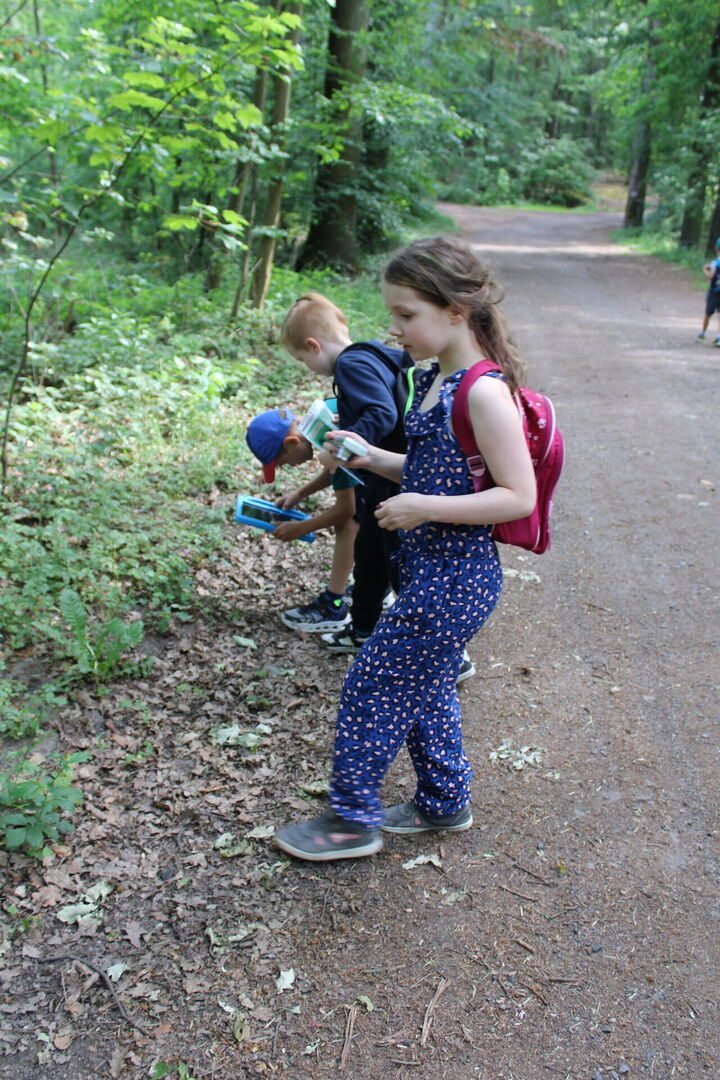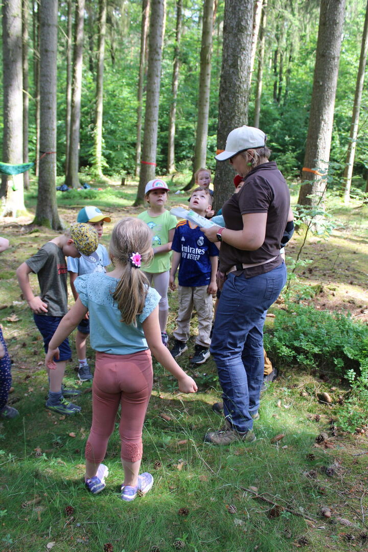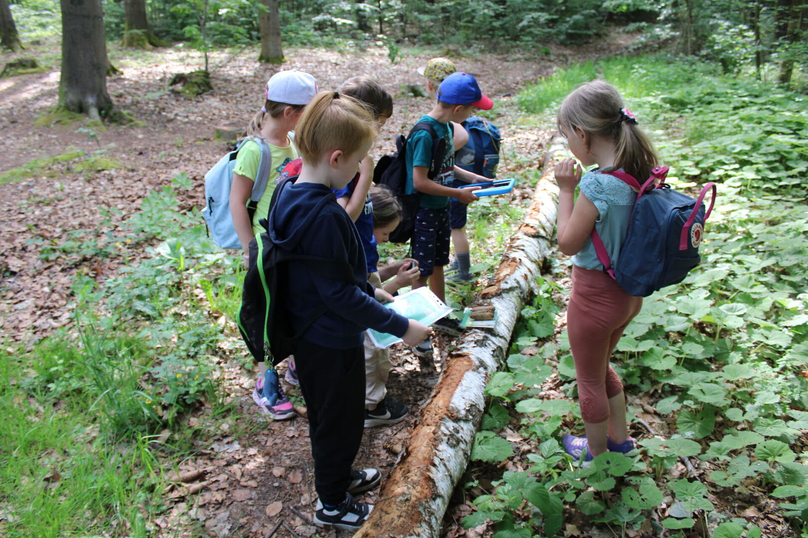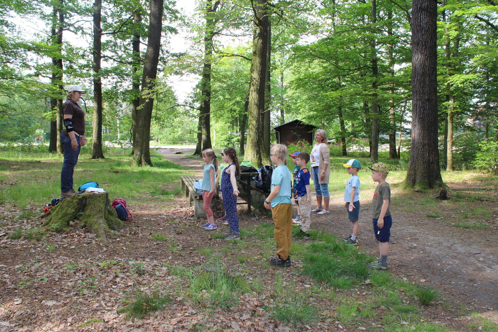 Mit dem Linienbus fuhren wir bis ans Ziel und wurden dort von Frau Brändel und ihrem Assistenten Laurin, einem ehemaligen Sterntaler, schon erwartet. Nach der Begrüßung stellte sich zuallererst die Frage, ob denn alle Kinder die Badesachen für das "Waldbaden" mit im Rucksack haben.