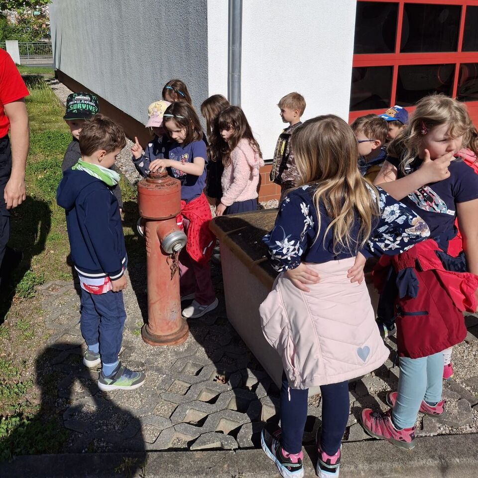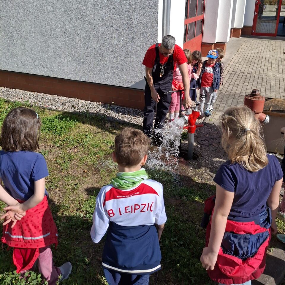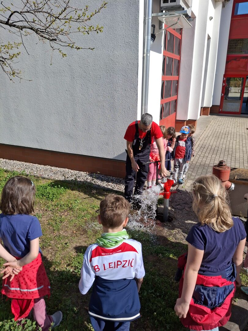 Ganz praxisnah demonstrierte uns Herr Vogt die Funktion eines Hydranten und die Kinder lernten nebenher gleich noch ein neues Wort.