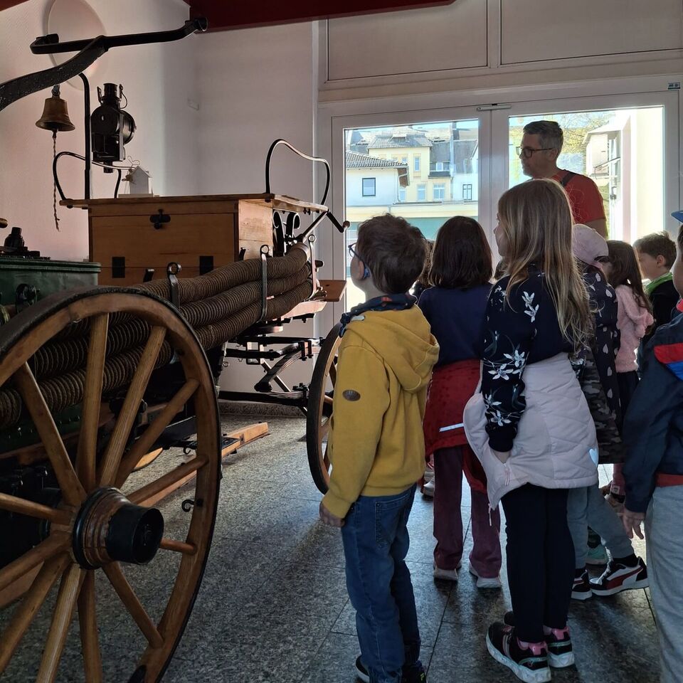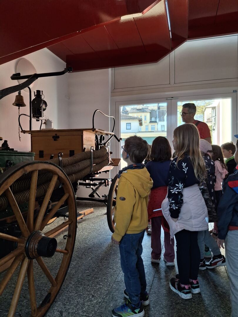 Im Vergleich dazu gab es noch eine alte Feuerwehrkutsche zu bestaunen. Ein Löschwagen von heute verfügt über einen Tank mit 7000 l Wasser, auf der Kutsche befindet sich nur ein kleiner Tank für die Versorgung einer Eimerkette. Damals hatte jeder Haushalt einen Löscheimer und bei Feuer mussten die Menschen eine Eimerkette bilden und alle mit löschen. Dies war für uns alle nur schwer vorstellbar.