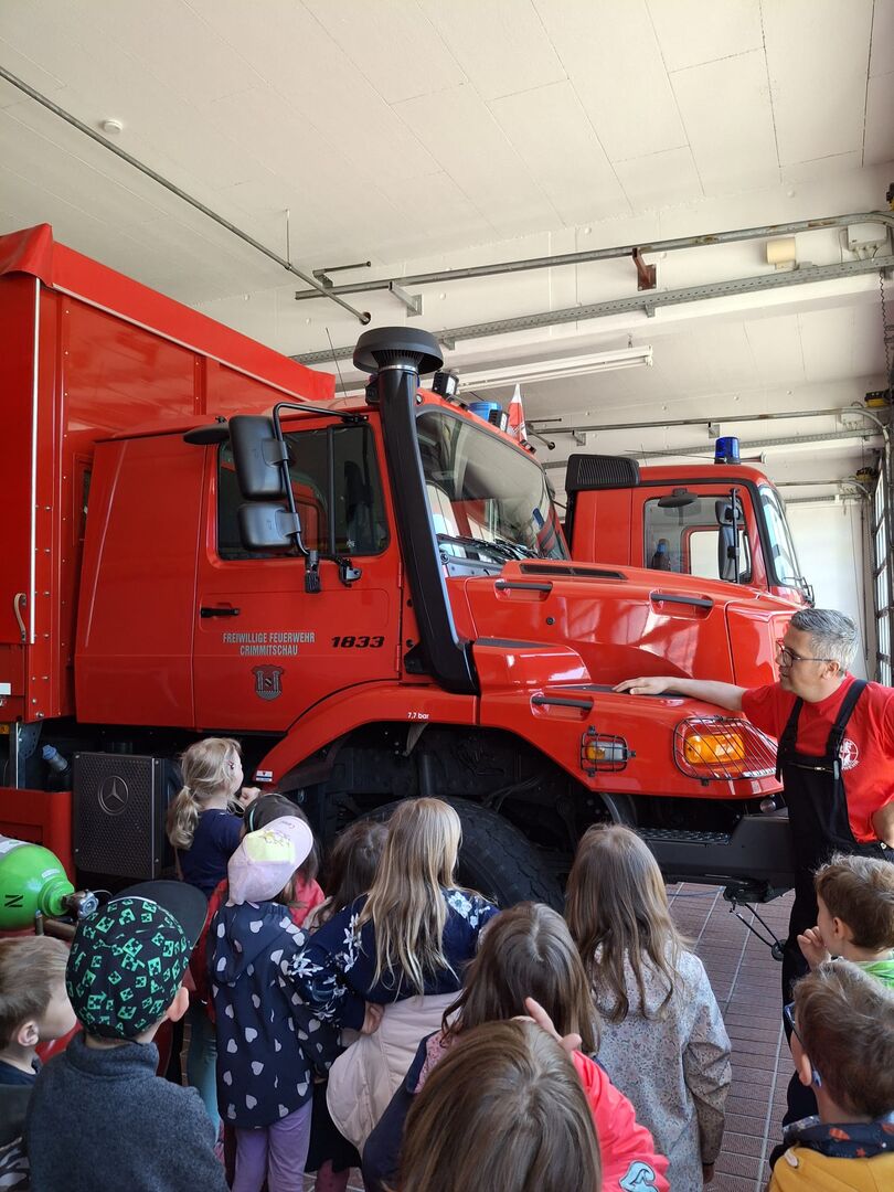Herr Vogt von der Feuerwache Crimmitschau beantwortete zahlreiche Fragen, zeigte uns die verschiedenen Autos und vermittelte gleichzeitig viele Informationen rund um die Feuerwehr.
