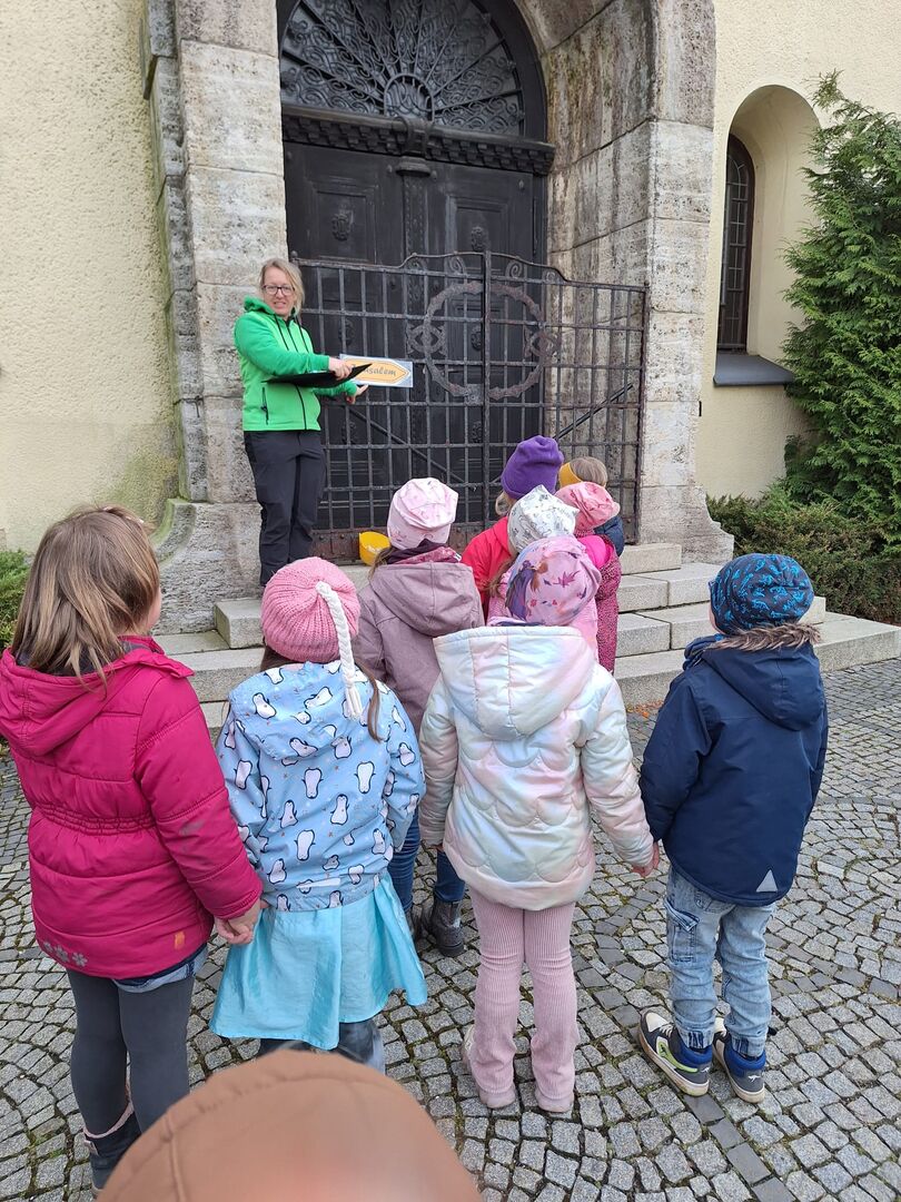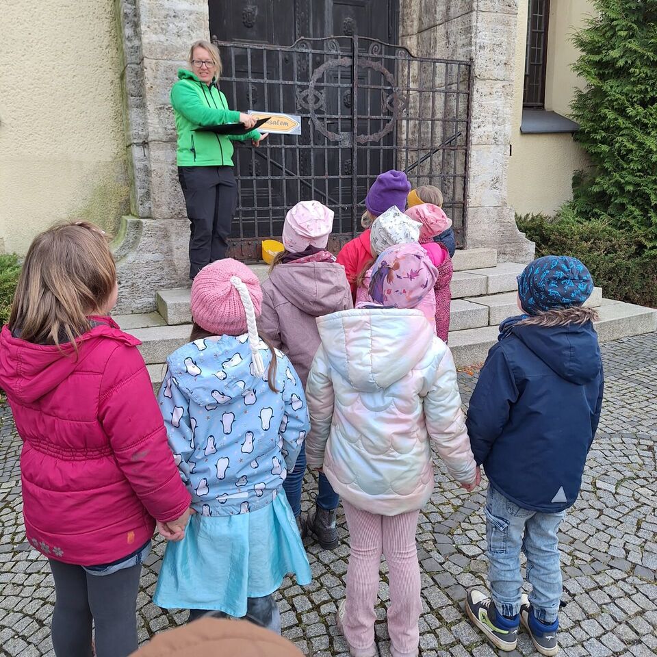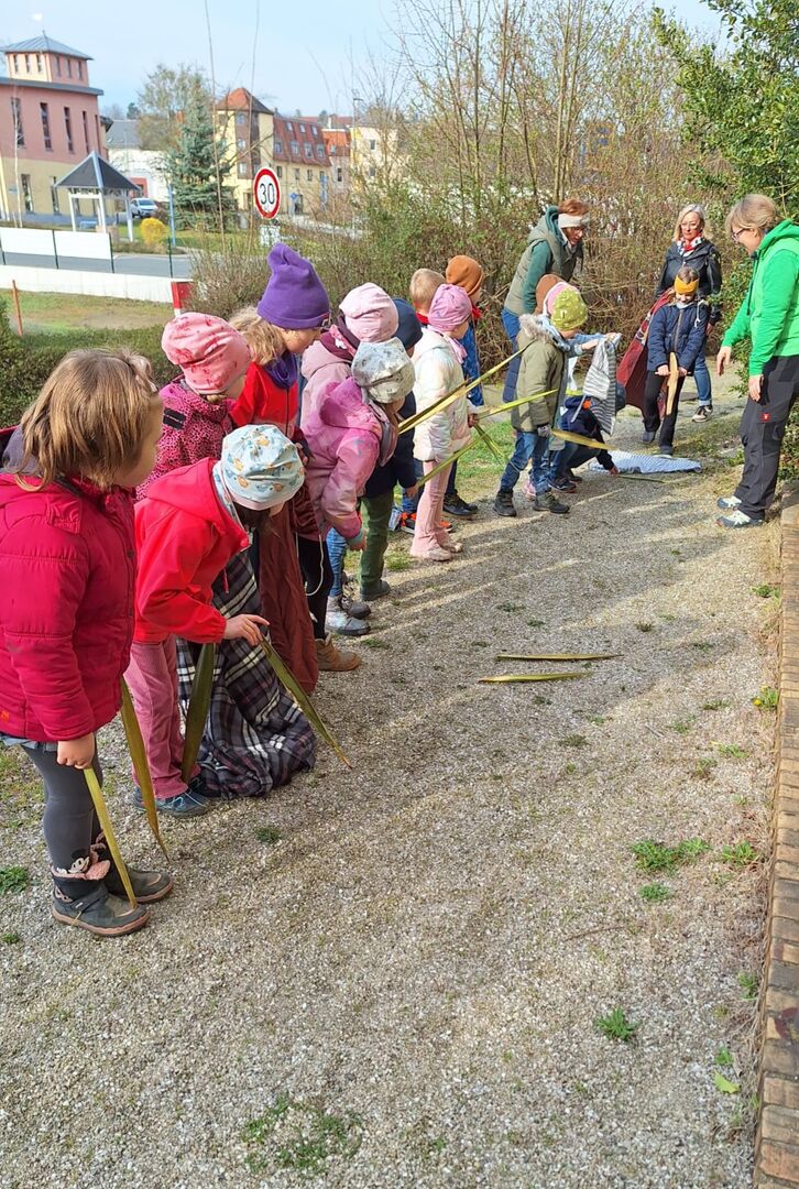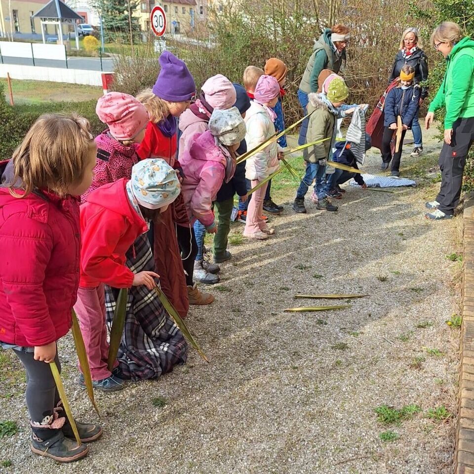 Am 02.April.2025 machten sich unsere "Wackelzähne" auf den Weg zur Johanniskirche in Crimmitschau und wurden dort schon von unserer Religionspädagogin Frau Anett Erler freudig erwartet. Die Kinder waren eingeladen, sich auf eine "Reise nach Jerusalem" zu begeben. Die Zeitreise durch die biblische Geschichte in Israel vor ca. 2000 Jahren begann schon vor dem Kirchengebäude.