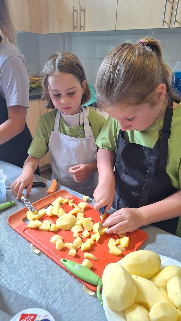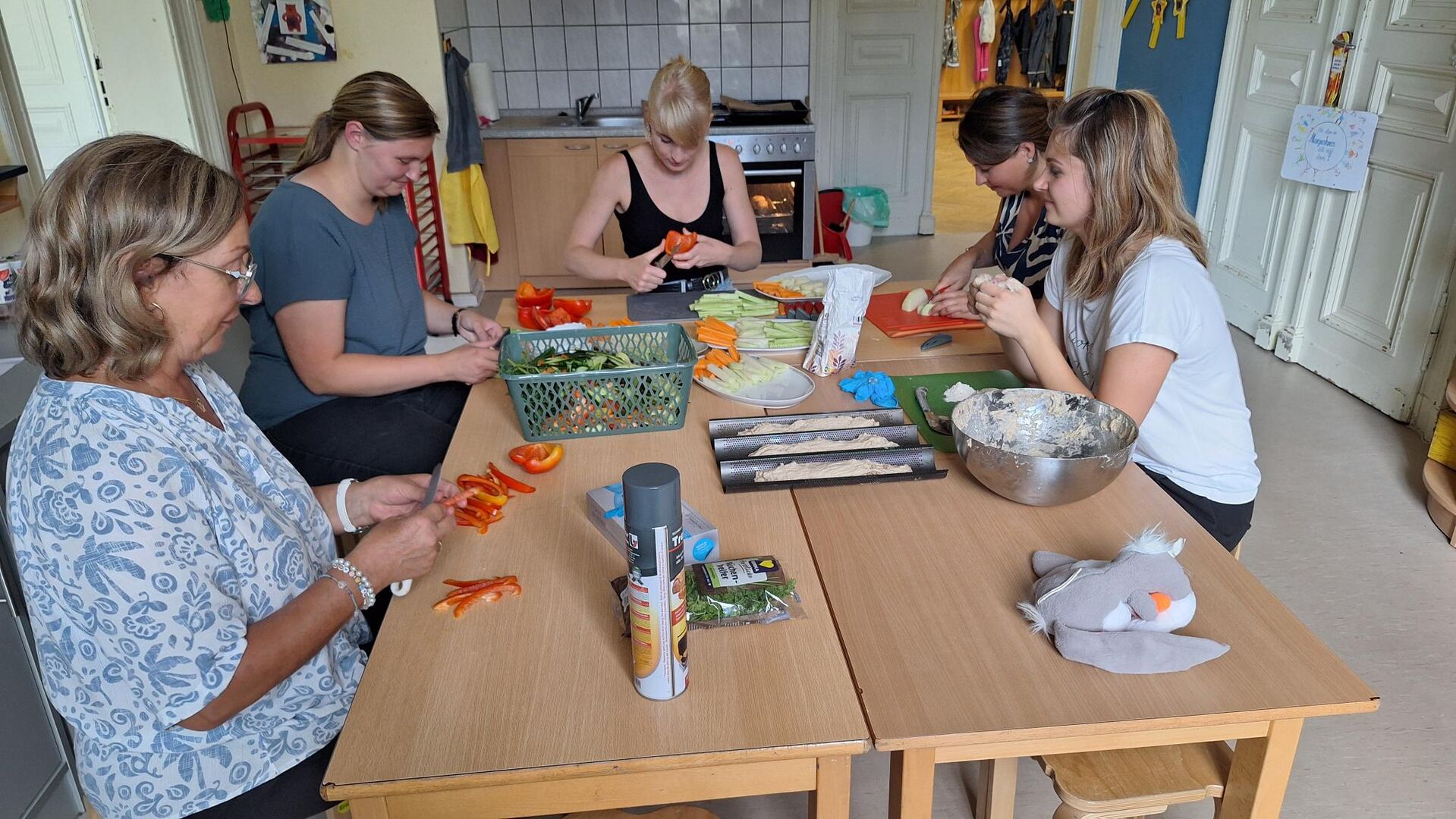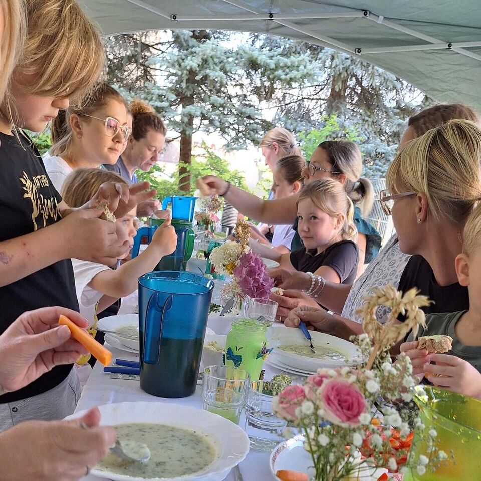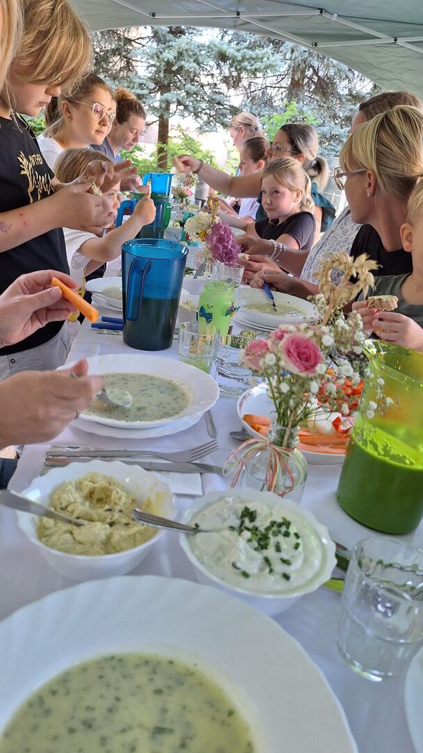 In vier Gruppen wurde geschnippelt, gekocht, gerührt, gebacken und eine wunderschöne Tafel mit zauberhaftem Tischschmuck gedeckt. In kürzester Zeit standen ein Flower- Power- Kräutersüppchen, Dinkelbaguettes, ganz viel Gemüse und mehrere Brotaufstriche und Dips sowie Gurkenlimonade und ein Smoothie auf dem Tisch.