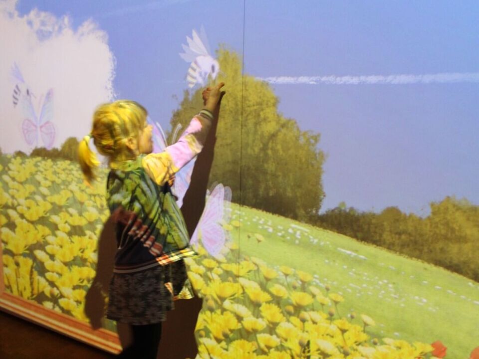 Ausmalbilder mit Bienen und Schmetterlingen luden die Kinder zum Ausmalen ein. Die bunten Insekten flatterten anschließend mit Hilfe eines Scanners zur Überraschung der Kinder über eine Blumenwiese an der Wand.