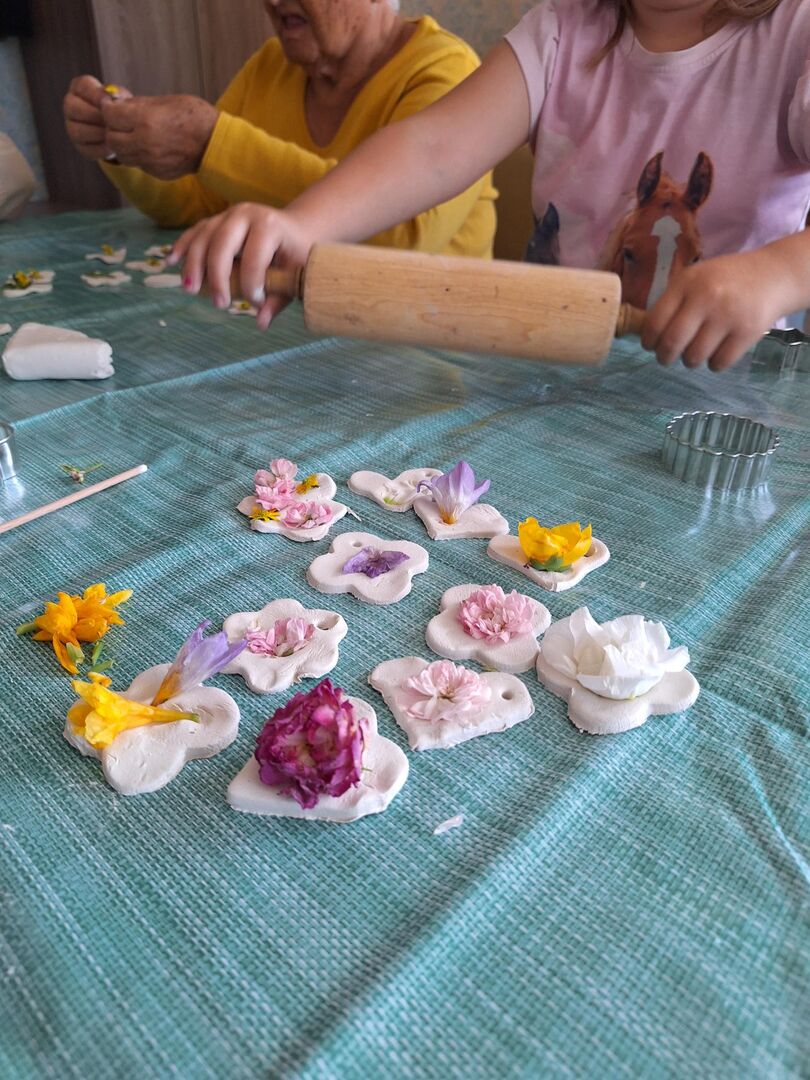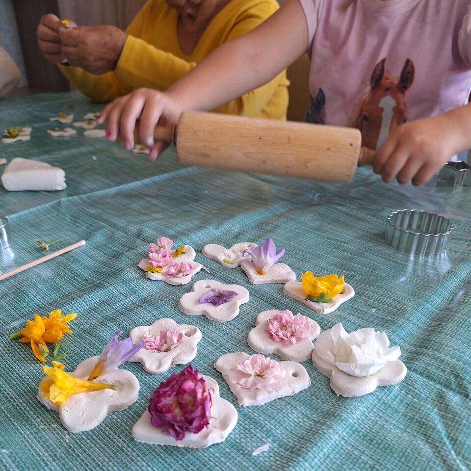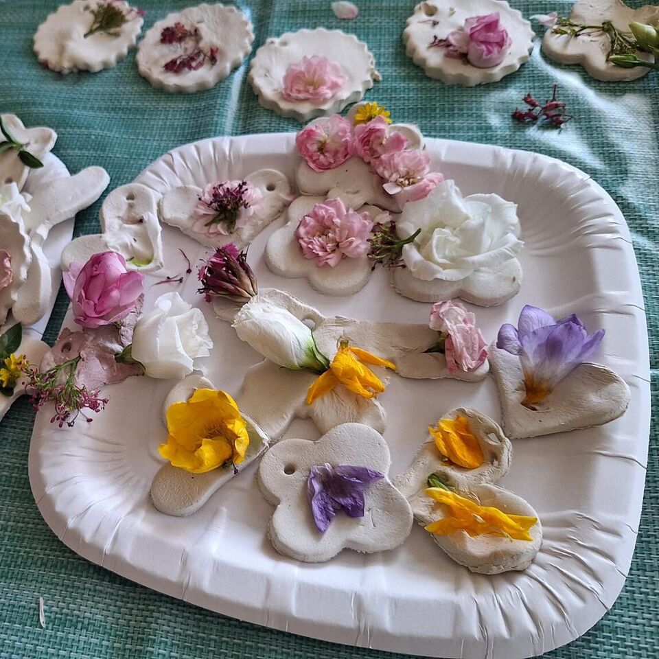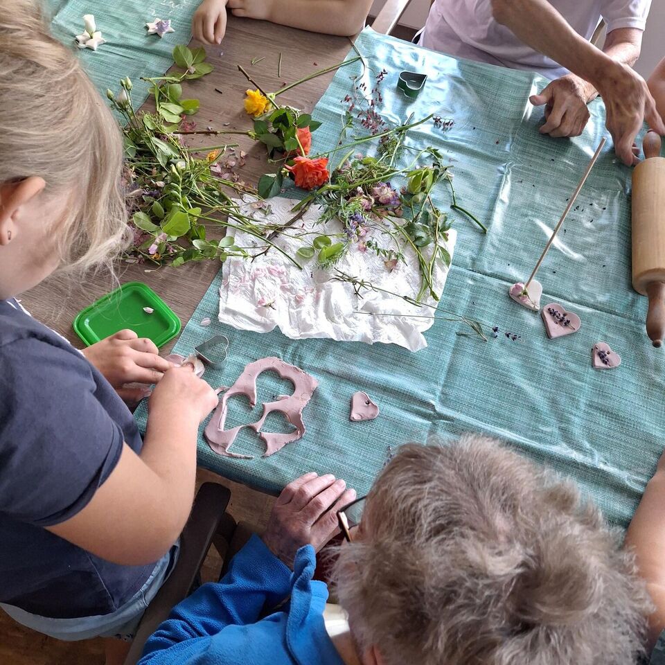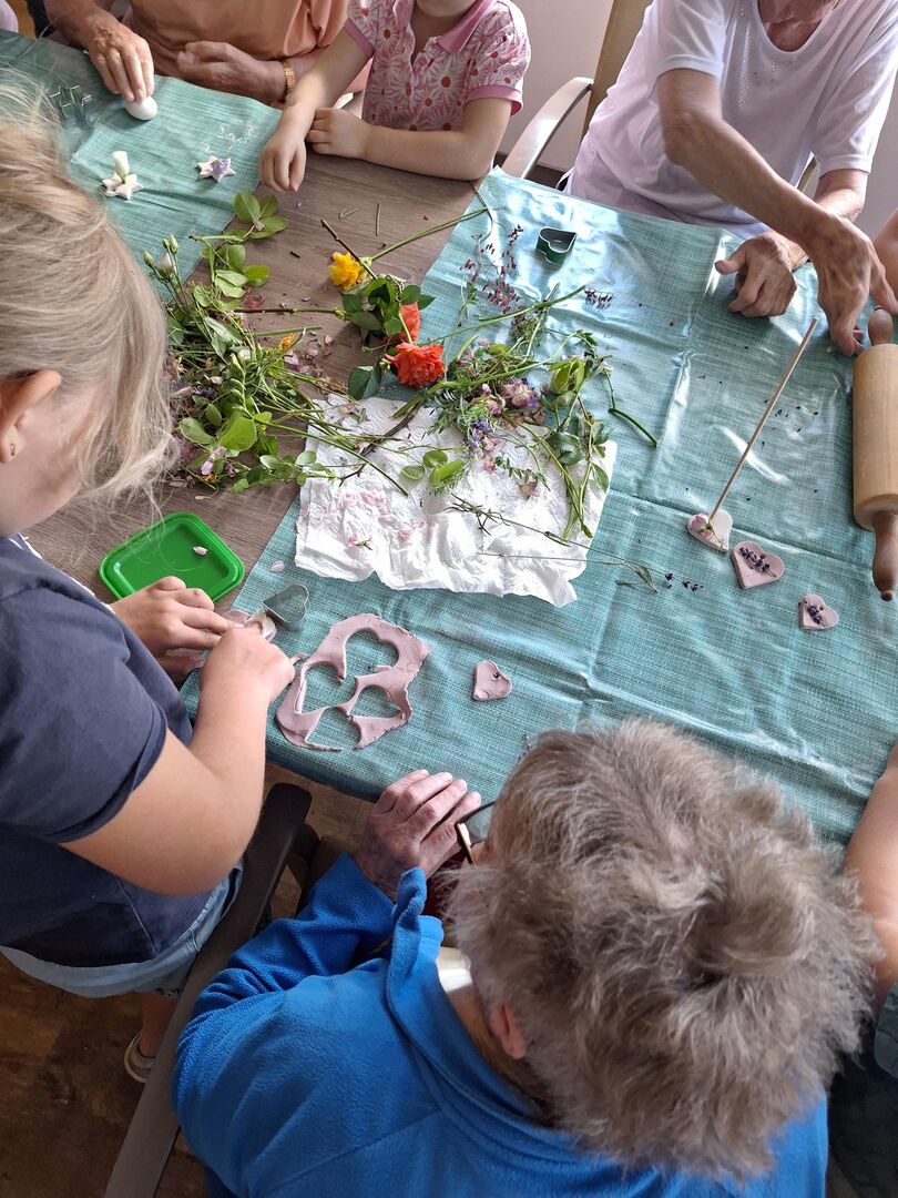 Aus lufttrocknender Modelliermasse und vielen bunten Sommerblüten entstanden unzählige Deko Anhänger, welche sicher einen schönen Platz im Gebäude des Pflegeheimes finden werden.