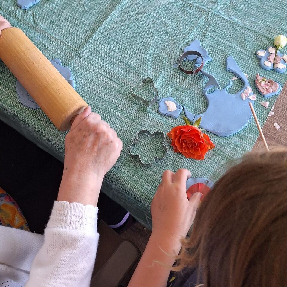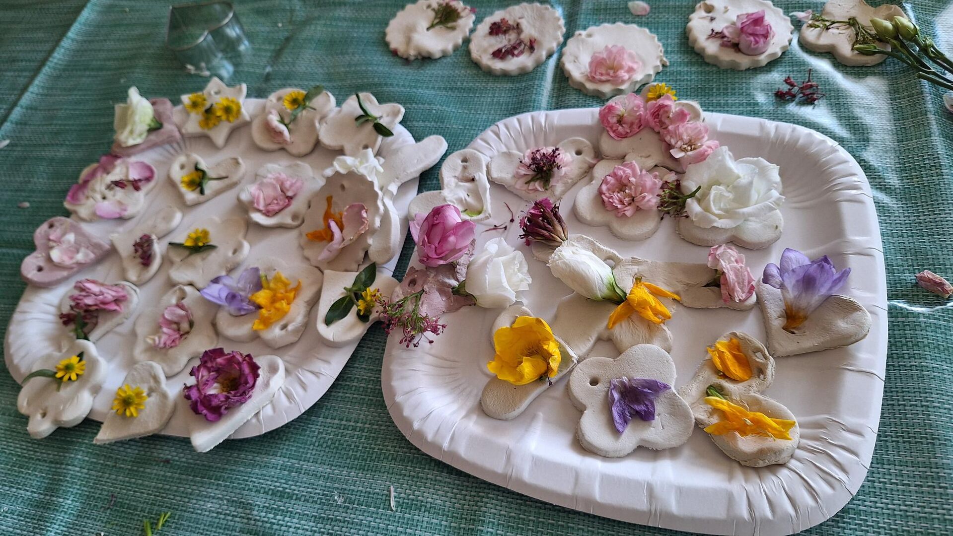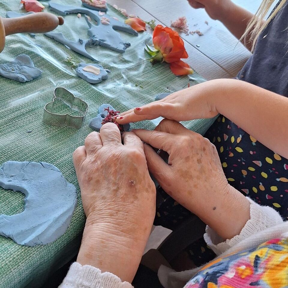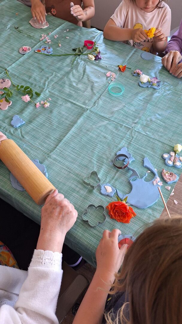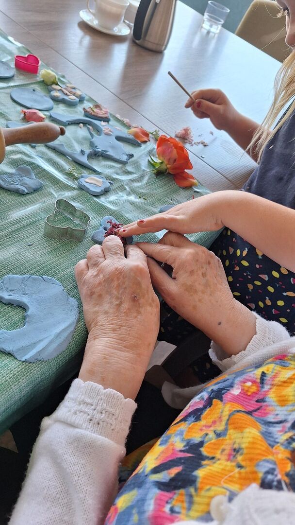 Aus lufttrocknender Modelliermasse und vielen bunten Sommerblüten entstanden unzählige Deko Anhänger, welche sicher einen schönen Platz im Gebäude des Pflegeheimes finden werden.