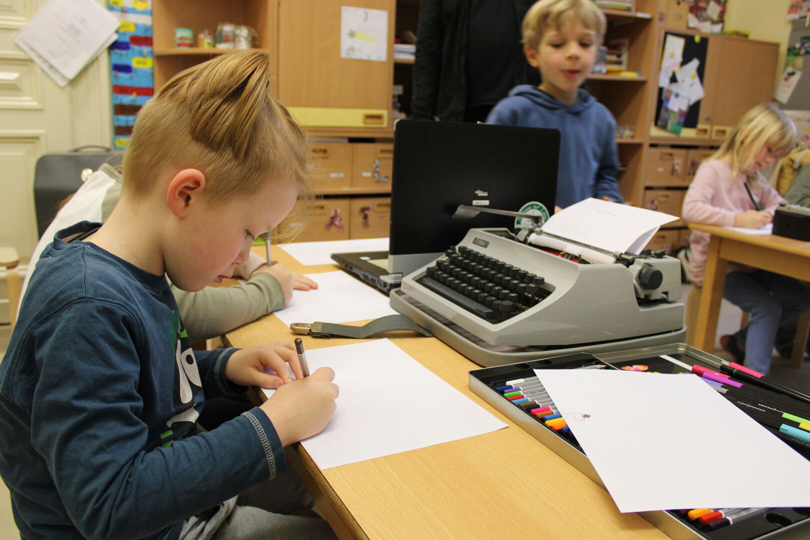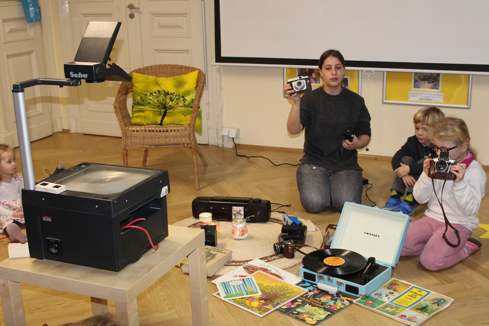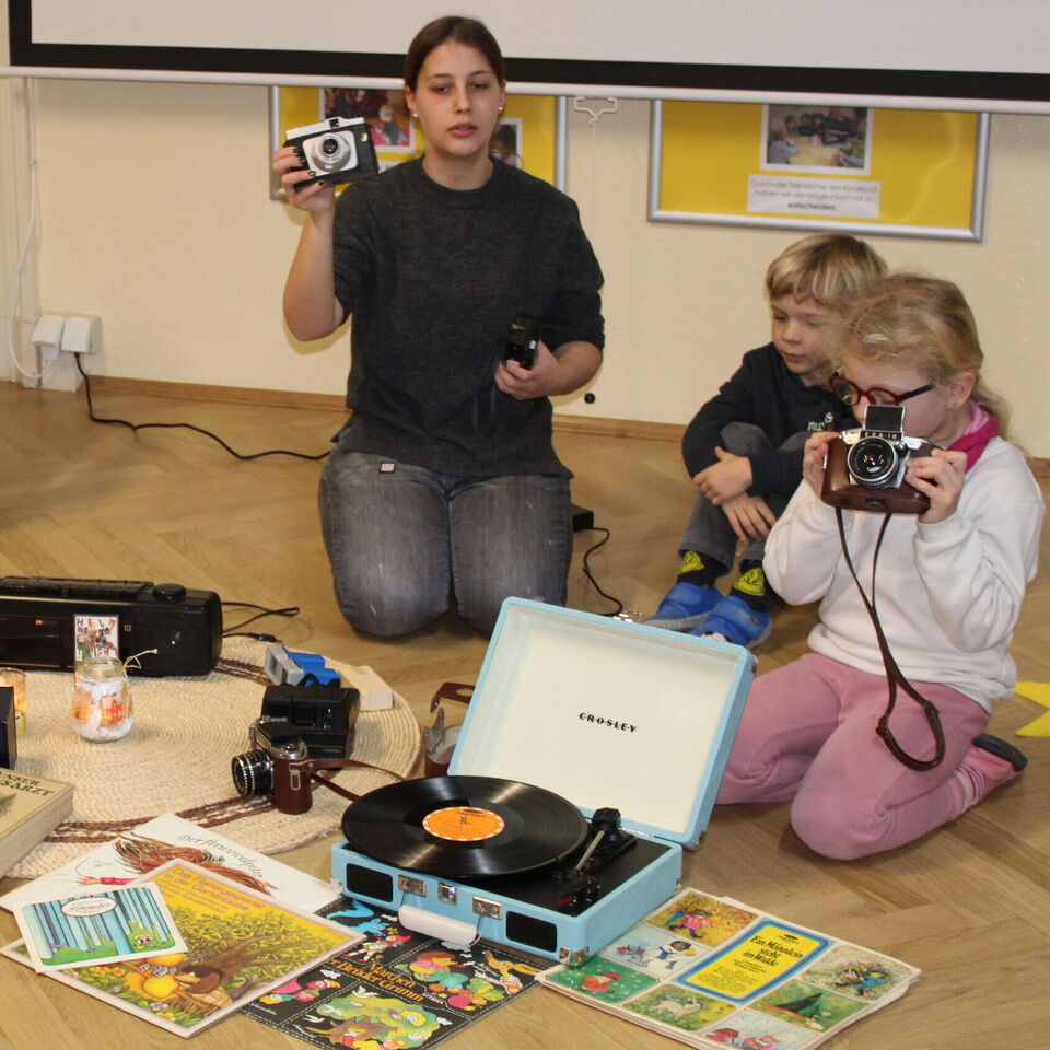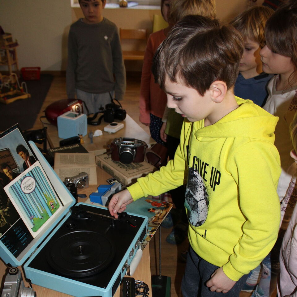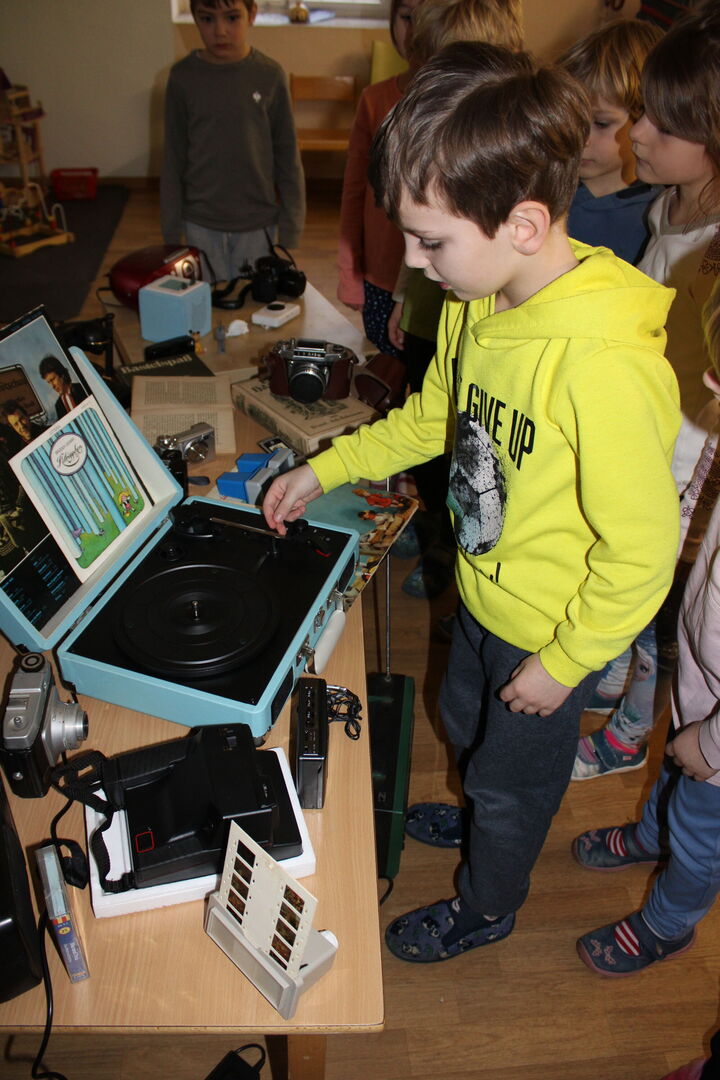 Eine alte große Kamera, Walkman, Plattenspieler inklusive alter Schallplatten, verschiedene Fotoapparate, ein Doppelkassettendeck oder auch eine alte Schreibmaschine versetzten die Erwachsenen in Staunen. Die Kinder entschieden sich, in ihrem Projekt Kassette und Toniebox, Schreibmaschine und Laptop sowie Fotoapparat und Handy in 3 Gruppen gegenüberzustellen.