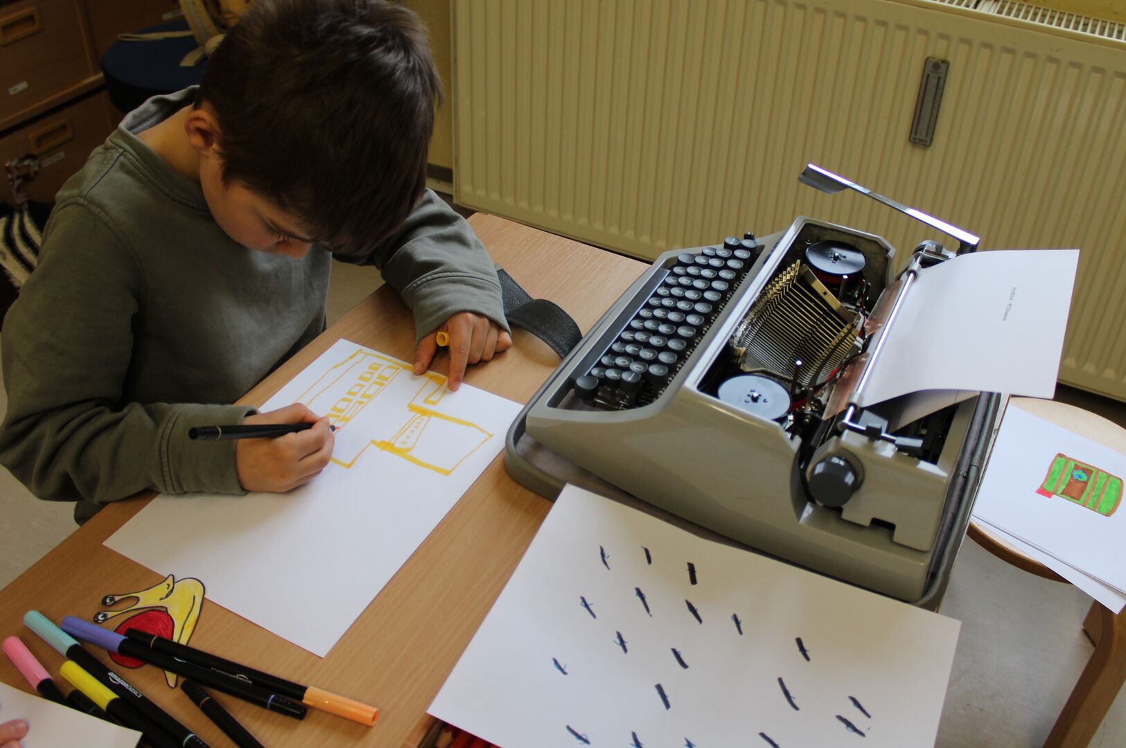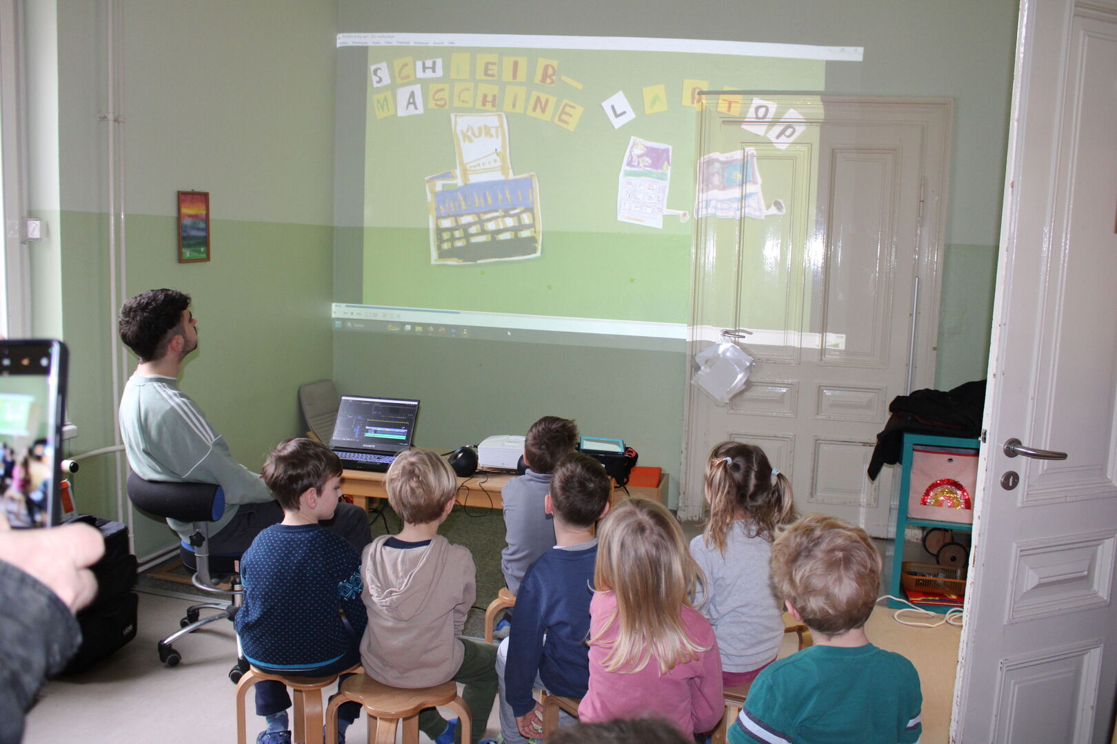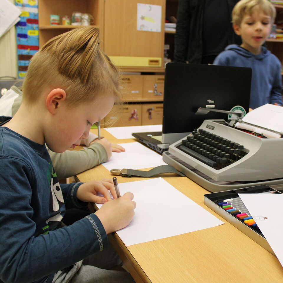 Für die Überschriften mussten noch kleine Buchstaben geschrieben werden, welche später auf Schnipseln in den Film "getanzt" kommen sollten. Besonders spannend war das Erstellen der großen Überschrift mittels Schreibmaschine und Tablet gleichzeitig. Die Kinder waren mit Freude bei der Sache und bewiesen ganz viel Geduld. Mit Musik und einem fröhlichen Kinderlachen wurden die Filme anschließend noch vertont und dann war es endlich soweit... Wir konnten unsere selbst erstellten Filme anschauen. Die Kinder und auch die Erwachsenen waren fasziniert und begeistert von jedem einzelnen Film.
