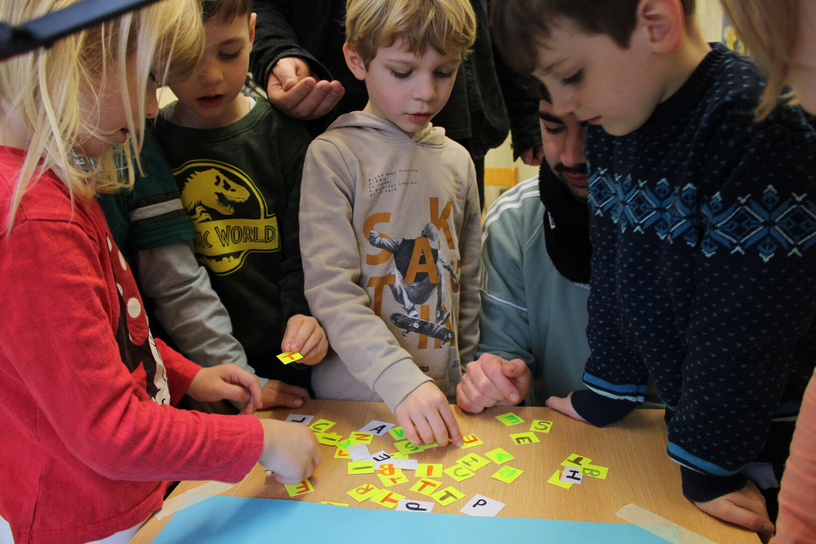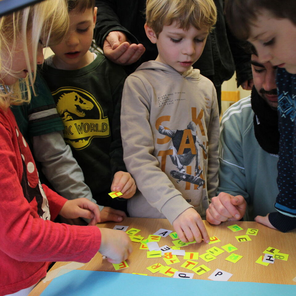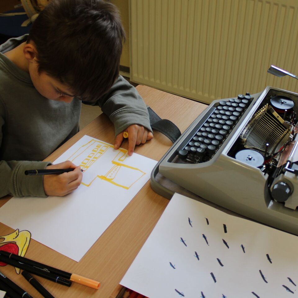 Für die Überschriften mussten noch kleine Buchstaben geschrieben werden, welche später auf Schnipseln in den Film "getanzt" kommen sollten. Besonders spannend war das Erstellen der großen Überschrift mittels Schreibmaschine und Tablet gleichzeitig. Die Kinder waren mit Freude bei der Sache und bewiesen ganz viel Geduld. Mit Musik und einem fröhlichen Kinderlachen wurden die Filme anschließend noch vertont und dann war es endlich soweit... Wir konnten unsere selbst erstellten Filme anschauen. Die Kinder und auch die Erwachsenen waren fasziniert und begeistert von jedem einzelnen Film.
