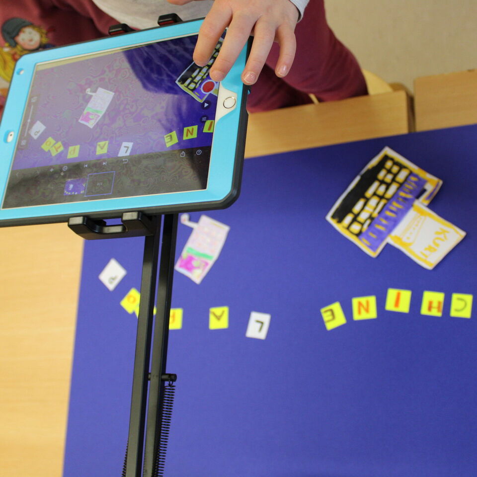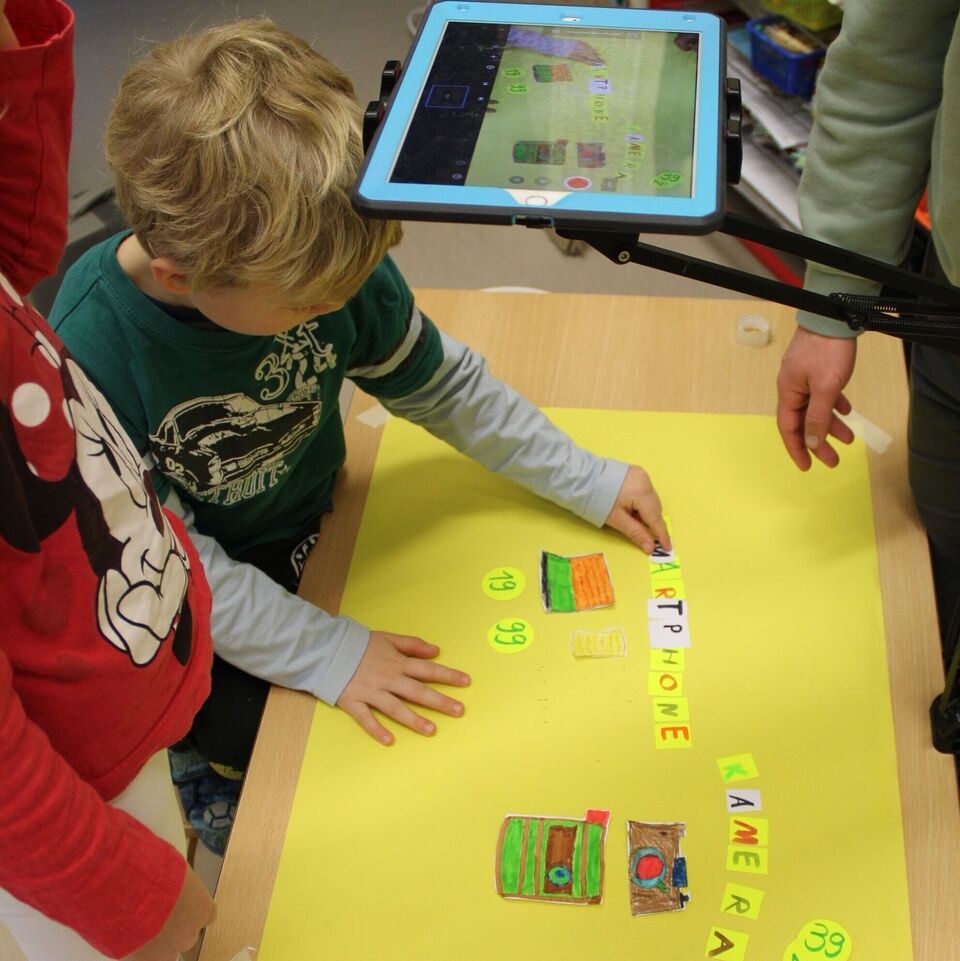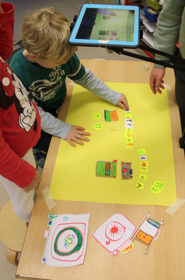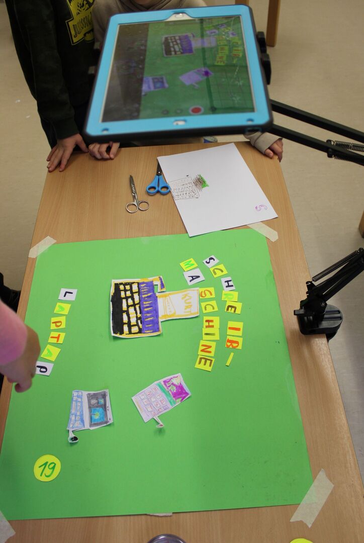 Der Film sollte in der "Stop-Motion-Technik" gedreht werden und an Hand von Stab- und Daumenkino bekamen die Kinder einen Eindruck, wie diese Technik funktioniert. Mit Buntstiften, Scheren und verschiedenen Papierarten brachten die Kinder die zu gegenüberstellenden Medien auf das Papier. Mit der Animationstechnik "Stop-Motion" wurde die Lage der ausgeschnittenen Teile auf einem Hintergrund millimeterweise verändert und unzählige Male mit dem Tablet fotografiert.