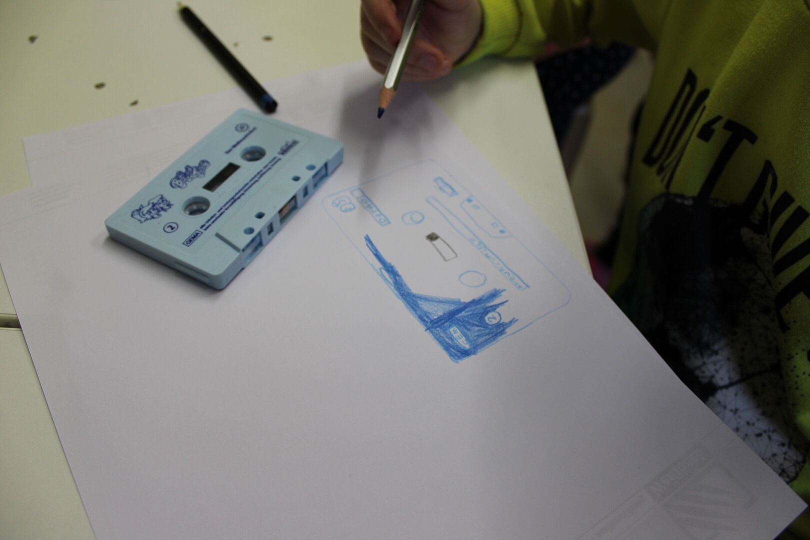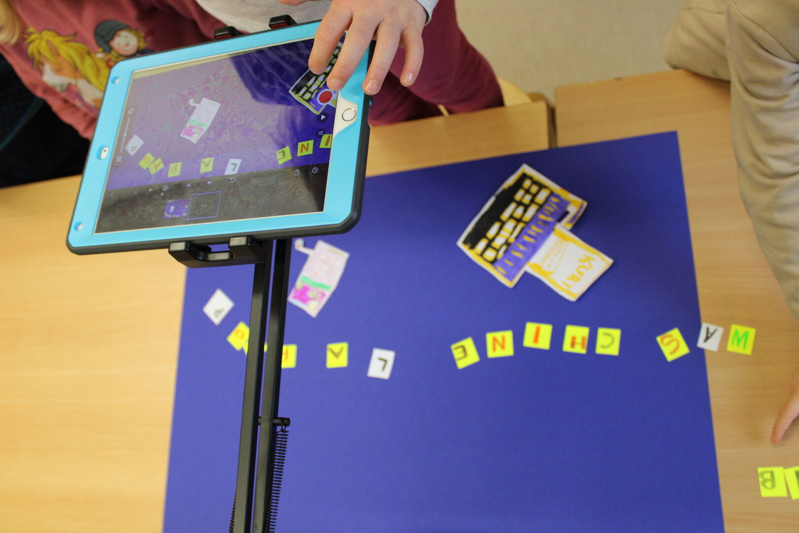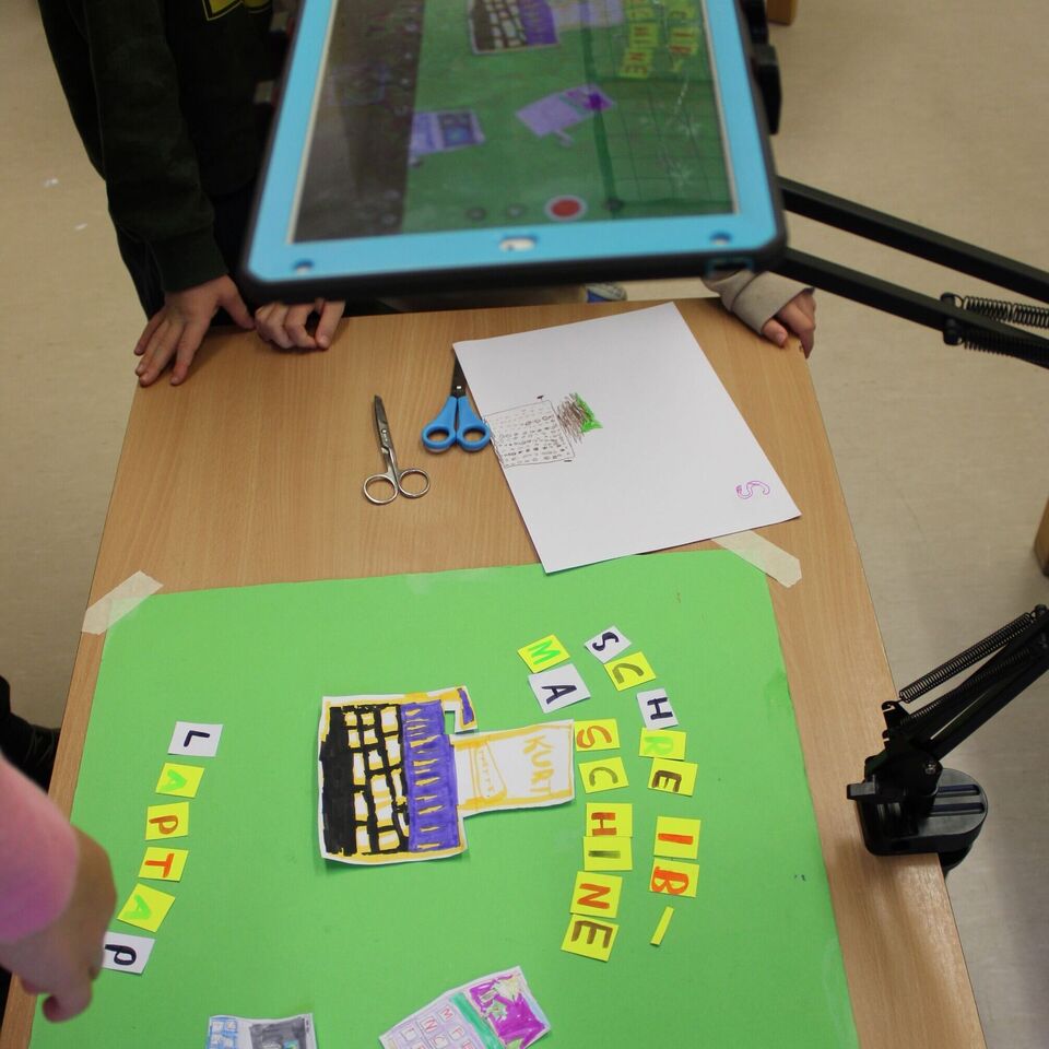 Der Film sollte in der "Stop-Motion-Technik" gedreht werden und an Hand von Stab- und Daumenkino bekamen die Kinder einen Eindruck, wie diese Technik funktioniert. Mit Buntstiften, Scheren und verschiedenen Papierarten brachten die Kinder die zu gegenüberstellenden Medien auf das Papier. Mit der Animationstechnik "Stop-Motion" wurde die Lage der ausgeschnittenen Teile auf einem Hintergrund millimeterweise verändert und unzählige Male mit dem Tablet fotografiert.