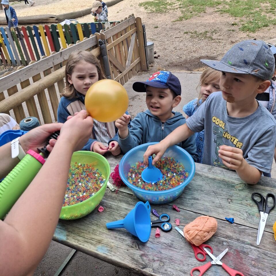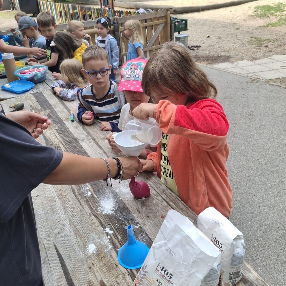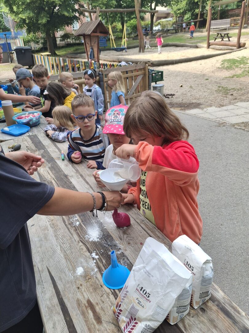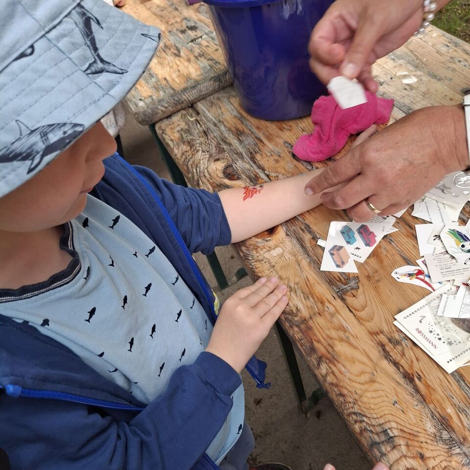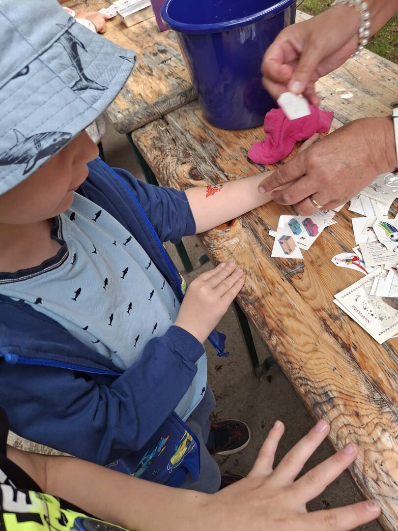 Anschließend warteten viele kleine Überraschungen im Garten auf unsere „Sterntaler“. Im Garten wurde es dann farbenfroh. Nicht nur die Arme wurden durch viele verschiedene Tattoos bunt, sondern auch die Haare wurden mit Haarkreide gefärbt. Am Kreativstand gestalteten unsere „Sterntaler“ Knetbälle aus Mehl und aus Wasserperlen. Auf unseren Fußballplatz, wurde es mi einen Parkour sportlich für unseren großen und kleinen „Sterntaler“.