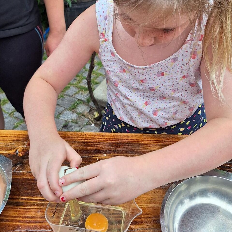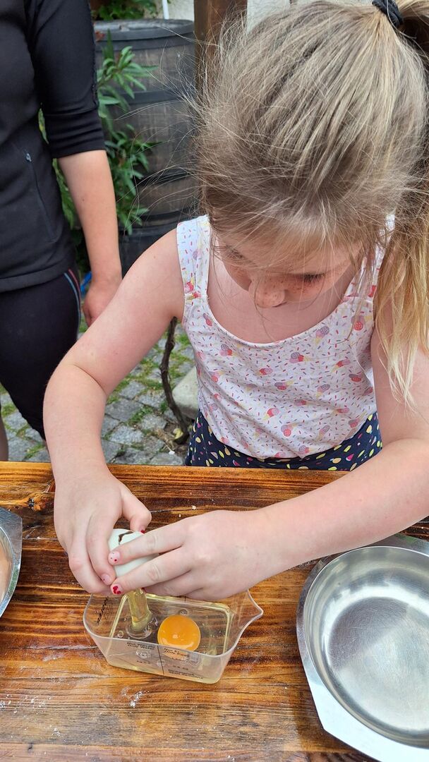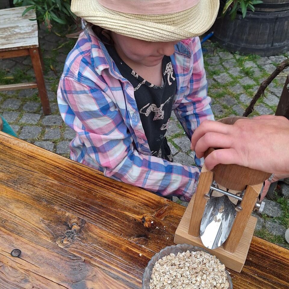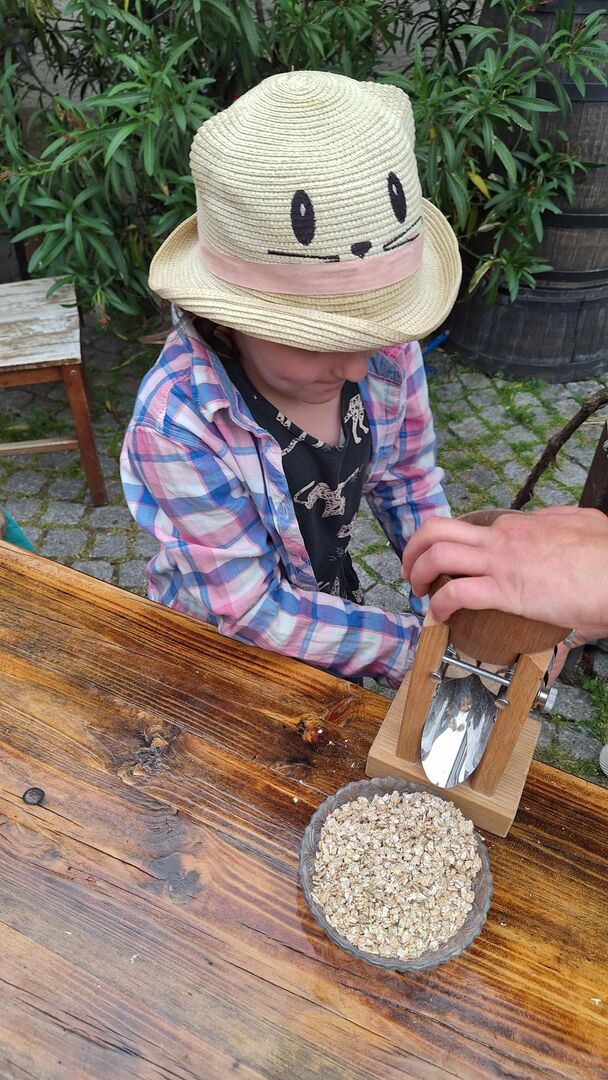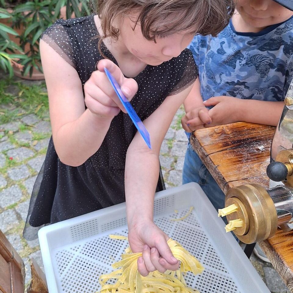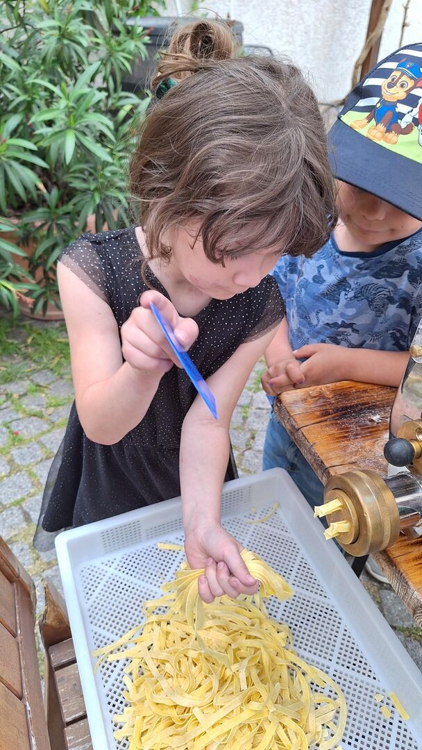 Mit einem Teil der vielen frischen Eier wollten sich die Kinder an der Nudelherstellung ausprobieren. Mittels einer Kornmühle erfuhren unsere "Wackelzähne", wie aus Weizenkorn Grieß entsteht. Grieß und Eier wurden in einer Nudelmaschine zu Teig verknetet und wie von Zauberhand kamen Nudeln aus der Maschine. Diese brauchten die Kinder nur noch abzuschneiden. Jedes Kind durfte ein kleines Tütchen der selbst gemachten Nudeln mit nach Hause nehmen.