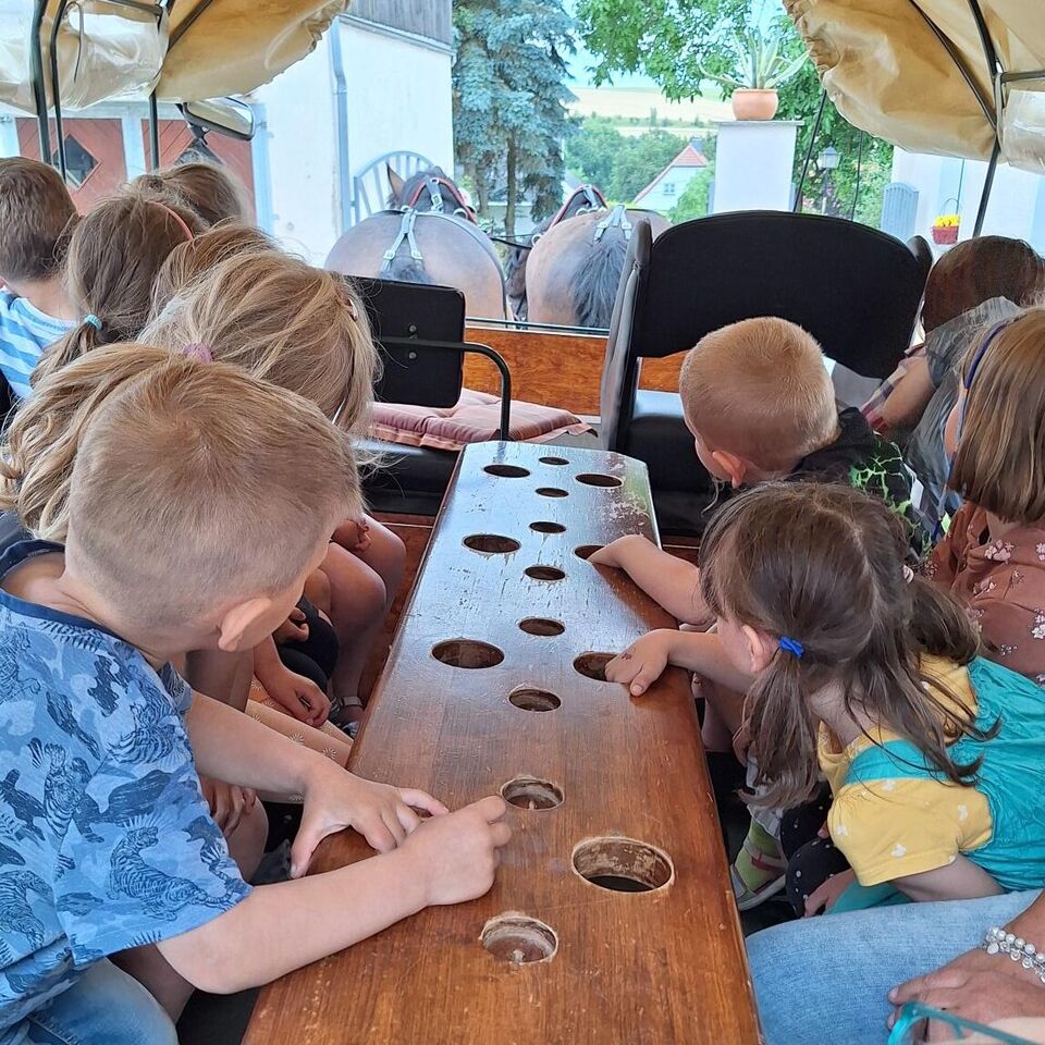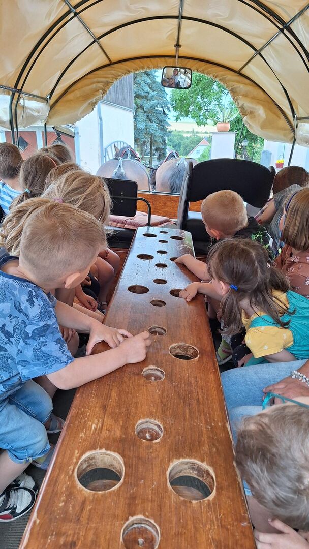 Auch zum Mittagessen gab es eine kleine Kostprobe mit Tomatensoße davon und diese wurde von allen Kindern als sehr lecker befunden Eine Kutschfahrt gab uns Gelegenheit, die nähere Umgebung ein wenig kennenzulernen. Dabei hatten die Pferde Rosalie und Fritz kräftig zu ziehen und die Kinder hatten als Passagiere natürlich ganz viel Freude.