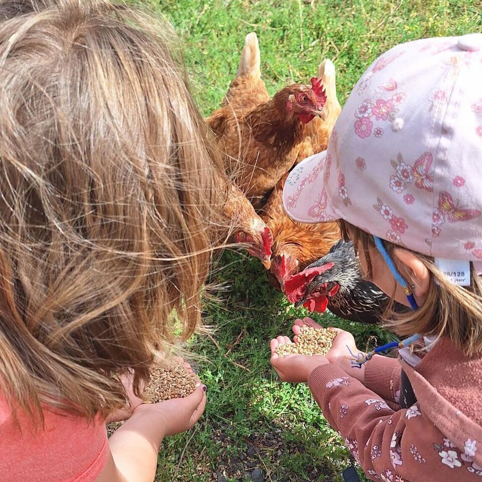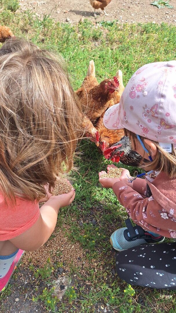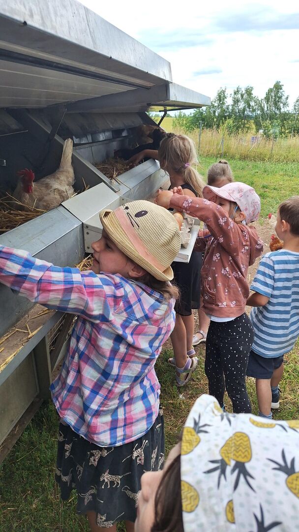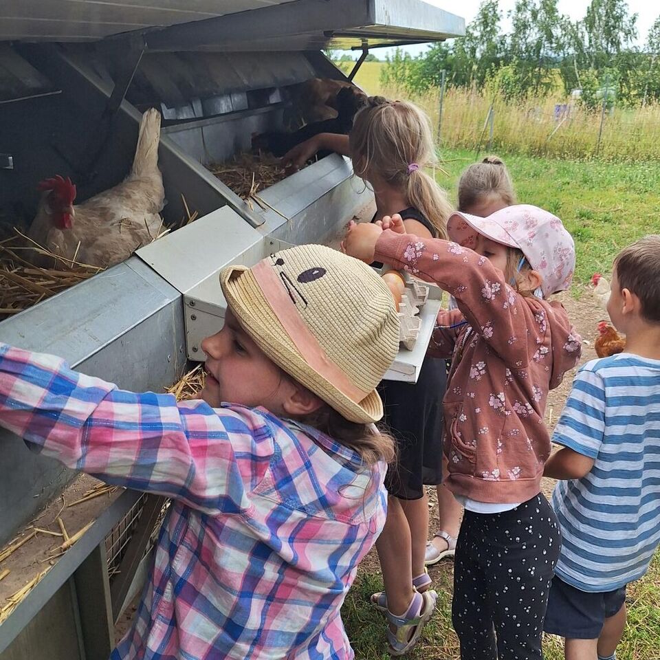 Anschließend ging es in Richtung Hühnermobil. Die Kinder fütterten die Hühner und versuchten Eier aus dem Hühnermobil zu "stibitzen".