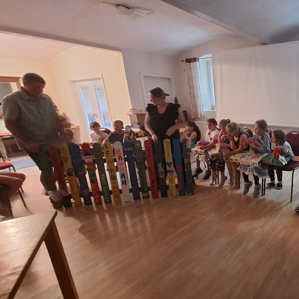 Bunte, individuell gestaltete Zaunslatten und ein Blaubeerstrauch, Geschenke der Familien unserer Vorschüler, werden uns zukünftig an die "Wackelzähne 2025" erinnern.