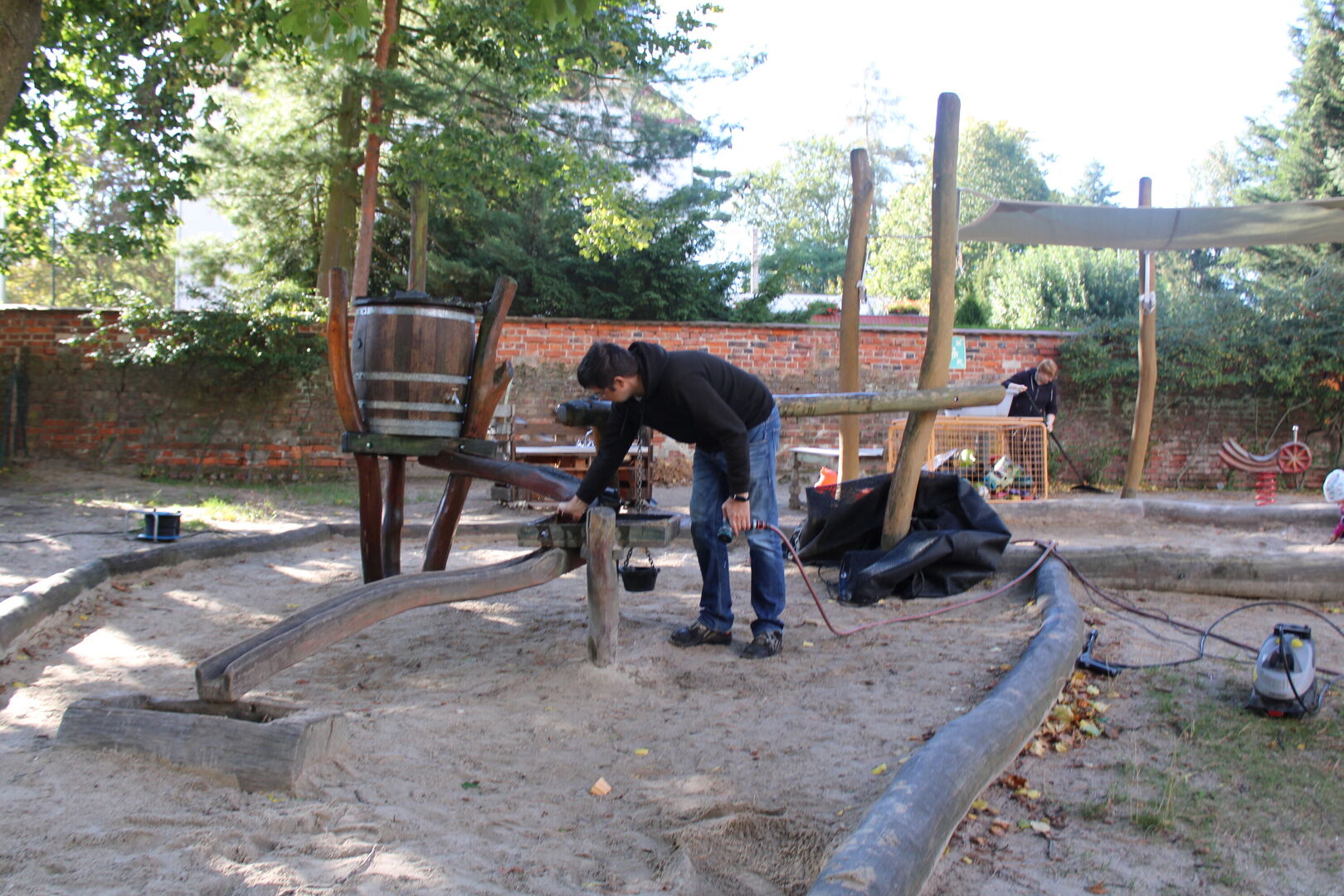Bei goldenem Herbstwetter hatten die Eltern neben Laubbesen und Schaufeln diesmal auch einen Kärcher im Gepäck. Unsere kleine und große Matschanlage warteten schon darauf vom Sand und Schlamm der vergangenen Matschsaison befreit zu werden, um dann ohne Verzögerung im nächsten Frühjahr wieder bespielt werden zu können.